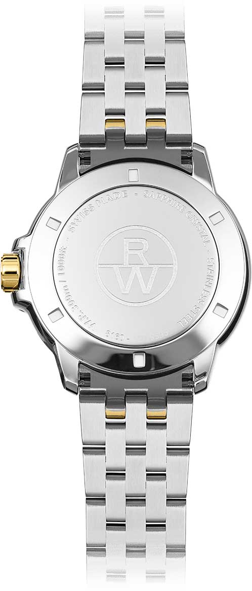 Модель оснащена фирменным безелемБезельВнешний ободок, закрепляющий стекло. В спортивных часах так называется поворотное кольцо с делениями на циферблате, выполняет роль таймера – замеряет отрезки времени на шкале. Неподвижный безель – элемент декора. Однонаправленно вращающийся безель на дайверских часах позволяет фиксировать моменты погружения и выныривания на поверхность. с шестью декоративными винтами и завинчивающейся заводной головкой с защитой и логотипом RW. Завинчивающаяся задняя крышка и стальной браслет с PVD-покрытиемPVDУльтратонкое покрытие наносится в технике вакуумного напыления, сочетает в себе нитрид титана особой прочности со слоем золота или оксида хрома. Несёт в себе декоративную или защитную функцию. на раскладной застёжкеРаскладная застёжкаТакой тип застёжки используется только на браслетах из металла. Она никогда не раскрывается полностью, происходит разделение на 2 и более частей. Раскладывающая застёжка снизит вероятность потери часов к минимуму. с двойной системой защиты добавляет уверенности в использовании.