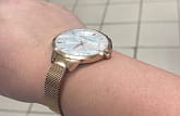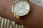 Аксессуар имеет fashion-направление, дизайном занимался Вольфганг Джонсон. Модель смотрится оригинально за счёт массивного корпуса в сочетании с тонким браслетом миланского плетения, они выполнены их нержавеющей стали 316L с цветным PVD-покрытиемPVDУльтратонкое покрытие наносится в технике вакуумного напыления, сочетает в себе нитрид титана особой прочности со слоем золота или оксида хрома. Несёт в себе декоративную или защитную функцию.. Циферблат декорирован сияющими цирконами. Прочное минеральное стекло отличается устойчивостью к царапинам.