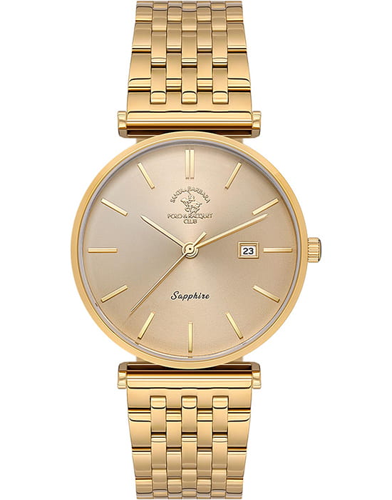 Santa Barbara Polo & Racquet Club — мужские наручные часы в элегантном минималистичном стиле, подчёркивающем статус и изысканность владельца. Корпус и браслет изготовлены из нержавеющей стали с прочным PVDPVDУльтратонкое покрытие наносится в технике вакуумного напыления, сочетает в себе нитрид титана особой прочности со слоем золота или оксида хрома. Несёт в себе декоративную или защитную функцию.-покрытием жёлтого золота, которое придаёт часам благородный оттенок и дополнительную стойкость к износу.