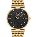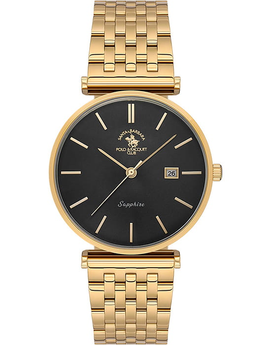 Santa Barbara Polo & Racquet Club — мужские наручные часы в элегантном минималистичном стиле, подчёркивающем статус и изысканность владельца. Корпус и браслет изготовлены из нержавеющей стали с прочным PVDPVDУльтратонкое покрытие наносится в технике вакуумного напыления, сочетает в себе нитрид титана особой прочности со слоем золота или оксида хрома. Несёт в себе декоративную или защитную функцию.-покрытием жёлтого золота, которое придаёт часам благородный оттенок и дополнительную стойкость к износу.