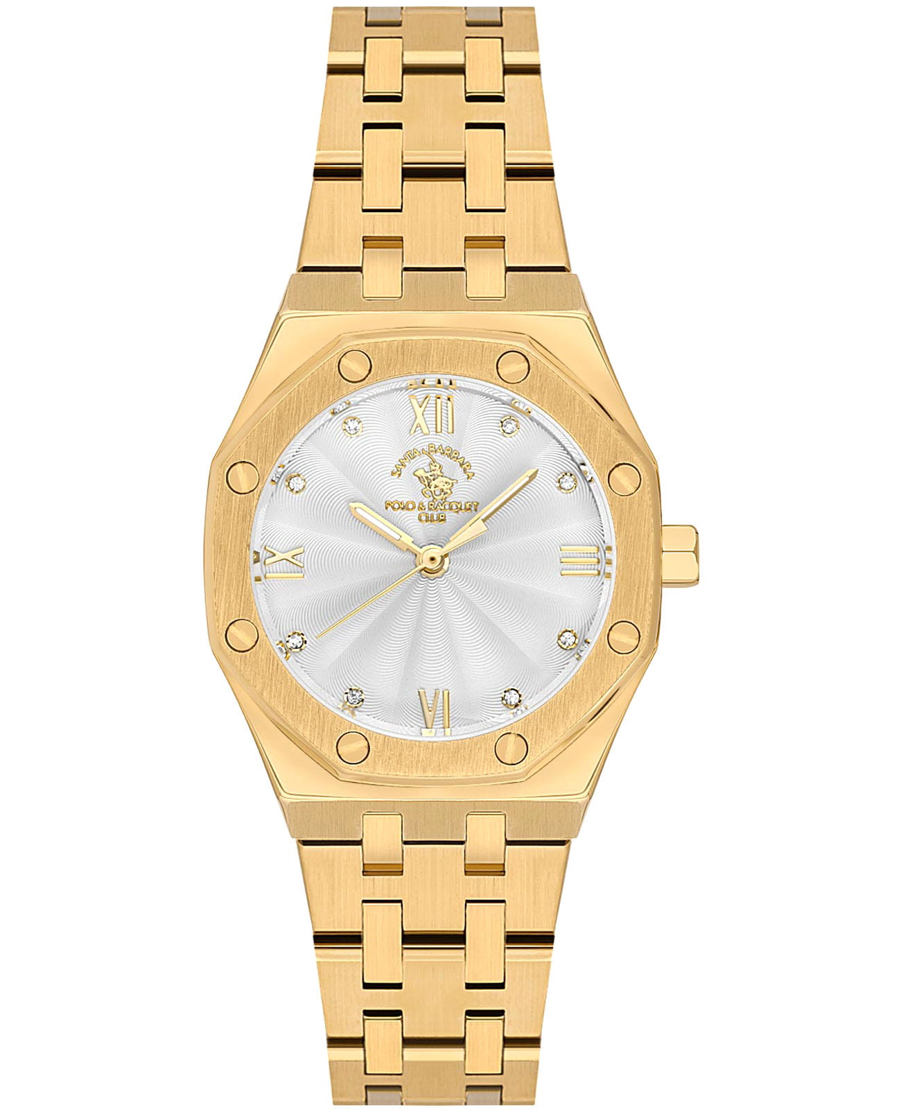 Женские кварцевые часы Santa Barbara Polo & Racquet Club SB.1.10602-2— это стильный аксессуар, подчеркивающий индивидуальность. Изысканный корпус диаметром 30 мм выполнен из нержавеющей стали 316L с IP-покрытиемIP-покрытиеМетод ионного напыления. Демонстрирует повышенную устойчивость к истиранию, окислению и химическим веществам. Под воздействием высокого давления и температуры около 1500°C молекулы металла надёжно соединяются с частицами корпуса часов. золотистого цвета. Накладные метки в виде точек, украшенных кристаллами и римских цифр. Стрелки с люминесцентным покрытиемЛюминесцентное покрытиеПозволяет считывать показания времени в темноте. Производители наносят на стрелки, часовые индексы, безель или поверхность циферблата светонакопительный состав, дающий холодное свечение., обеспечивающим хорошую читаемость в темноте. Защиту циферблата обеспечивает минеральное стеклоМинеральное стеклоМинеральное стекло представляет собой искусственно выращенный минерал кварца. Такое стекло отличается особой устойчивостью к повреждениям и царапинам. Уступает по некоторым качествам сапфировому стеклу., устойчивое к мелким механическим повреждениям. Часы оснащены надежным стальным браслетом с IP-покрытиемIP-покрытиеМетод ионного напыления. Демонстрирует повышенную устойчивость к истиранию, окислению и химическим веществам. Под воздействием высокого давления и температуры около 1500°C молекулы металла надёжно соединяются с частицами корпуса часов. на застёжке-бабочке с кнопкамиЗастёжка "бабочка"Такой вид застёжки дополняется предохранителями, помогающими избежать случайного раскрытия браслета. Обладают изящным исполнением. . Водонепроницаемость 50 м позволяет использовать часы в повседневных условиях. Идеальный выбор для тех, кто ценит элегантный дизайн и качество.