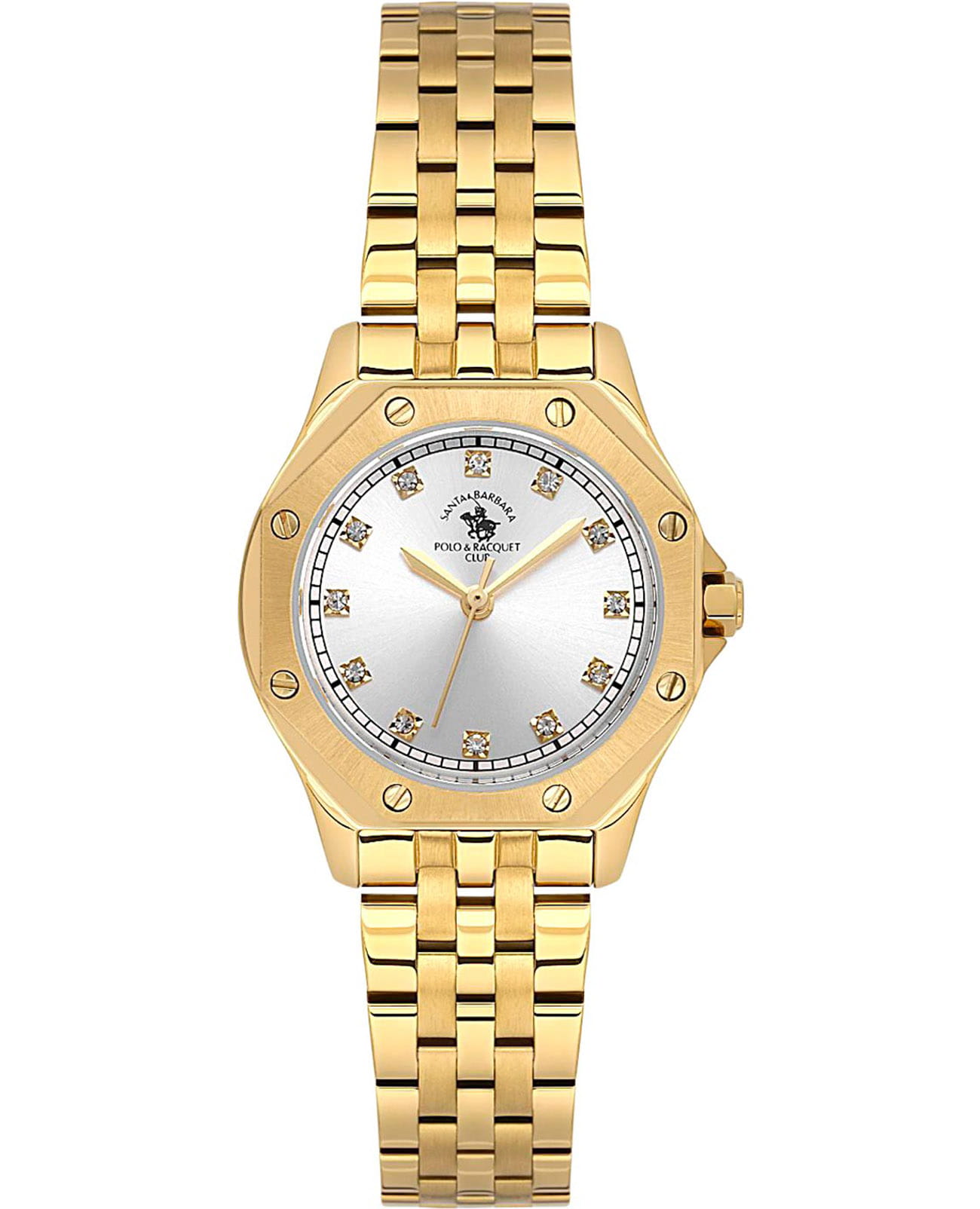 Женские кварцевые часы Santa Barbara Polo & Racquet Club — это изысканный и стильный аксессуар. Корпус диаметром 27 мм выполнен из стали 316L с IP-покрытиемIP-покрытиеМетод ионного напыления. Демонстрирует повышенную устойчивость к истиранию, окислению и химическим веществам. Под воздействием высокого давления и температуры около 1500°C молекулы металла надёжно соединяются с частицами корпуса часов.. БезельБезельВнешний ободок, закрепляющий стекло. В спортивных часах так называется поворотное кольцо с делениями на циферблате, выполняет роль таймера – замеряет отрезки времени на шкале. Неподвижный безель – элемент декора. Однонаправленно вращающийся безель на дайверских часах позволяет фиксировать моменты погружения и выныривания на поверхность. накладной, с матовой обработкой и декоративными болтами. Циферблат белого цвета выполнен по технологии Sunray («солнечные лучи») и оформлен точками, инкрустированными кристаллами, и мечевидными стрелками в стиле Sword. Циферблат защищён минеральным стекломМинеральное стеклоМинеральное стекло представляет собой искусственно выращенный минерал кварца. Такое стекло отличается особой устойчивостью к повреждениям и царапинам. Уступает по некоторым качествам сапфировому стеклу.. Механизм — японское кварцевое движение калибра Seiko TMI VJ21C1. Заводная головка выполнена в форме болта с защитой. Часы оснащены стальным браслетом с IP-покрытиемIP-покрытиеМетод ионного напыления. Демонстрирует повышенную устойчивость к истиранию, окислению и химическим веществам. Под воздействием высокого давления и температуры около 1500°C молекулы металла надёжно соединяются с частицами корпуса часов. на раскладной застёжкеРаскладная застёжкаТакой тип застёжки используется только на браслетах из металла. Она никогда не раскрывается полностью, происходит разделение на 2 и более частей. Раскладывающая застёжка снизит вероятность потери часов к минимуму.. Водонепроницаемость 50 м позволяет использовать часы в повседневных условиях. Идеальный выбор для тех, кто ценит американское качество и современный дизайн.