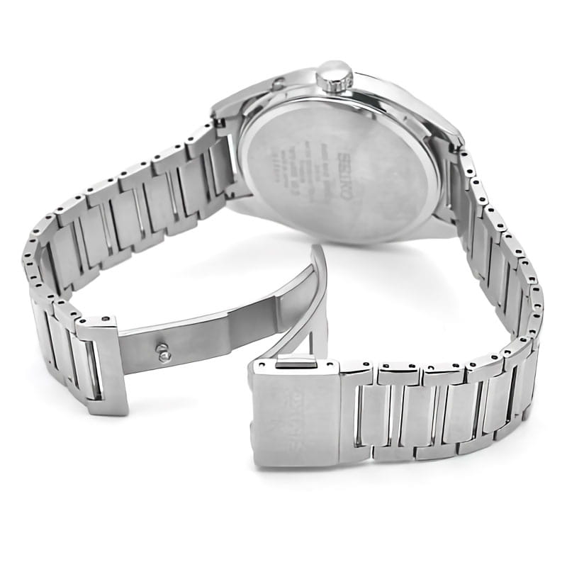 Мужские кварцевые часы Seiko — это высокотехнологичный аксессуар с солнечным питанием и радиосинхронизацией. Корпус размером 39 мм и толщиной 9,6 мм выполнен из гипоаллергенного титана. Циферблат синего цвета оформлен индексами и стрелками. Окошко даты расположено в положении 3 часов. Циферблат защищён выпуклым сапфировым стекломСапфировое стеклоПрочный и надёжный материал из кристалла сапфира синтетического происхождения, характеризующийся особой твёрдостью и устойчивостью к царапинам и повреждениям. с антибликовым покрытиемАнтибликовое покрытиеСлой оксида металла в 0,13-0,3 микрон, благодаря которому стекло часов не бликует и не отражает свет. Антибликовое покрытие уменьшает отражение света в 10 раз, обеспечивая отличную читаемость показателей циферблата. для максимальной прозрачности. Механизм — кварцевый с технологией Tough SolarTough SolarТехнология основана на подзарядке аккумулятора от источника солнечного света, специальная панель улавливает солнечные лучи и преобразует их в энергию для работы часов. Достаточно пары минут нахождения на солнце для функционирования часов в течении суток., обеспечивающей работу до 9 месяцев в обычном режиме и до 2 лет в режиме энергосбережения. Часы поддерживают автоматическую радиокоррекцию времени, имеют функцию вечного календаряВечный календарьКлассическое часовое усложнение, представляющее собой календарь, рассчитанный на несколько лет вперёд (стандартно – до 2099 года). Определяет текущую дату, день недели, месяц. (до 2100 года) и устойчивы к магнитным полям. Часы оснащены титановым браслетом с раскладной застёжкойРаскладная застёжкаТакой тип застёжки используется только на браслетах из металла. Она никогда не раскрывается полностью, происходит разделение на 2 и более частей. Раскладывающая застёжка снизит вероятность потери часов к минимуму.. Водонепроницаемость 100 м позволяет использовать часы для плавания и повседневного ношения. Идеальный выбор для тех, кто ценит точность, лёгкость и передовые технологии.