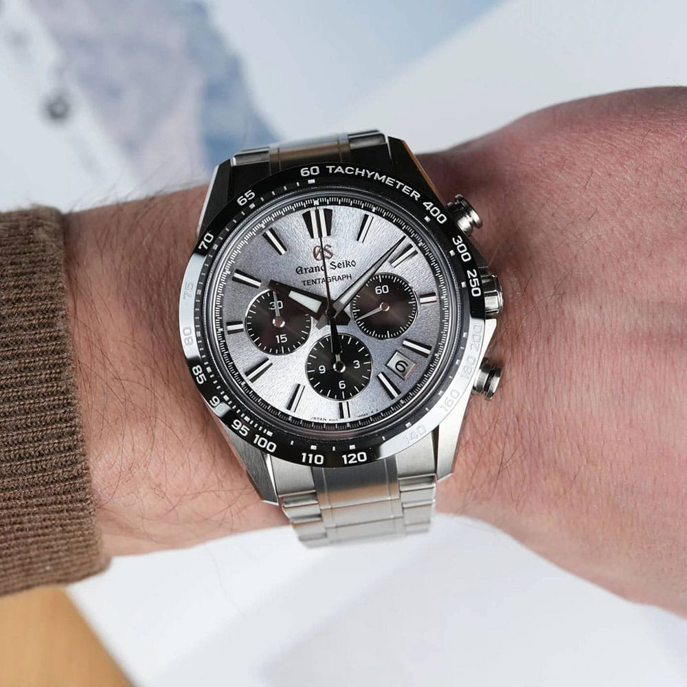 Модель SLGC007G из коллекции Grand Seiko Evolution 9 — это высокоточный дайверский хронографХронографФункция позволяет измерять отрезки времени с особой точностью: часы, минуты, секунды. Верным признаком хронографа является наличие на циферблате 3 дополнительных окошек-счётчиков. с секундомеромСекундомерСекундоме́р — прибор, способный измерять интервалы времени с точностью до долей секунды., сочетающий в себе передовые технологии и японскую эстетику. Корпус и браслет выполнены из титанового сплава Brilliant Hard Titanium, обеспечивая лёгкость и устойчивость к коррозии. Циферблат с матовой отделкой и крупными метками покрытыми люминесцентным покрытиемЛюминесцентное покрытиеПозволяет считывать показания времени в темноте. Производители наносят на стрелки, часовые индексы, безель или поверхность циферблата светонакопительный состав, дающий холодное свечение. гарантирует отличную читаемость в любых условиях. Часы оснащены автоматическим механизмом 9SC5. Диаметр корпуса составляет 43.2 мм, толщина 15.3 мм. Циферблат защищён сапфировым стекломСапфировое стеклоПрочный и надёжный материал из кристалла сапфира синтетического происхождения, характеризующийся особой твёрдостью и устойчивостью к царапинам и повреждениям. с антибликовым покрытиемАнтибликовое покрытиеСлой оксида металла в 0,13-0,3 микрон, благодаря которому стекло часов не бликует и не отражает свет. Антибликовое покрытие уменьшает отражение света в 10 раз, обеспечивая отличную читаемость показателей циферблата. на внутренней стороне. Установлена раскладная застёжка с фиксаторомРаскладная застёжкаТакой тип застёжки используется только на браслетах из металла. Она никогда не раскрывается полностью, происходит разделение на 2 и более частей. Раскладывающая застёжка снизит вероятность потери часов к минимуму. обеспечивает комфортное ношение. Шкала тахиметраТахиметрРазмеченная шкала, располагается на ободке или безеле часов. Тахиметр позволяет рассчитать скорость на определённом участке пути, расстояние измеряется в километрах или милях. на керамическом безелеБезельВнешний ободок, закрепляющий стекло. В спортивных часах так называется поворотное кольцо с делениями на циферблате, выполняет роль таймера – замеряет отрезки времени на шкале. Неподвижный безель – элемент декора. Однонаправленно вращающийся безель на дайверских часах позволяет фиксировать моменты погружения и выныривания на поверхность.. Модель обладает водонепроницаемостью до 100 метров идеальным выбором для профессиональных дайверов и ценителей надёжных часов.