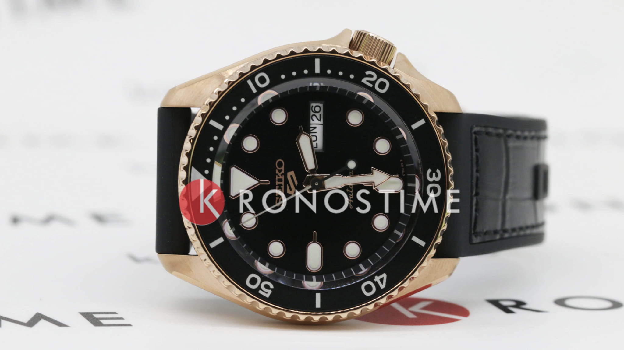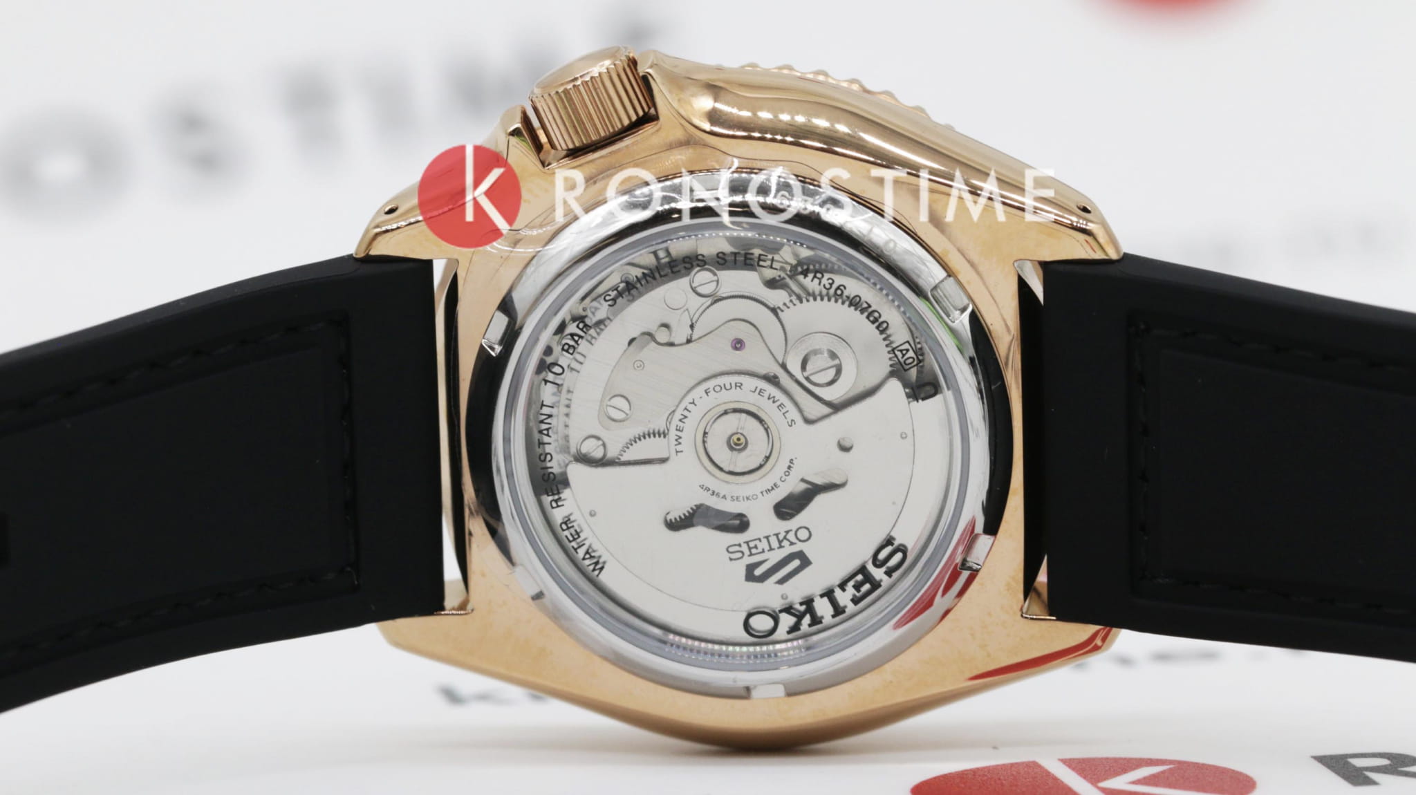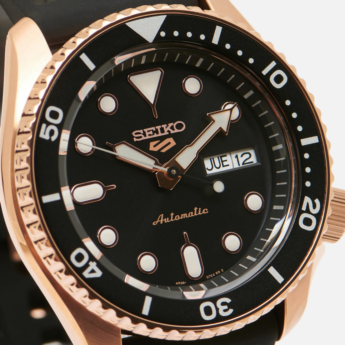 Часы Seiko 5 Sports SRPD76K1 сочетают в себе элегантный дизайн и надёжность, характерные для японского часового мастерства. Корпус диаметром 42,5 мм выполнен из нержавеющей стали с PVD-покрытиемPVDУльтратонкое покрытие наносится в технике вакуумного напыления, сочетает в себе нитрид титана особой прочности со слоем золота или оксида хрома. Несёт в себе декоративную или защитную функцию. розового золота, придающим часам утончённый вид. Чёрный циферблат защищён минеральным стекломМинеральное стеклоМинеральное стекло представляет собой искусственно выращенный минерал кварца. Такое стекло отличается особой устойчивостью к повреждениям и царапинам. Уступает по некоторым качествам сапфировому стеклу. с повышенной прочностью.