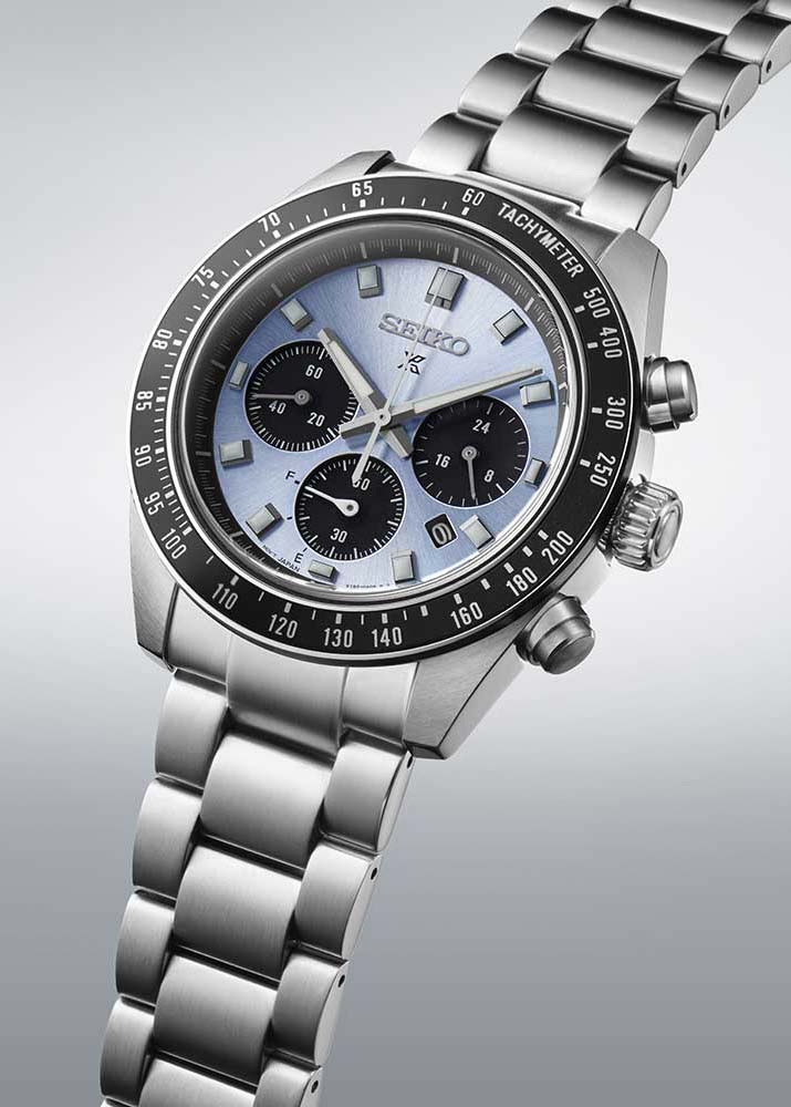 Модель Seiko SSC935P1 из коллекции Prospex Speedtimer — это спортивный солнечный хронограф с выразительным дизайном и высокой функциональностью. Корпус диаметром 41,4 мм выполнен из нержавеющей стали и оснащён завинчивающейся задней крышкой и заводной головкой, обеспечивая водозащиту до 100 метров. Фиксированный алюминиевый тахиметрический безельТахиметрРазмеченная шкала, располагается на ободке или безеле часов. Тахиметр позволяет рассчитать скорость на определённом участке пути, расстояние измеряется в километрах или милях. позволяет производить измерения скорости. Циферблат насыщенного голубого оттенка с солнечным финишем дополнен тремя чёрными счётчиками: 24-часовым, малой секундной стрелкой и хронографом на 60 минут. Стрелки и индексы покрыты люминесцентным покрытиемЛюминесцентное покрытиеПозволяет считывать показания времени в темноте. Производители наносят на стрелки, часовые индексы, безель или поверхность циферблата светонакопительный состав, дающий холодное свечение. LumiBrite для превосходной видимости в тёмное время суток. Защиту циферблата обеспечивает выпуклое сапфировое стеклоСапфировое стеклоПрочный и надёжный материал из кристалла сапфира синтетического происхождения, характеризующийся особой твёрдостью и устойчивостью к царапинам и повреждениям. с внутренним антибликовым покрытиемАнтибликовое покрытиеСлой оксида металла в 0,13-0,3 микрон, благодаря которому стекло часов не бликует и не отражает свет. Антибликовое покрытие уменьшает отражение света в 10 раз, обеспечивая отличную читаемость показателей циферблата., устойчивое к царапинам и бликам. Внутри установлен солнечный кварцевый калибр V192 с функциями хронографаХронографФункция позволяет измерять отрезки времени с особой точностью: часы, минуты, секунды. Верным признаком хронографа является наличие на циферблате 3 дополнительных окошек-счётчиков., индикацией 24 часов, даты и запаса хода. Полного заряда хватает до 6 месяцев автономной работы. Браслет из нержавеющей стали надёжно фиксируется при помощи раскладной застёжкиРаскладная застёжкаТакой тип застёжки используется только на браслетах из металла. Она никогда не раскрывается полностью, происходит разделение на 2 и более частей. Раскладывающая застёжка снизит вероятность потери часов к минимуму. с кнопками.