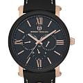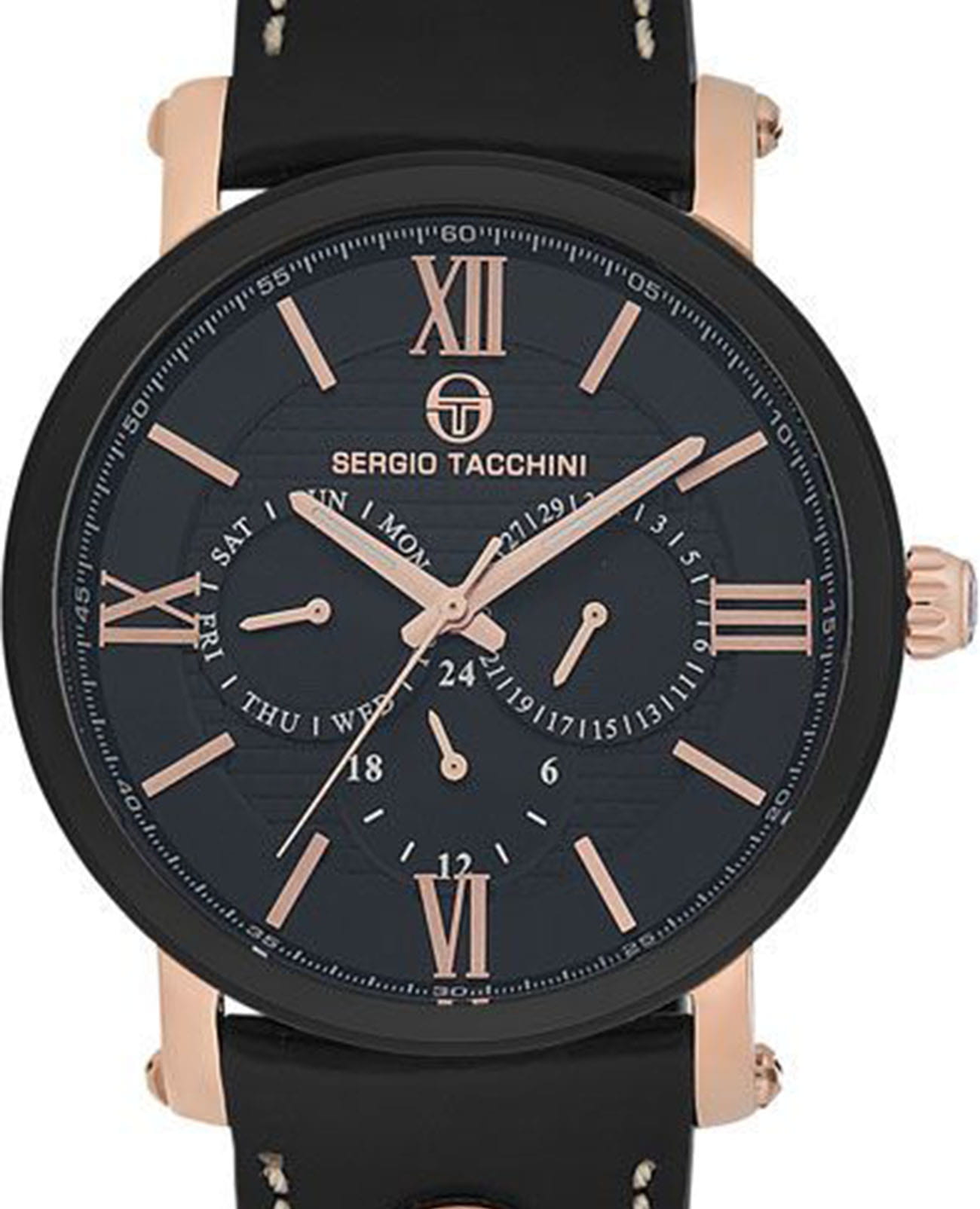 Мужские кварцевые часы Sergio Tacchini из коллекции City — это стильный аксессуар с классическими чертами для уверенного покорения городской жизни. Корпус диаметром 46 мм выполнен из нержавеющей стали 316L с PVD-покрытиемPVDУльтратонкое покрытие наносится в технике вакуумного напыления, сочетает в себе нитрид титана особой прочности со слоем золота или оксида хрома. Несёт в себе декоративную или защитную функцию.. Циферблат чёрного цвета оформлен индексами и стрелками. Указатели дня недели и даты вынесены на отдельные субциферблаты, также присутствует индикация 24-часового формата времени. Стрелки с люминесцентным покрытиемЛюминесцентное покрытиеПозволяет считывать показания времени в темноте. Производители наносят на стрелки, часовые индексы, безель или поверхность циферблата светонакопительный состав, дающий холодное свечение., обеспечивающим хорошую читаемость в темноте. Циферблат защищён минеральным стекломМинеральное стеклоМинеральное стекло представляет собой искусственно выращенный минерал кварца. Такое стекло отличается особой устойчивостью к повреждениям и царапинам. Уступает по некоторым качествам сапфировому стеклу. с антибликовым покрытиемАнтибликовое покрытиеСлой оксида металла в 0,13-0,3 микрон, благодаря которому стекло часов не бликует и не отражает свет. Антибликовое покрытие уменьшает отражение света в 10 раз, обеспечивая отличную читаемость показателей циферблата.. Механизм — японский кварцевый калибр Miyota 6P29. Часы оснащены кожаным ремешком чёрного цвета с стандартной застёжкой. Водонепроницаемость 100 м позволяет использовать часы в повседневных условиях. Идеальный выбор для тех, кто ценит функциональность и элегантный дизайн.