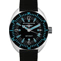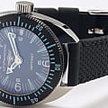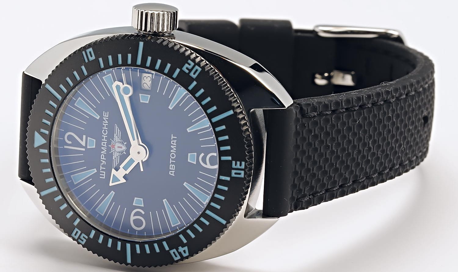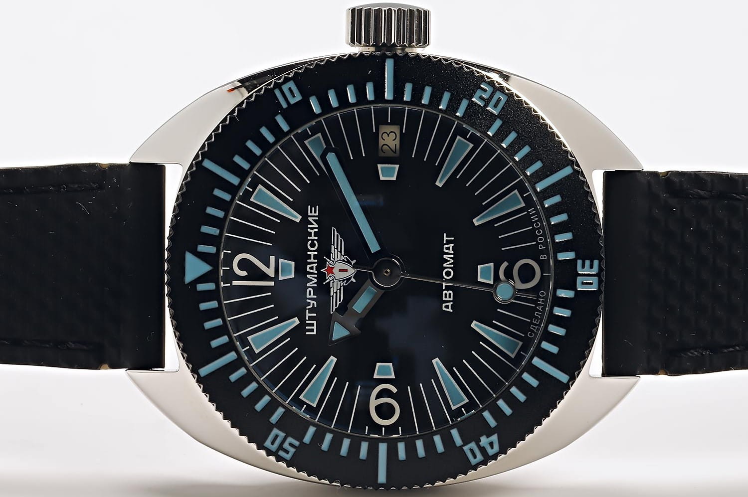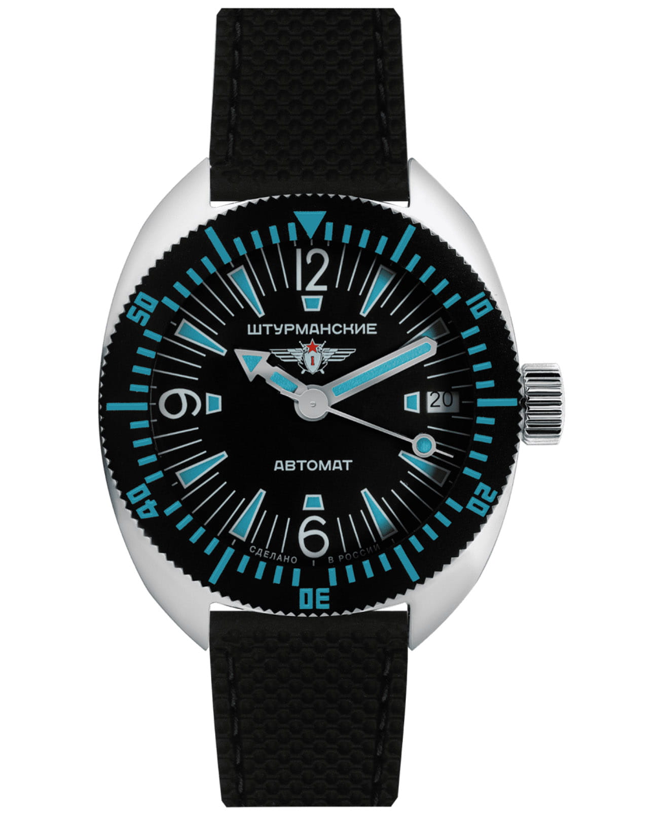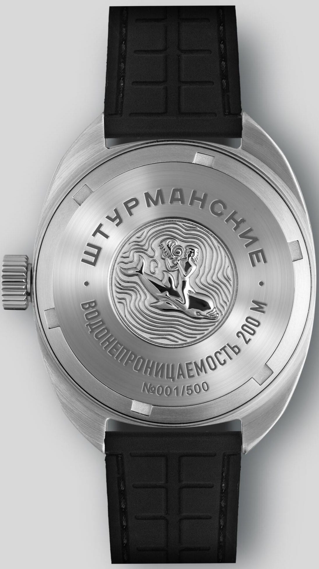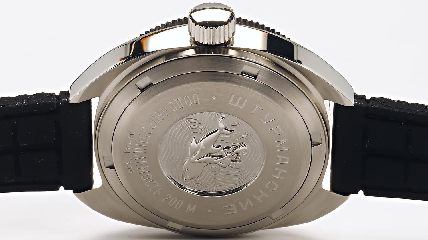 Штурманские мужские российские механические часы с утолщённым сферическим минеральным стекломМинеральное стеклоМинеральное стекло представляет собой искусственно выращенный минерал кварца. Такое стекло отличается особой устойчивостью к повреждениям и царапинам. Уступает по некоторым качествам сапфировому стеклу. Штурманские Амфибия 2416/7771502, механический механизм (автоматический калибр) с высокой точностью. Класс водозащиты: 200 метров, позволит плавать, нырять и заниматься другими водными видами спорта. Корпус часов изготовлен из стали. Силиконовый ремешок на стандартной застёжке. БезельБезельВнешний ободок, закрепляющий стекло. В спортивных часах так называется поворотное кольцо с делениями на циферблате, выполняет роль таймера – замеряет отрезки времени на шкале. Неподвижный безель – элемент декора. Однонаправленно вращающийся безель на дайверских часах позволяет фиксировать моменты погружения и выныривания на поверхность. с PVD-покрытиемPVDУльтратонкое покрытие наносится в технике вакуумного напыления, сочетает в себе нитрид титана особой прочности со слоем золота или оксида хрома. Несёт в себе декоративную или защитную функцию.. Стрелки и метки с люминесцентным покрытиемЛюминесцентное покрытиеПозволяет считывать показания времени в темноте. Производители наносят на стрелки, часовые индексы, безель или поверхность циферблата светонакопительный состав, дающий холодное свечение.. Окошко даты находится в положении 3 часа. Амфибия созданы на основе российского механического калибра с автоматическим подзаводом, 2416.  На задней крышке – как дань исторической модели – рельефные изображения всадника на дельфине.