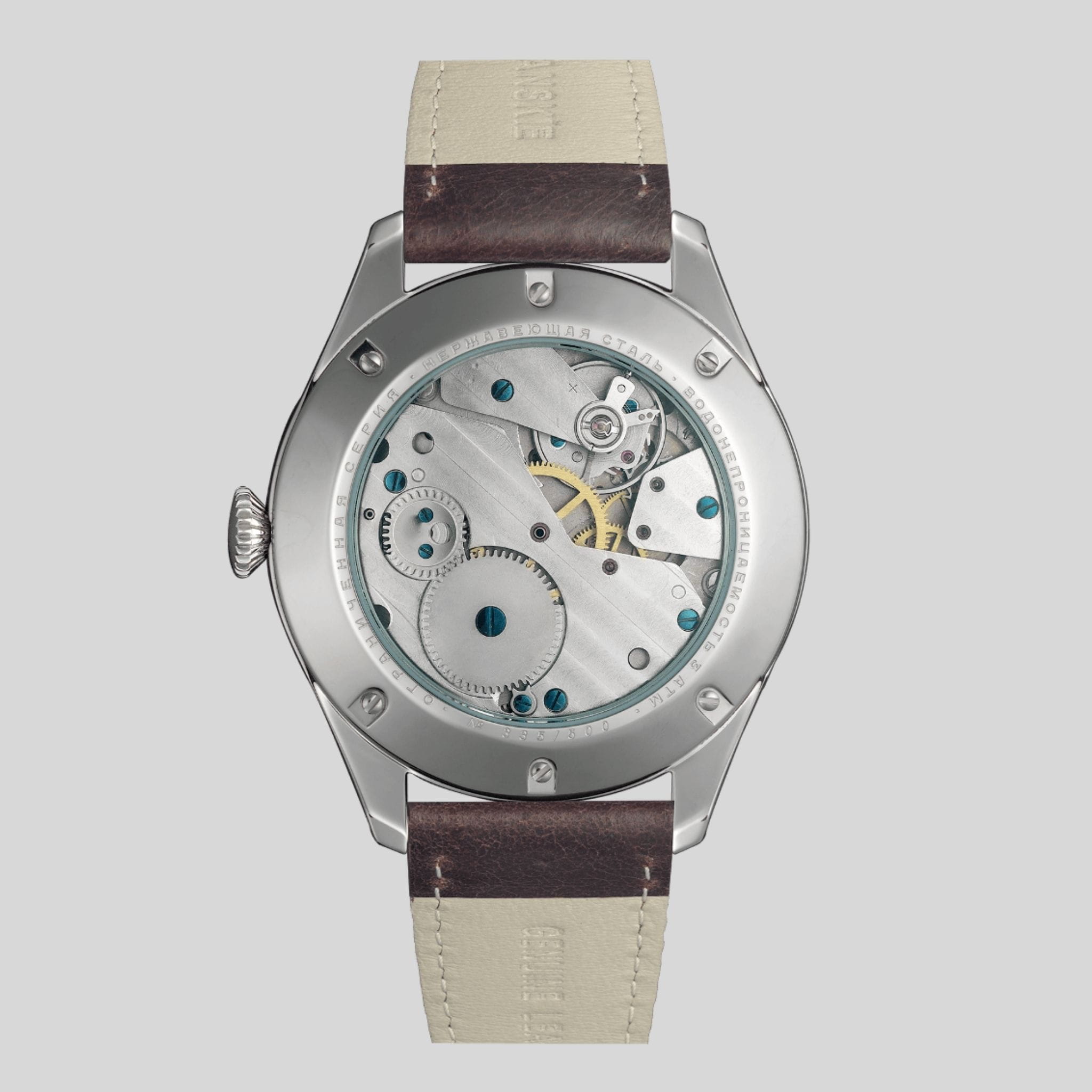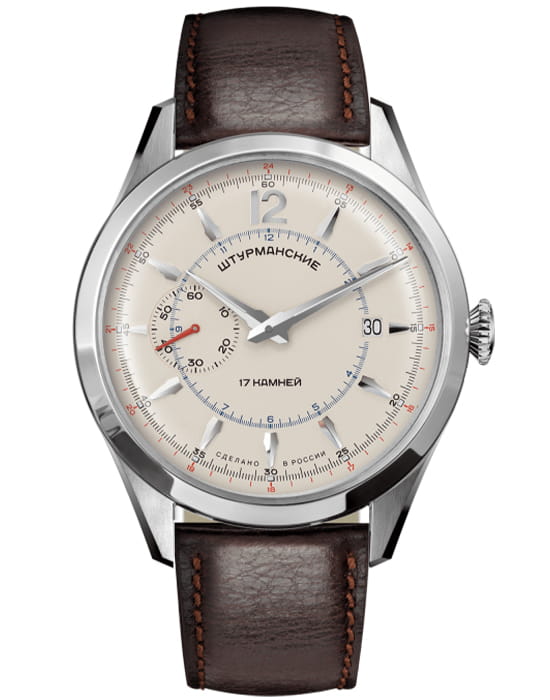 Мужские российские механические часы Штурманские 3105/1881217, механический механизм (автоматический калибр) с высокой точностью. Минеральное стеклоМинеральное стеклоМинеральное стекло представляет собой искусственно выращенный минерал кварца. Такое стекло отличается особой устойчивостью к повреждениям и царапинам. Уступает по некоторым качествам сапфировому стеклу. устойчивое к мелким механическим повреждениям. Класс водозащиты: 50 метров, позволит защитить корпус от случайных брызг или капель дождя. Корпус часов изготовлен из стали. Кожаный ремешок на стандартной застёжке. Чёткая, читаемая минутная шкала уходит за приделы видимой области циферблата, подчёркивая изящность ободка корпуса. Окошко даты находится в положении 3 часов.