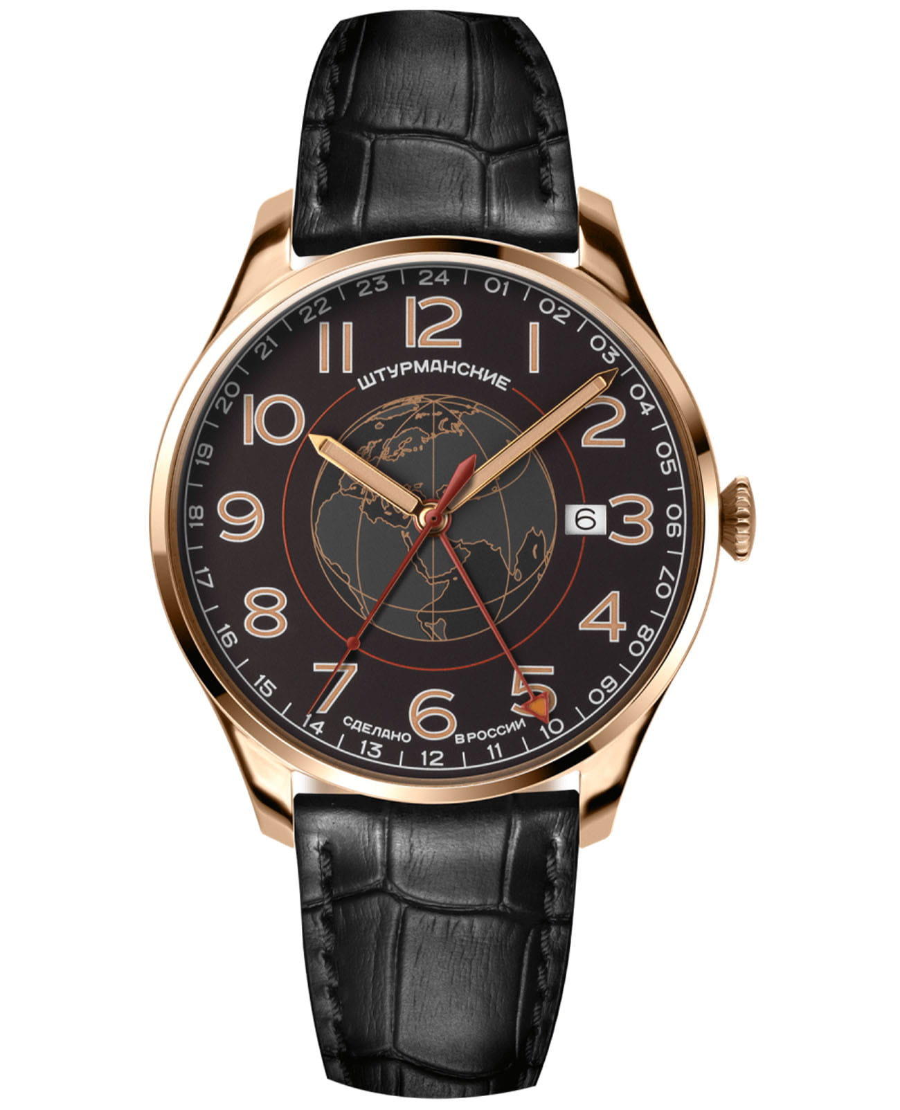 Штурманские мужские российские кварцевые часы с минеральным стекломМинеральное стеклоМинеральное стекло представляет собой искусственно выращенный минерал кварца. Такое стекло отличается особой устойчивостью к повреждениям и царапинам. Уступает по некоторым качествам сапфировому стеклу. Штурманские Наследие Спутник 51524/1079663, кварцевый механизм с высокой точностью. Класс водозащиты: 50 метров, позволит защитить корпус от случайных брызг или капель дождя. Корпус часов изготовлен из стали с PVD-покрытиемPVDУльтратонкое покрытие наносится в технике вакуумного напыления, сочетает в себе нитрид титана особой прочности со слоем золота или оксида хрома. Несёт в себе декоративную или защитную функцию.. Кожаный ремешок на стандартной застёжке. Стрелки и метки с люминесцентным покрытиемЛюминесцентное покрытиеПозволяет считывать показания времени в темноте. Производители наносят на стрелки, часовые индексы, безель или поверхность циферблата светонакопительный состав, дающий холодное свечение.. Индексы стандартной 12-часовой шкалы выполнены в ретро-стиле, светятся в темноте. Вокруг нее расположена вторая шкала – 24-часовая GMT с отдельной стрелкой. Окошко даты находится в положении 3 часа.