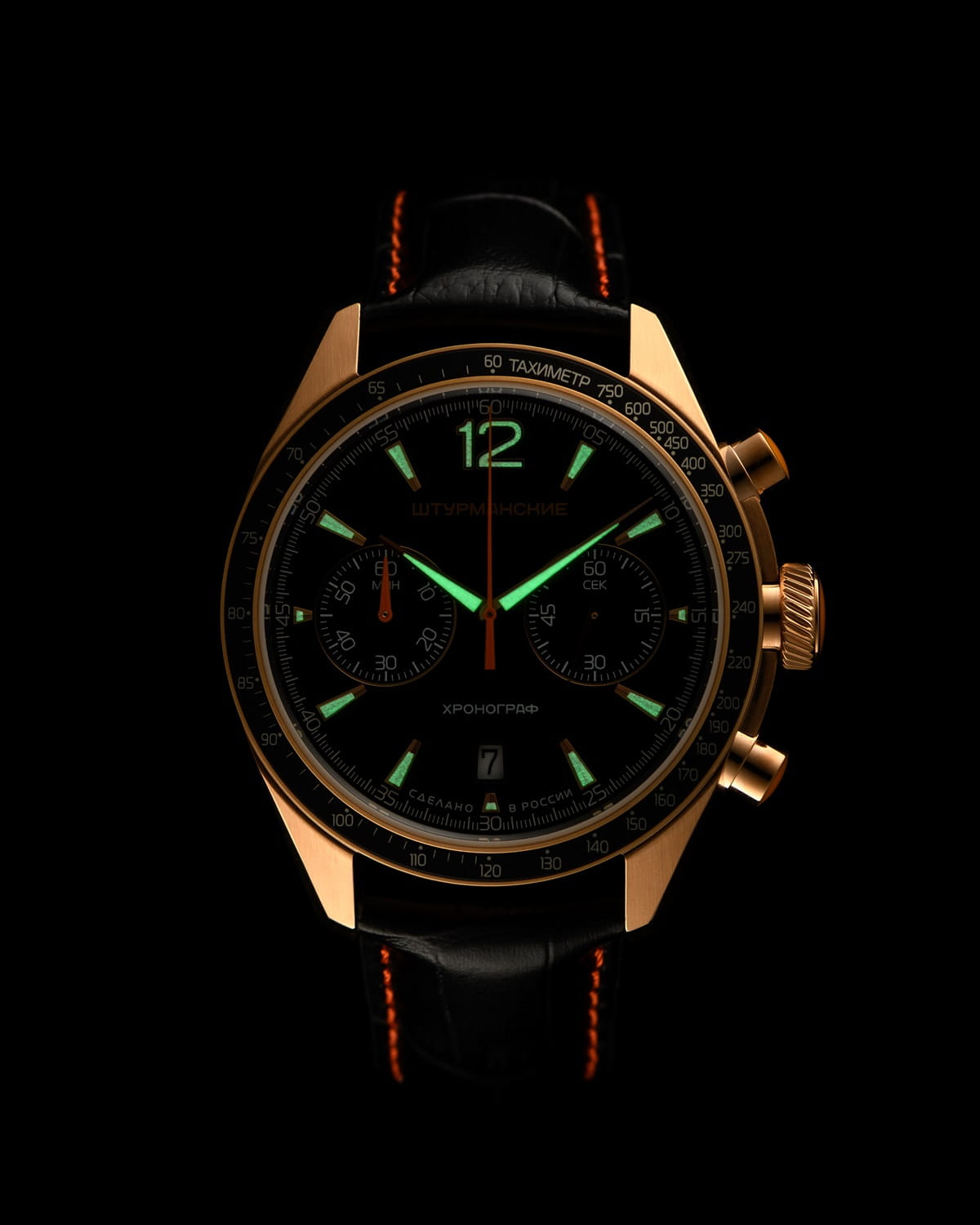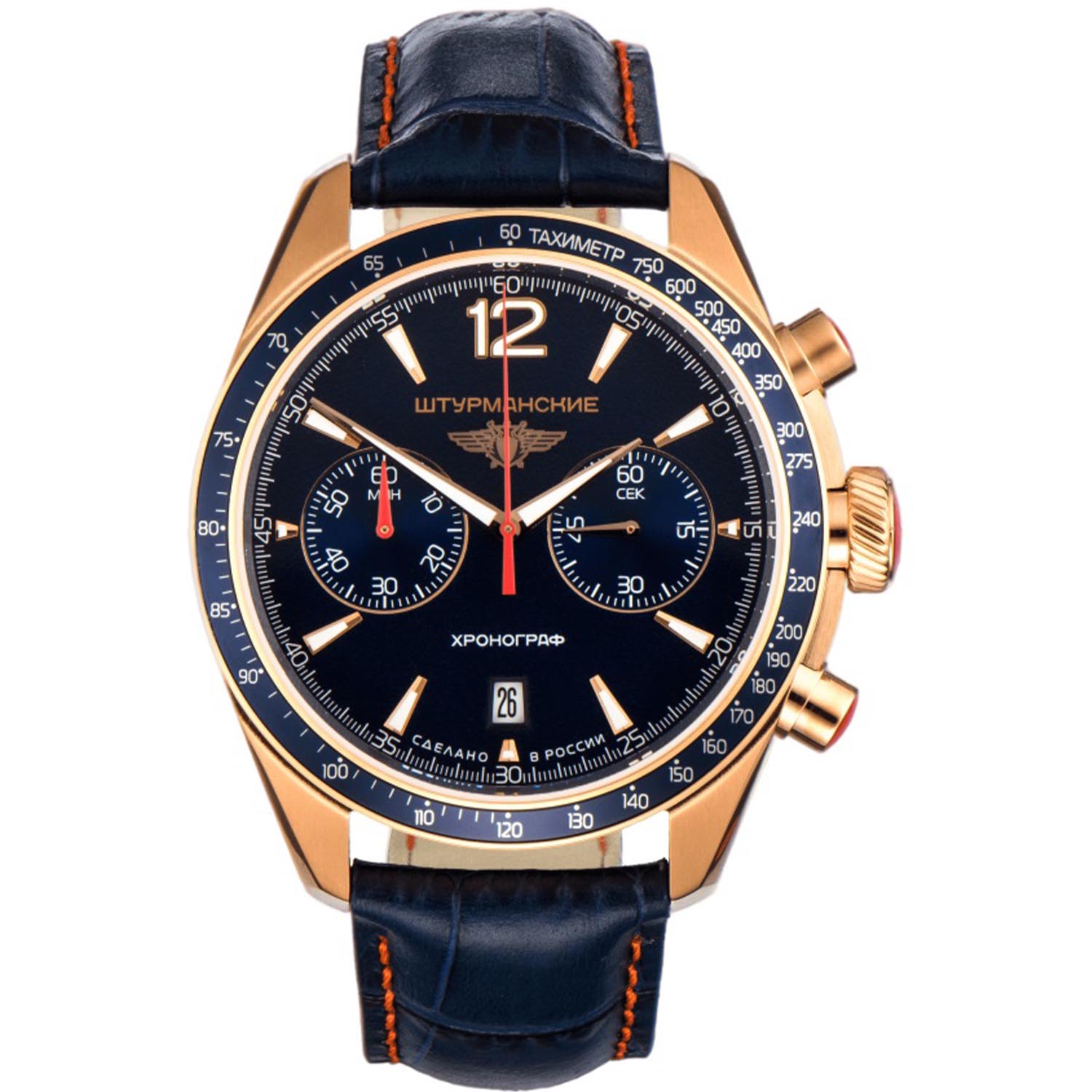 Мужские российские кварцевые часы-хронографХронографФункция позволяет измерять отрезки времени с особой точностью: часы, минуты, секунды. Верным признаком хронографа является наличие на циферблате 3 дополнительных окошек-счётчиков. с секундомеромСекундомерСекундоме́р — прибор, способный измерять интервалы времени с точностью до долей секунды. Штурманские 6S21/4799416, кварцевый механизм с высокой точностью. Класс водозащиты: 50 метров, позволит защитить корпус от случайных брызг или капель дождя. Корпус часов изготовлен из стали с PVD-покрытиемPVDУльтратонкое покрытие наносится в технике вакуумного напыления, сочетает в себе нитрид титана особой прочности со слоем золота или оксида хрома. Несёт в себе декоративную или защитную функцию.. ТахиметрТахиметрРазмеченная шкала, располагается на ободке или безеле часов. Тахиметр позволяет рассчитать скорость на определённом участке пути, расстояние измеряется в километрах или милях.. Кожаный ремешок на стандартной застёжке. Минеральное стеклоМинеральное стеклоМинеральное стекло представляет собой искусственно выращенный минерал кварца. Такое стекло отличается особой устойчивостью к повреждениям и царапинам. Уступает по некоторым качествам сапфировому стеклу. устойчивое к мелким механическим повреждениям. Стрелки и метки с люминесцентным покрытиемЛюминесцентное покрытиеПозволяет считывать показания времени в темноте. Производители наносят на стрелки, часовые индексы, безель или поверхность циферблата светонакопительный состав, дающий холодное свечение..