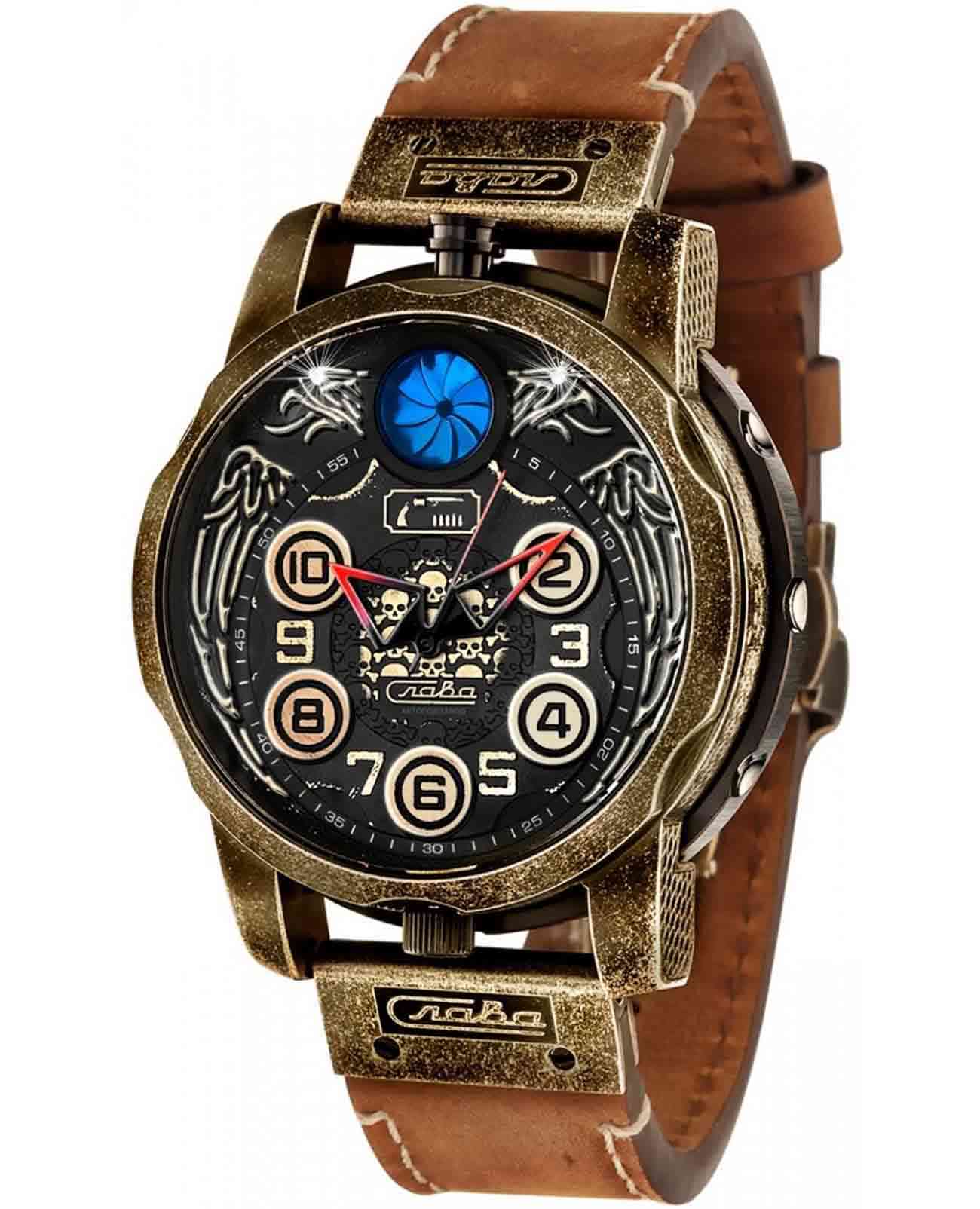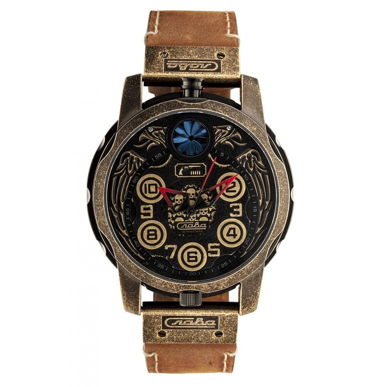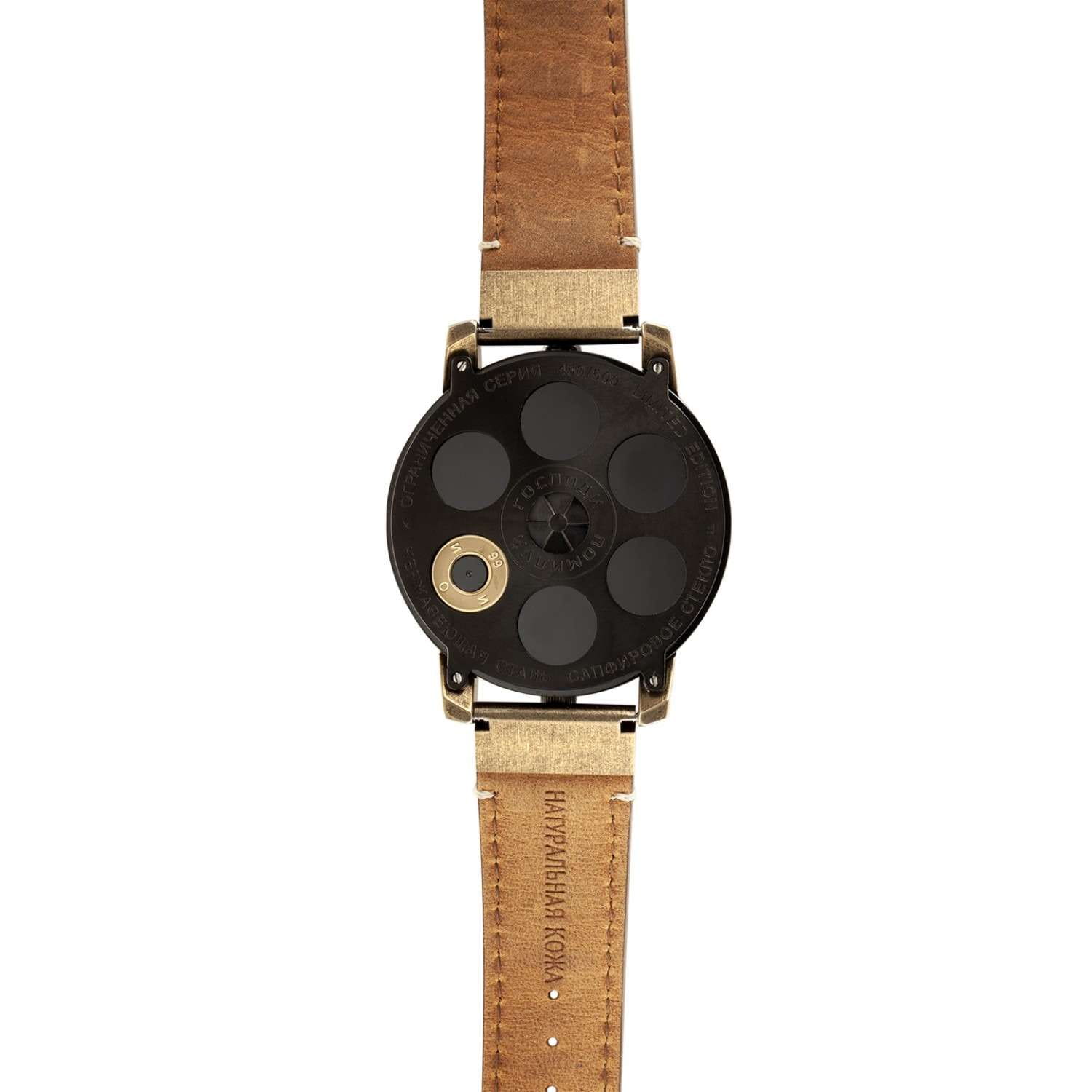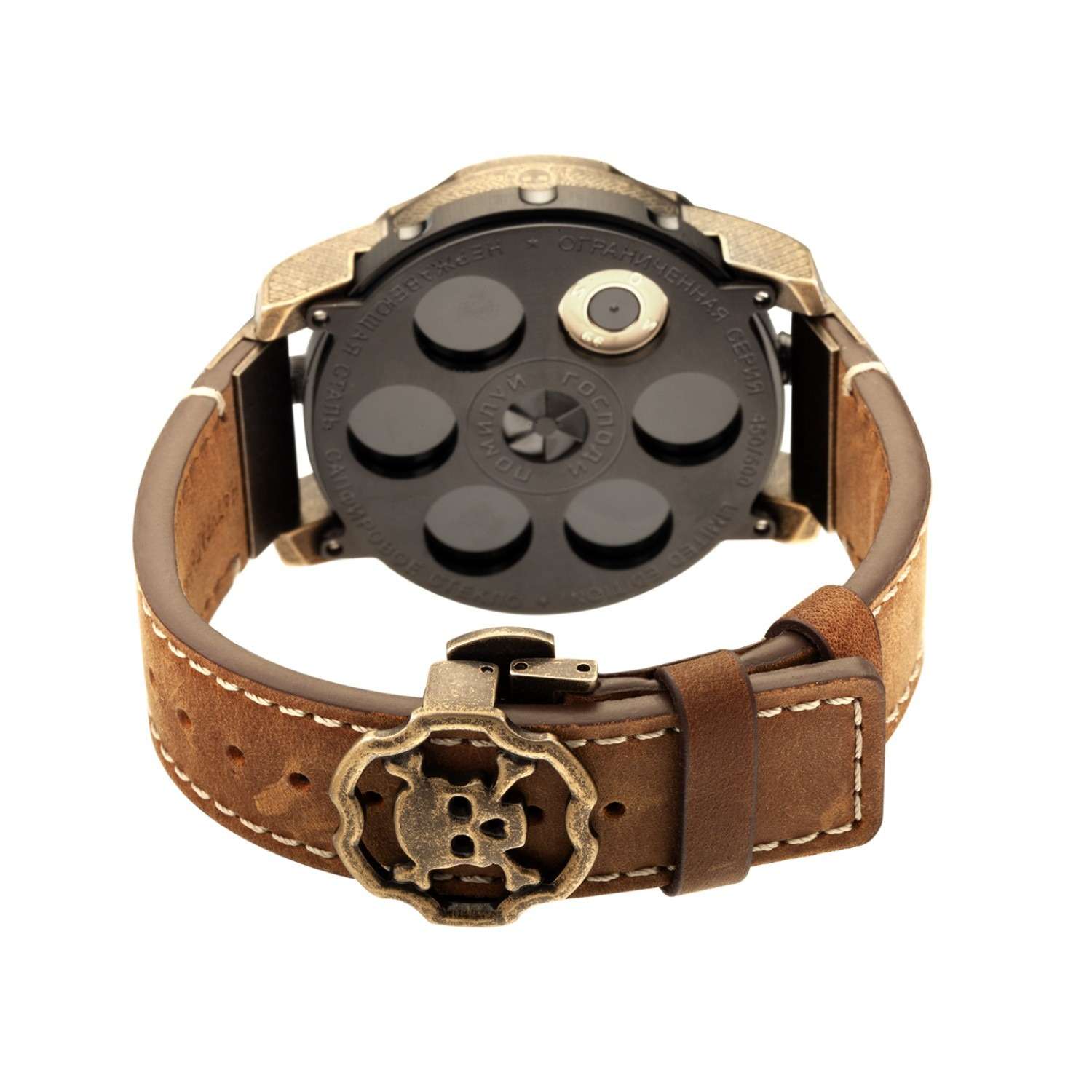 Российские механические наручные часы Слава Русская RUлетка 1908204/300-NH05, которые станут идеальным аксессуаром для повседневного ношения. Эти часы сочетают в себе элегантность и практичность, предлагая безупречный стиль и надежность. Оснащенные механизмом SEIKO NH05 с автоподзаводом, они обеспечивают точность и долговечность. Стальной корпус с бронзовым PVDPVDУльтратонкое покрытие наносится в технике вакуумного напыления, сочетает в себе нитрид титана особой прочности со слоем золота или оксида хрома. Несёт в себе декоративную или защитную функцию. покрытием и сапфировым стекломСапфировое стеклоПрочный и надёжный материал из кристалла сапфира синтетического происхождения, характеризующийся особой твёрдостью и устойчивостью к царапинам и повреждениям. защищает циферблат с арабскими цифрами и необычными стрелками цифрами. БезельБезельВнешний ободок, закрепляющий стекло. В спортивных часах так называется поворотное кольцо с делениями на циферблате, выполняет роль таймера – замеряет отрезки времени на шкале. Неподвижный безель – элемент декора. Однонаправленно вращающийся безель на дайверских часах позволяет фиксировать моменты погружения и выныривания на поверхность. часов с PVDPVDУльтратонкое покрытие наносится в технике вакуумного напыления, сочетает в себе нитрид титана особой прочности со слоем золота или оксида хрома. Несёт в себе декоративную или защитную функцию. покрытием бронзового цвета. Особенность часов - искусственные бриллианты в глазах орлов и изображение черепов на циферблате. Это первые в мире часы с шестизарядным револьверным барабаном. В барабане — один патрон. Старинная забава русских офицеров и любителей острых ощущений со всего мира. Водозащита на часах до 10 ATM, что делает их надежными в различных условиях. Кожаный коричневый ремешок с застежкой «бабочка»Застёжка "бабочка"Такой вид застёжки дополняется предохранителями, помогающими избежать случайного раскрытия браслета. Обладают изящным исполнением. завершает этот изысканный образ.