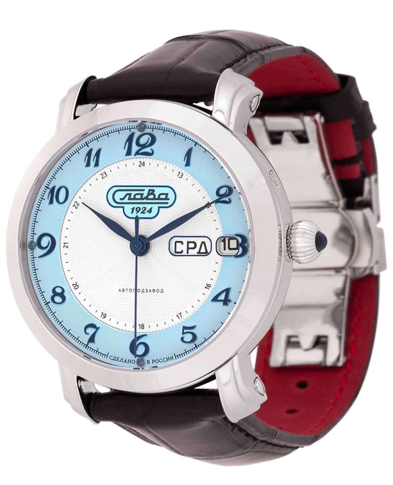 Наручные часы Слава Слава России 2440616/300-2427 — воплощение классического стиля и исключительного качества, произведенные в России. Эта модель из лимитированной коллекции, выпущенной в количестве всего 300 экземпляров, станет великолепным дополнением к вашему образу. Часы оснащены надежным механическим механизмом "Слава 2427" с автоподзаводом, обеспечивающим точный ход и оснащены двойным календарем, что позволяет всегда быть в курсе текущей даты. Корпус из нержавеющей стали с родиевым покрытием диаметром 41 мм и толщиной 14,2 мм отличается высокой прочностью и водозащитой до 5 ATM. Серебристо-голубой циферблат с арабскими цифрами защищен сапфировым стекломСапфировое стеклоПрочный и надёжный материал из кристалла сапфира синтетического происхождения, характеризующийся особой твёрдостью и устойчивостью к царапинам и повреждениям., устойчивым к царапинам, что позволяет надолго сохранить безупречный вид часов. На 3 часах расположено окошко с указателем даты и дня недели. Кожаный ремень из крокодила с застежкой «бабочка»Застёжка "бабочка"Такой вид застёжки дополняется предохранителями, помогающими избежать случайного раскрытия браслета. Обладают изящным исполнением. добавляет элегантности и комфорта, создавая ощущение роскоши и изысканности. Эта модель станет идеальным выбором для тех, кто ценит традиции и высокое качество в сочетании с современным дизайном.