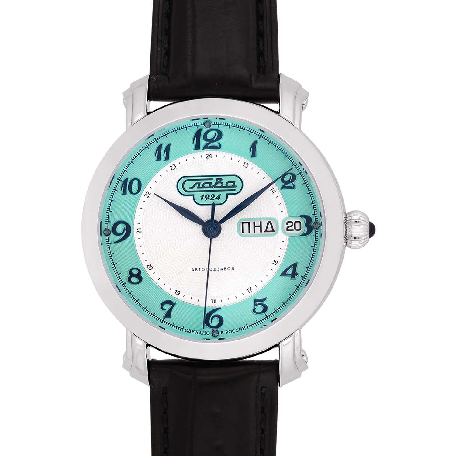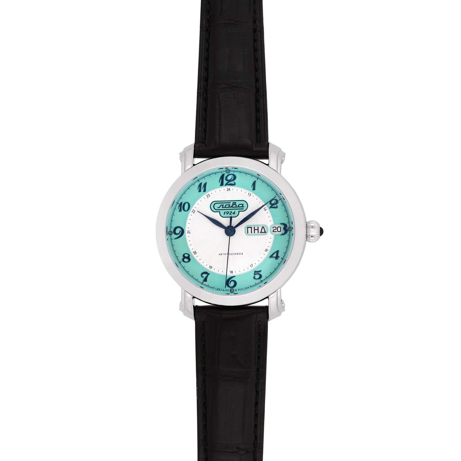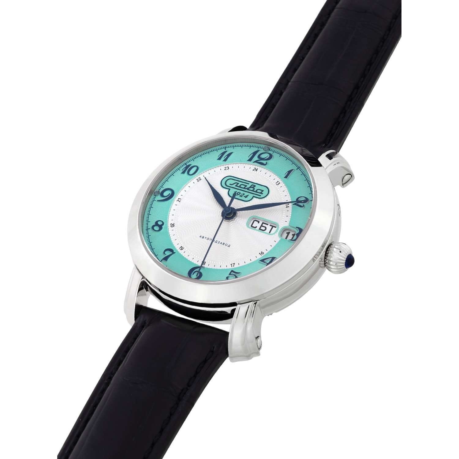 Наручные часы Слава Слава России 2440617/300-2427 — воплощение классического стиля и исключительного качества, произведенные в России. Эта модель из лимитированной коллекции, выпущенной в количестве всего 300 экземпляров, станет великолепным дополнением к вашему образу. Часы оснащены надежным механическим механизмом "Слава 2427" с автоподзаводом, обеспечивающим точный ход и оснащены двойным календарем, что позволяет всегда быть в курсе текущей даты. Корпус из нержавеющей стали с родиевым покрытием диаметром 41 мм и толщиной 14,2 мм отличается высокой прочностью и водозащитой до 5 ATM. Серебристо-бирюзовый циферблат с арабскими цифрами защищен сапфировым стекломСапфировое стеклоПрочный и надёжный материал из кристалла сапфира синтетического происхождения, характеризующийся особой твёрдостью и устойчивостью к царапинам и повреждениям., устойчивым к царапинам, что позволяет надолго сохранить безупречный вид часов. На 3 часах расположено окошко с указателем даты и дня недели. Кожаный ремень из крокодила с застежкой «бабочка»Застёжка "бабочка"Такой вид застёжки дополняется предохранителями, помогающими избежать случайного раскрытия браслета. Обладают изящным исполнением. добавляет элегантности и комфорта, создавая ощущение роскоши и изысканности. Эта модель станет идеальным выбором для тех, кто ценит традиции и высокое качество в сочетании с современным дизайном.