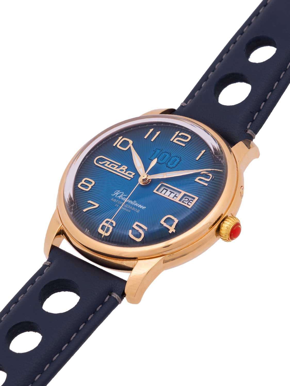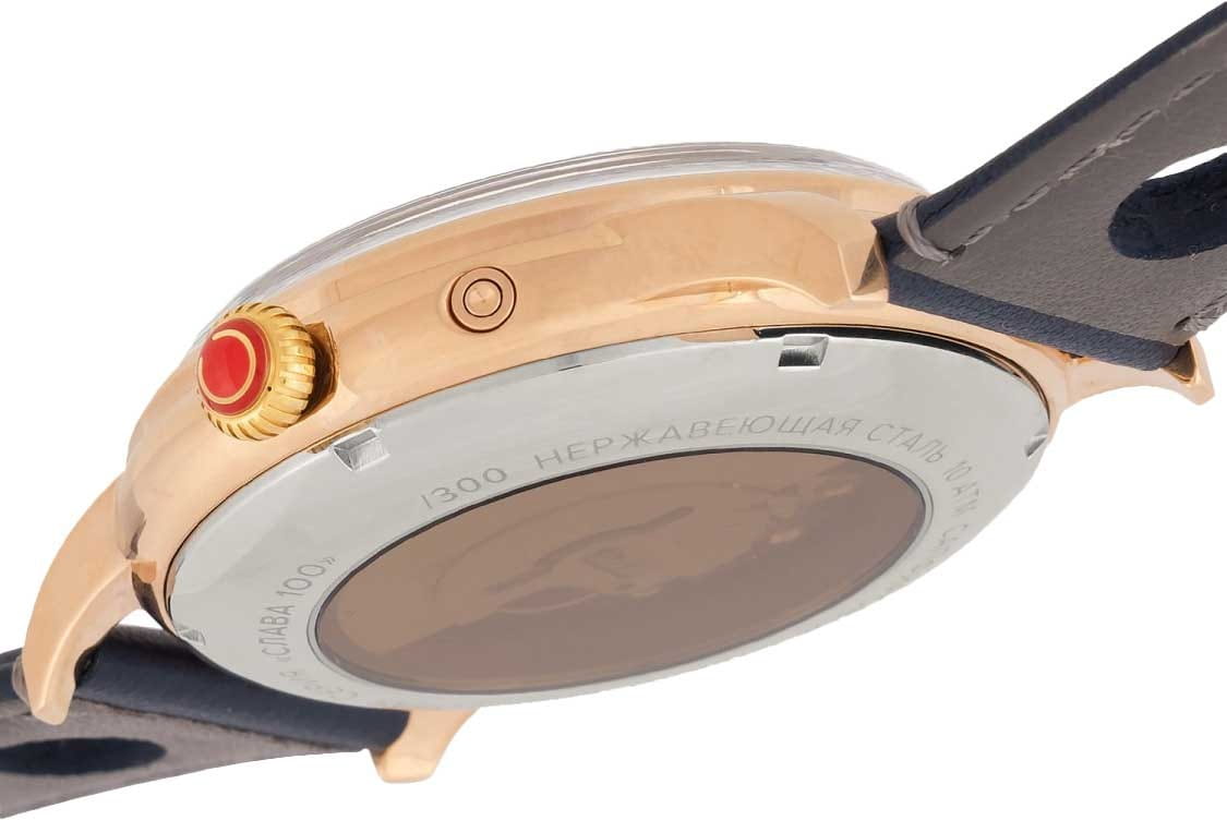 Часы Слава Юбилейные 2603673/300-2427 представляют собой воплощение российского часового искусства, сочетая в себе традиции и современные технологии. Эти механические часы с автоподзаводом оснащены калибром «Слава 2427», который обеспечивает надежную и точную работу. Корпус из высококачественной стали с IP-покрытиемIP-покрытиеМетод ионного напыления. Демонстрирует повышенную устойчивость к истиранию, окислению и химическим веществам. Под воздействием высокого давления и температуры около 1500°C молекулы металла надёжно соединяются с частицами корпуса часов. диаметром 44 мм и толщиной 14,5 мм придает часам солидность и долговечность. Циферблат выполнен в благородном синем цвете и оформлен арабскими цифрами, обеспечивая удобство чтения времени. Прочное выпуклое сапфировое стеклоСапфировое стеклоПрочный и надёжный материал из кристалла сапфира синтетического происхождения, характеризующийся особой твёрдостью и устойчивостью к царапинам и повреждениям. защищает циферблат от царапин и повреждений. Особенностью модели является наличие календаря, отображающего число и день недели в положении 3 часа. Стрелки с люминесцентным покрытиемЛюминесцентное покрытиеПозволяет считывать показания времени в темноте. Производители наносят на стрелки, часовые индексы, безель или поверхность циферблата светонакопительный состав, дающий холодное свечение., что облегчает чтение времени даже в условиях слабого освещения. Часы обладают водозащитой уровня 100WR, что делает их подходящими для повседневного ношения и активного образа жизни. Кожаный ремешок с классической застежкой добавляет модели изысканности и комфорта в носке. Эта модель представлена в лимитированной серии из 300 экземпляров, что делает её не только надежным функциональным аксессуаром, но и ценным предметом для коллекционеров. Прозрачная задняя крышка позволяет наблюдать за работой механизма, который включает в себя 25 камней и имеет частоту 18000 полуколебаний в час. Запас хода составляет до 40 часов, а противоударное устройство оси баланса обеспечивает дополнительную надежность.