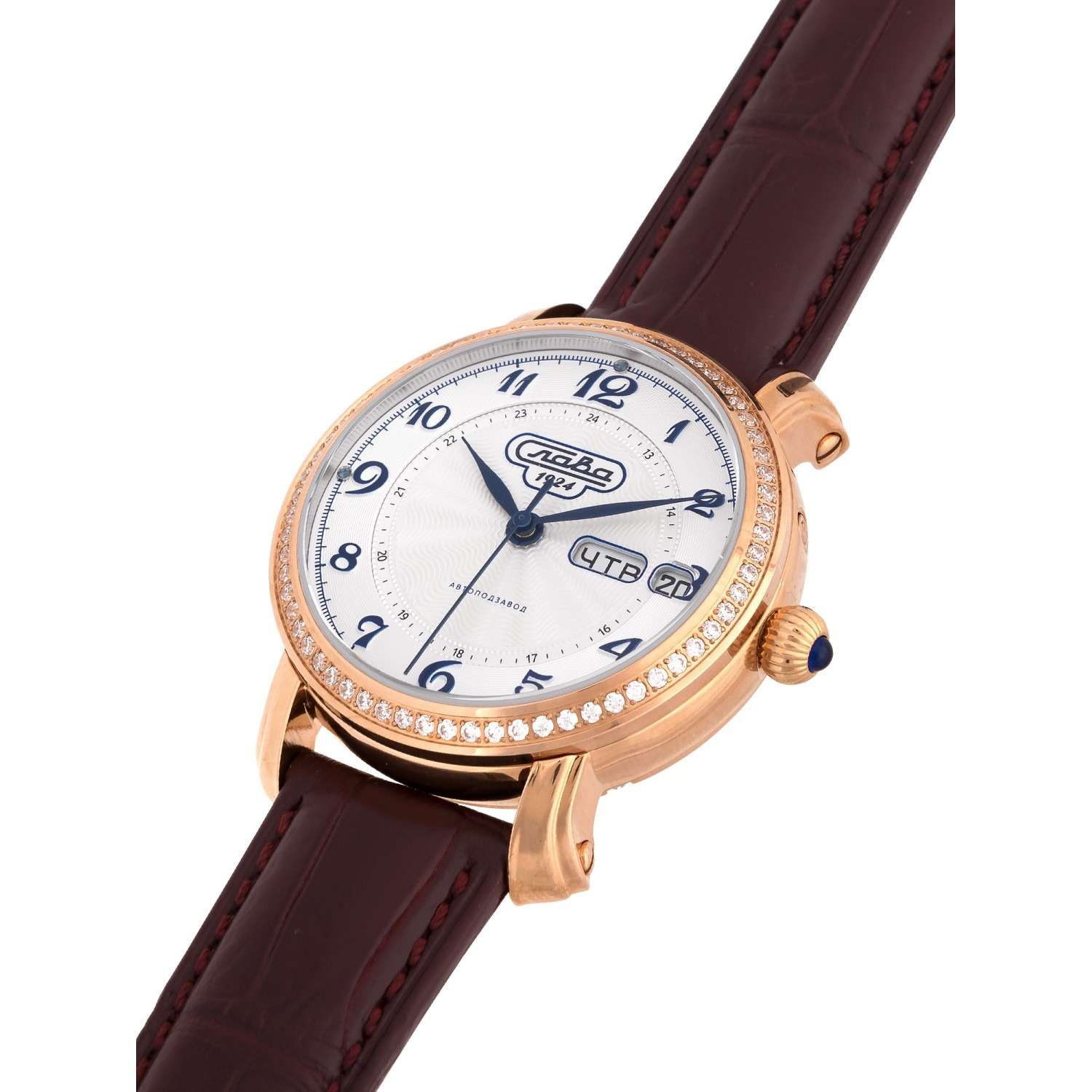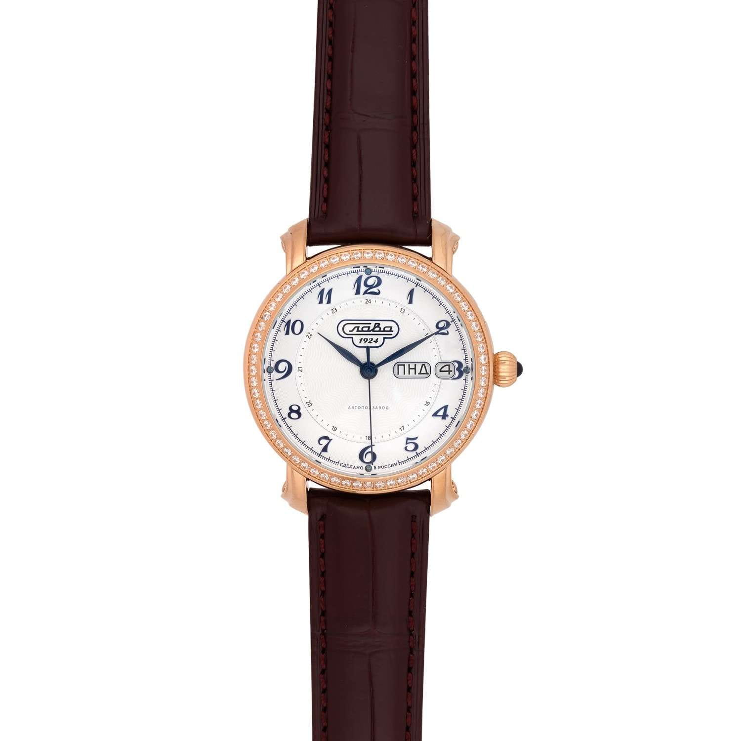 Наручные часы Слава Слава России 7443615/300-2427-68 — воплощение классического стиля и исключительного качества, произведенные в России. Эта модель из лимитированной коллекции станет великолепным дополнением к вашему образу. Часы оснащены надежным механическим механизмом "Слава 2427" с автоподзаводом, обеспечивающим точный ход и оснащены двойным календарем, что позволяет всегда быть в курсе текущей даты. Корпус из нержавеющей стали с золотистым PVDPVDУльтратонкое покрытие наносится в технике вакуумного напыления, сочетает в себе нитрид титана особой прочности со слоем золота или оксида хрома. Несёт в себе декоративную или защитную функцию.-покрытием диаметром 41 мм и толщиной 14,2 мм отличается высокой прочностью и водозащитой до 5 ATM. БезельБезельВнешний ободок, закрепляющий стекло. В спортивных часах так называется поворотное кольцо с делениями на циферблате, выполняет роль таймера – замеряет отрезки времени на шкале. Неподвижный безель – элемент декора. Однонаправленно вращающийся безель на дайверских часах позволяет фиксировать моменты погружения и выныривания на поверхность. часов с вставками из камней циркона. Серебристый циферблат с арабскими цифрами защищен сапфировым стекломСапфировое стеклоПрочный и надёжный материал из кристалла сапфира синтетического происхождения, характеризующийся особой твёрдостью и устойчивостью к царапинам и повреждениям., устойчивым к царапинам, что позволяет надолго сохранить безупречный вид часов. На 3 часах расположено окошко с указателем даты и дня недели. Кожаный ремень из крокодила с застежкой «бабочка»Застёжка "бабочка"Такой вид застёжки дополняется предохранителями, помогающими избежать случайного раскрытия браслета. Обладают изящным исполнением. добавляет элегантности и комфорта, создавая ощущение роскоши и изысканности. Эта модель станет идеальным выбором для тех, кто ценит традиции и высокое качество в сочетании с современным дизайном.