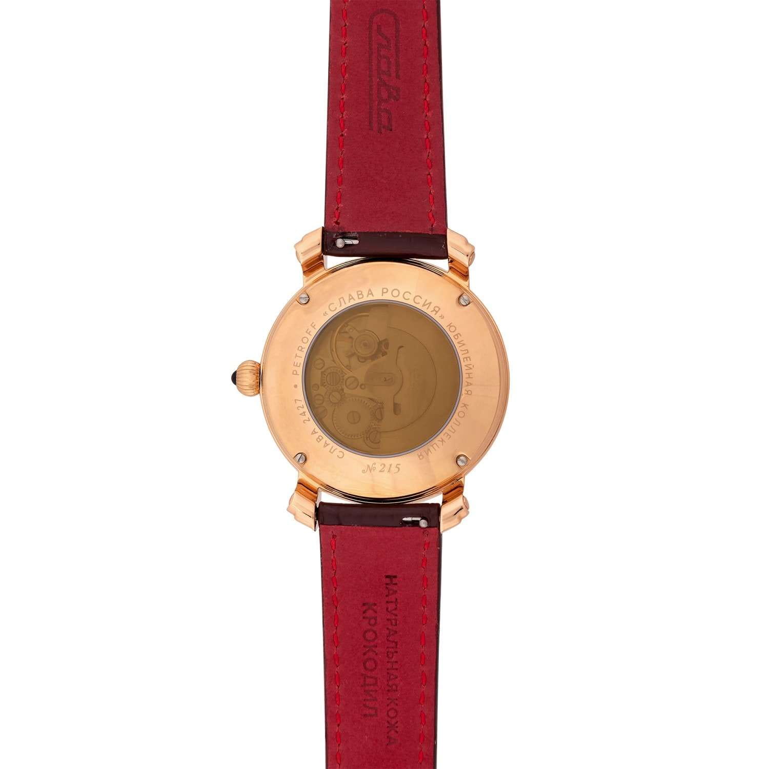 Наручные часы Слава Слава России 7443616/300-2427-68 — воплощение классического стиля и исключительного качества, произведенные в России. Эта модель из лимитированной коллекции станет великолепным дополнением к вашему образу. Часы оснащены надежным механическим механизмом "Слава 2427" с автоподзаводом, обеспечивающим точный ход и оснащены двойным календарем, что позволяет всегда быть в курсе текущей даты. Корпус из нержавеющей стали с золотистым PVDPVDУльтратонкое покрытие наносится в технике вакуумного напыления, сочетает в себе нитрид титана особой прочности со слоем золота или оксида хрома. Несёт в себе декоративную или защитную функцию.-покрытием диаметром 41 мм и толщиной 14,2 мм отличается высокой прочностью и водозащитой до 5 ATM. БезельБезельВнешний ободок, закрепляющий стекло. В спортивных часах так называется поворотное кольцо с делениями на циферблате, выполняет роль таймера – замеряет отрезки времени на шкале. Неподвижный безель – элемент декора. Однонаправленно вращающийся безель на дайверских часах позволяет фиксировать моменты погружения и выныривания на поверхность. часов с вставками из камней циркона. Серебристо-голубой циферблат с арабскими цифрами защищен сапфировым стекломСапфировое стеклоПрочный и надёжный материал из кристалла сапфира синтетического происхождения, характеризующийся особой твёрдостью и устойчивостью к царапинам и повреждениям., устойчивым к царапинам, что позволяет надолго сохранить безупречный вид часов. На 3 часах расположено окошко с указателем даты и дня недели. Кожаный ремень из крокодила с застежкой «бабочка»Застёжка "бабочка"Такой вид застёжки дополняется предохранителями, помогающими избежать случайного раскрытия браслета. Обладают изящным исполнением. добавляет элегантности и комфорта, создавая ощущение роскоши и изысканности. Эта модель станет идеальным выбором для тех, кто ценит традиции и высокое качество в сочетании с современным дизайном.