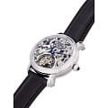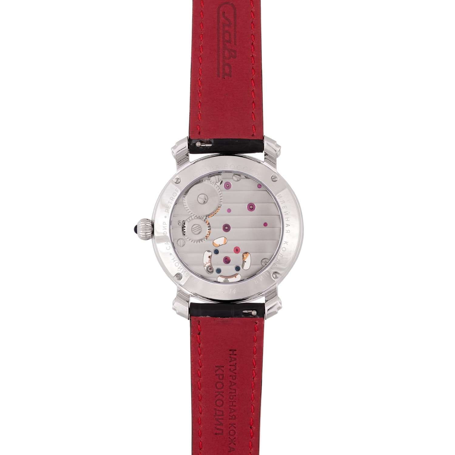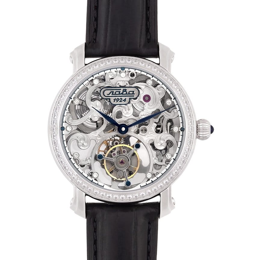 Наручные часы Слава Слава России 7460619/300-3451С-68 — воплощение классического стиля и исключительного качества, произведенные в России. Эта модель из лимитированной коллекции станет великолепным дополнением к вашему образу. Часы оснащены надежным механическим механизмом Hangzhou SL3451 с автоподзаводом, обеспечивающим точный ход и оснащены скелетоном, позволяющим любоваться механизмом. Корпус из нержавеющей стали с родиевым покрытием диаметром 41 мм и толщиной 14,2 мм отличается высокой прочностью и водозащитой до 5 ATM. БезельБезельВнешний ободок, закрепляющий стекло. В спортивных часах так называется поворотное кольцо с делениями на циферблате, выполняет роль таймера – замеряет отрезки времени на шкале. Неподвижный безель – элемент декора. Однонаправленно вращающийся безель на дайверских часах позволяет фиксировать моменты погружения и выныривания на поверхность. часов с вставками из камней циркона. Серебристый циферблат с открытым механизмом защищен сапфировым стекломСапфировое стеклоПрочный и надёжный материал из кристалла сапфира синтетического происхождения, характеризующийся особой твёрдостью и устойчивостью к царапинам и повреждениям., устойчивым к царапинам, что позволяет надолго сохранить безупречный вид часов. Кожаный ремень из крокодила с застежкой «бабочка»Застёжка "бабочка"Такой вид застёжки дополняется предохранителями, помогающими избежать случайного раскрытия браслета. Обладают изящным исполнением. добавляет элегантности и комфорта, создавая ощущение роскоши и изысканности. Эта модель станет идеальным выбором для тех, кто ценит традиции и высокое качество в сочетании с современным дизайном.