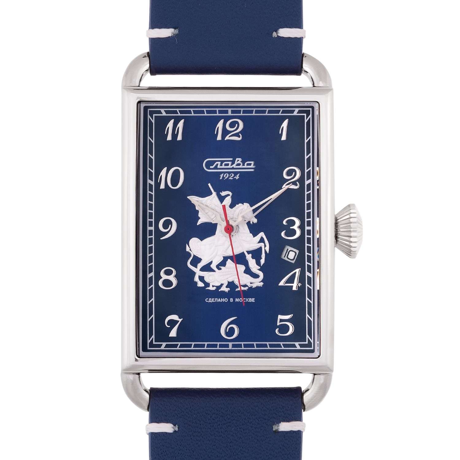 Часы Слава Москва 8700784/300-2414 — это воплощение элегантности и стиля, которое станет идеальным дополнением к вашему деловому гардеробу. Созданные в России, они оснащены надежным механическим механизмом калибра Слава 2414. Корпус выполнен из высококачественной стали, что обеспечивает долговечность и изысканный внешний вид. Синий циферблат украшен изображением Георгия Победоносца и защищен прочным сапфировым стекломСапфировое стеклоПрочный и надёжный материал из кристалла сапфира синтетического происхождения, характеризующийся особой твёрдостью и устойчивостью к царапинам и повреждениям., которое устойчиво к царапинам. Арабские цифры и окошко даты, расположенное между отметками 3 и 4 часа, добавляют функциональности и удобства в использовании. Задняя крышка, крепящаяся на 4 винтах, украшена надписью «Москва», подчеркивая уникальность и оригинальность модели. Кожаный ремешок с классической застежкой и системой быстрой замены не только обеспечивает комфорт, но и позволяет легко менять его по вашему желанию. Часы обладают водозащитой 50WR, что делает их подходящими для ежедневного ношения. Компактные габариты и вес в 70 грамм делают их удобными и практически незаметными на запястье. Эта лимитированная серия выпущена в количестве всего 500 экземпляров, что придает особую ценность и эксклюзивность вашему выбору. Часы поставляются в стильной подарочной упаковке, что делает их отличным подарком для ценителей высокого качества и утонченного дизайна.