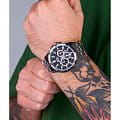 Циферблат черного цвета украшен стрелками с люминесцентным покрытиемЛюминесцентное покрытиеПозволяет считывать показания времени в темноте. Производители наносят на стрелки, часовые индексы, безель или поверхность циферблата светонакопительный состав, дающий холодное свечение., что позволяет легко определять время даже в условиях слабого освещения. Для защиты циферблата используется минеральное стеклоМинеральное стеклоМинеральное стекло представляет собой искусственно выращенный минерал кварца. Такое стекло отличается особой устойчивостью к повреждениям и царапинам. Уступает по некоторым качествам сапфировому стеклу., устойчивое к царапинам и повреждениям.