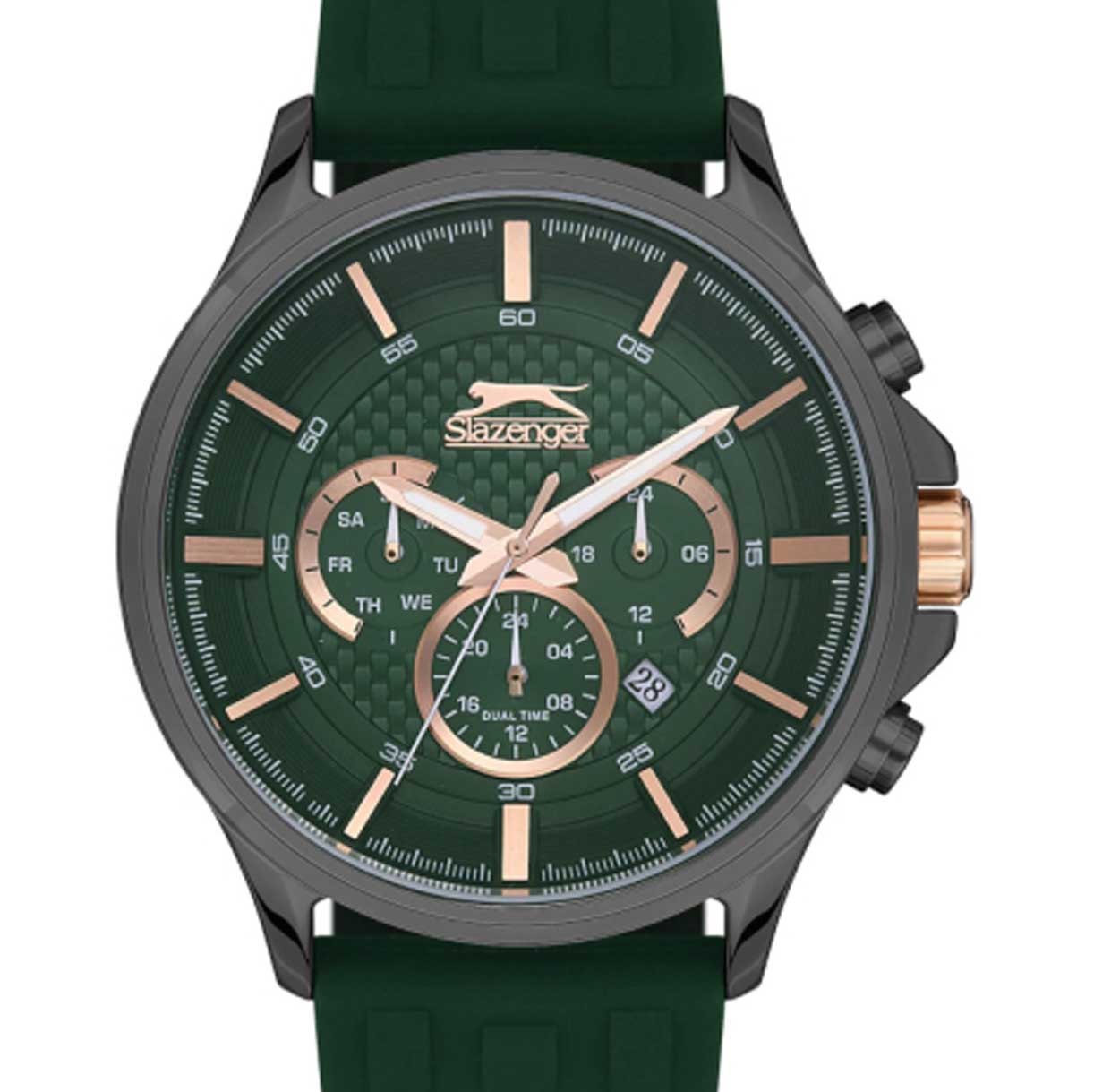 Часы Slazenger SL.09.2136.2.04 воплощают в себе элегантность и практичность, идеально подходящие для современных мужчин. Их зеленый циферблат, защищенный минеральным стекломМинеральное стеклоМинеральное стекло представляет собой искусственно выращенный минерал кварца. Такое стекло отличается особой устойчивостью к повреждениям и царапинам. Уступает по некоторым качествам сапфировому стеклу., заключен в корпус диаметром 47 мм, который изготовлен из прочного суперметалла с IP-покрытиемIP-покрытиеМетод ионного напыления. Демонстрирует повышенную устойчивость к истиранию, окислению и химическим веществам. Под воздействием высокого давления и температуры около 1500°C молекулы металла надёжно соединяются с частицами корпуса часов. серого цвета. Часы оснащены двойным форматом времени (12 и 24 часа), вторым часовым поясом, указателем дней недели и удобным окошком даты. Надежный кварцевый механизм обеспечивает точность, а водозащита 5 ATM делает их устойчивыми к воздействию воды. Ремень из силикона со вставками из суперметалла с IP-покрытиемIP-покрытиеМетод ионного напыления. Демонстрирует повышенную устойчивость к истиранию, окислению и химическим веществам. Под воздействием высокого давления и температуры около 1500°C молекулы металла надёжно соединяются с частицами корпуса часов. имеет классическую застежку, что позволяет легко регулировать его длину на запястье. Люминесцентное покрытиеЛюминесцентное покрытиеПозволяет считывать показания времени в темноте. Производители наносят на стрелки, часовые индексы, безель или поверхность циферблата светонакопительный состав, дающий холодное свечение. на стрелках и метках обеспечивает отличную видимость в темноте. Размер браслета (H1-H2): 24-22 мм.