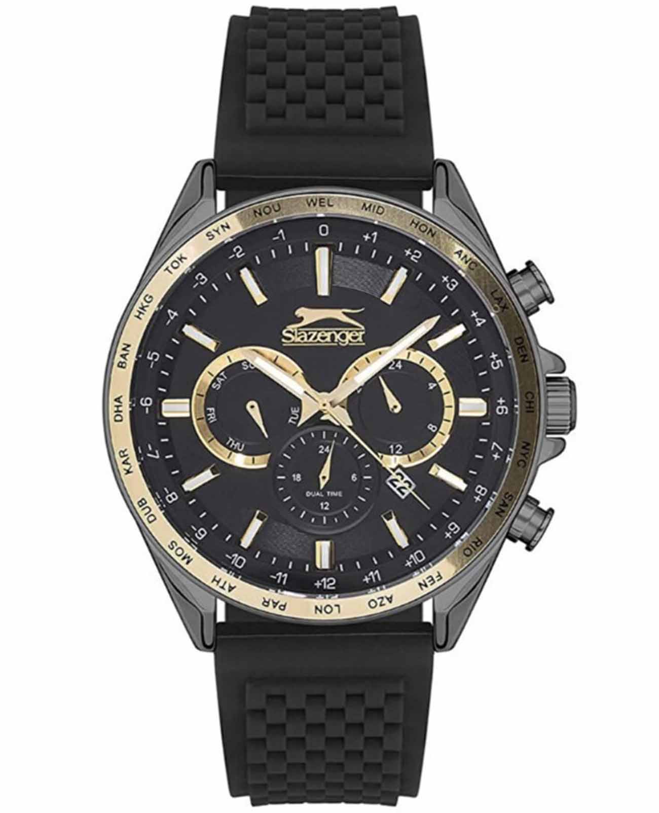 Мужские наручные часы Slazenger SL.09.2179.2.05 — стильный аксессуар с ярко выраженными спортивными чертами, который станет надежным спутником в повседневной жизни. Эти часы оснащены кварцевым механизмом, обеспечивающим высокую точность хода. Металлический корпус с черным IP-покрытиемIP-покрытиеМетод ионного напыления. Демонстрирует повышенную устойчивость к истиранию, окислению и химическим веществам. Под воздействием высокого давления и температуры около 1500°C молекулы металла надёжно соединяются с частицами корпуса часов. в сочетании с черным силиконовый ремешком на классической застежке шириной 22 мм создает гармоничный и современный образ. Диаметр корпуса составляет 45 мм, а толщина — 11 мм, что придает часам стильный и выразительный вид. БезельБезельВнешний ободок, закрепляющий стекло. В спортивных часах так называется поворотное кольцо с делениями на циферблате, выполняет роль таймера – замеряет отрезки времени на шкале. Неподвижный безель – элемент декора. Однонаправленно вращающийся безель на дайверских часах позволяет фиксировать моменты погружения и выныривания на поверхность. с золотистым IP-покрытиемIP-покрытиеМетод ионного напыления. Демонстрирует повышенную устойчивость к истиранию, окислению и химическим веществам. Под воздействием высокого давления и температуры около 1500°C молекулы металла надёжно соединяются с частицами корпуса часов., что придает ему дополнительную прочность и устойчивость к износу. Минеральное стеклоМинеральное стеклоМинеральное стекло представляет собой искусственно выращенный минерал кварца. Такое стекло отличается особой устойчивостью к повреждениям и царапинам. Уступает по некоторым качествам сапфировому стеклу. защищает циферблат от царапин и внешних воздействий, а водозащита уровня WR 50 позволяет не беспокоиться о случайных контактах с водой, будь то дождь или мытье рук. Особенностью данной модели является наличие календаря, отображающего дату и день недели, а также возможность следить за временем во втором часовом поясе. Люминесцентное покрытиеЛюминесцентное покрытиеПозволяет считывать показания времени в темноте. Производители наносят на стрелки, часовые индексы, безель или поверхность циферблата светонакопительный состав, дающий холодное свечение. на стрелках и метках обеспечивает отличную видимость в темноте.