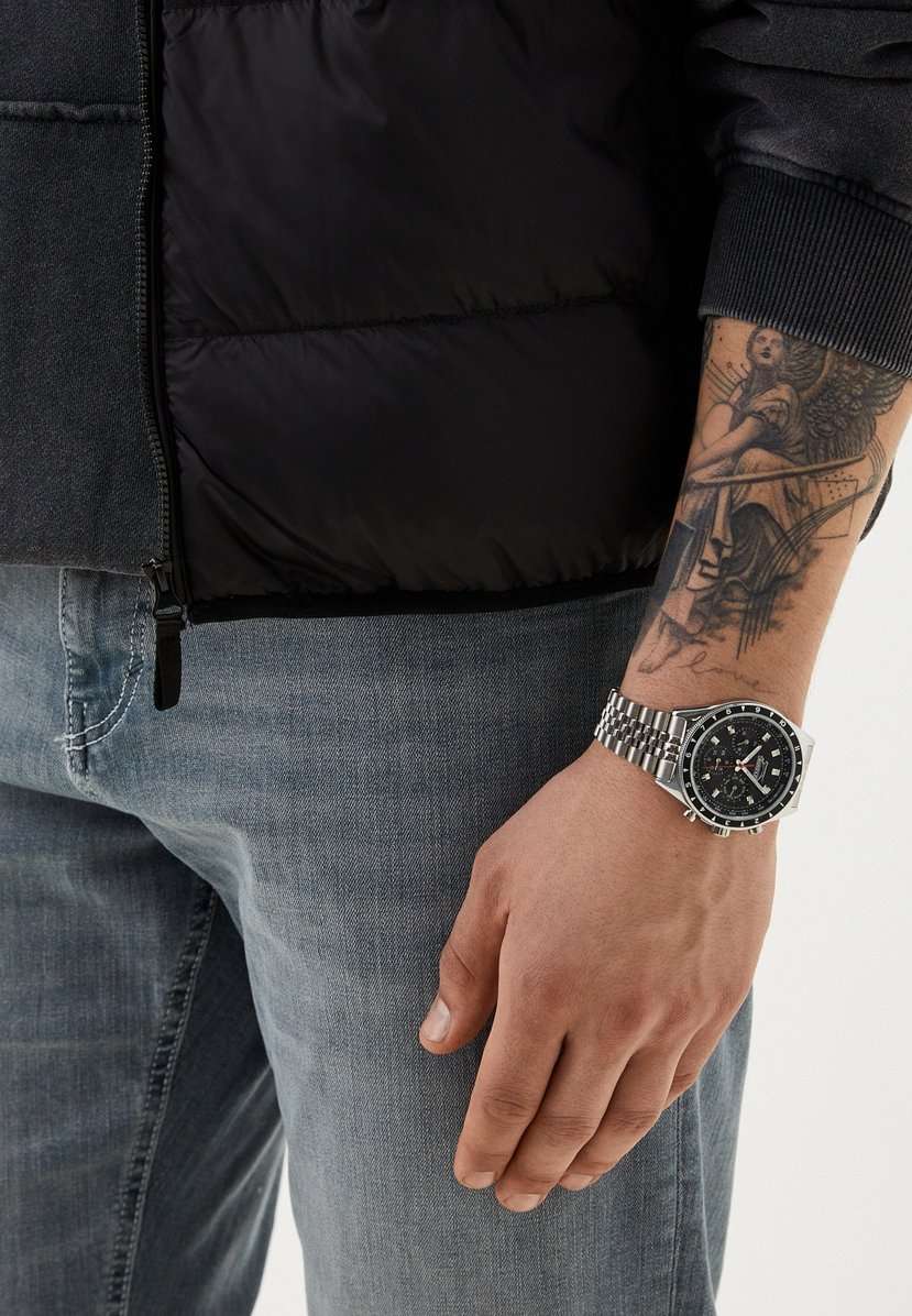 Часы Slazenger SL.09.2248.2.01 — это современная модель с выразительным спортивным характером, идеально подходящая для активного образа жизни. Корпус выполнен из прочного металла, черный циферблат защищён минеральным стекломМинеральное стеклоМинеральное стекло представляет собой искусственно выращенный минерал кварца. Такое стекло отличается особой устойчивостью к повреждениям и царапинам. Уступает по некоторым качествам сапфировому стеклу., устойчивым к царапинам. Часы также оснащены шкалой тахиметраТахиметрРазмеченная шкала, располагается на ободке или безеле часов. Тахиметр позволяет рассчитать скорость на определённом участке пути, расстояние измеряется в километрах или милях., что добавляет им функциональности и может быть полезно для измерения скорости. На безельБезельВнешний ободок, закрепляющий стекло. В спортивных часах так называется поворотное кольцо с делениями на циферблате, выполняет роль таймера – замеряет отрезки времени на шкале. Неподвижный безель – элемент декора. Однонаправленно вращающийся безель на дайверских часах позволяет фиксировать моменты погружения и выныривания на поверхность. нанесено черное IP-покрытиеIP-покрытиеМетод ионного напыления. Демонстрирует повышенную устойчивость к истиранию, окислению и химическим веществам. Под воздействием высокого давления и температуры около 1500°C молекулы металла надёжно соединяются с частицами корпуса часов.. Диаметр корпуса составляет 46 мм, толщина — 11 мм, а ширина браслета — 22 мм. Часы оснащены металлическим браслетом с надежной раскладной застёжкойРаскладная застёжкаТакой тип застёжки используется только на браслетах из металла. Она никогда не раскрывается полностью, происходит разделение на 2 и более частей. Раскладывающая застёжка снизит вероятность потери часов к минимуму., благодаря чему часы удобно сидят на руке и не вызывают дискомфорта даже при длительном ношении. Вес модели составляет 130 грамм. Надёжный кварцевый механизм обеспечивает точность времени, а уровень водозащиты WR 50 позволяет использовать часы в повседневных условиях, не опасаясь случайных брызг или дождя. Для удобства использования в темное время суток предусмотрено люминесцентное покрытиеЛюминесцентное покрытиеПозволяет считывать показания времени в темноте. Производители наносят на стрелки, часовые индексы, безель или поверхность циферблата светонакопительный состав, дающий холодное свечение. стрелок и меток. Дополнительные малые циферблаты показывают дату, день недели и текущее время в 24-часовом формате, что делает использование часов ещё более удобным и функциональным.