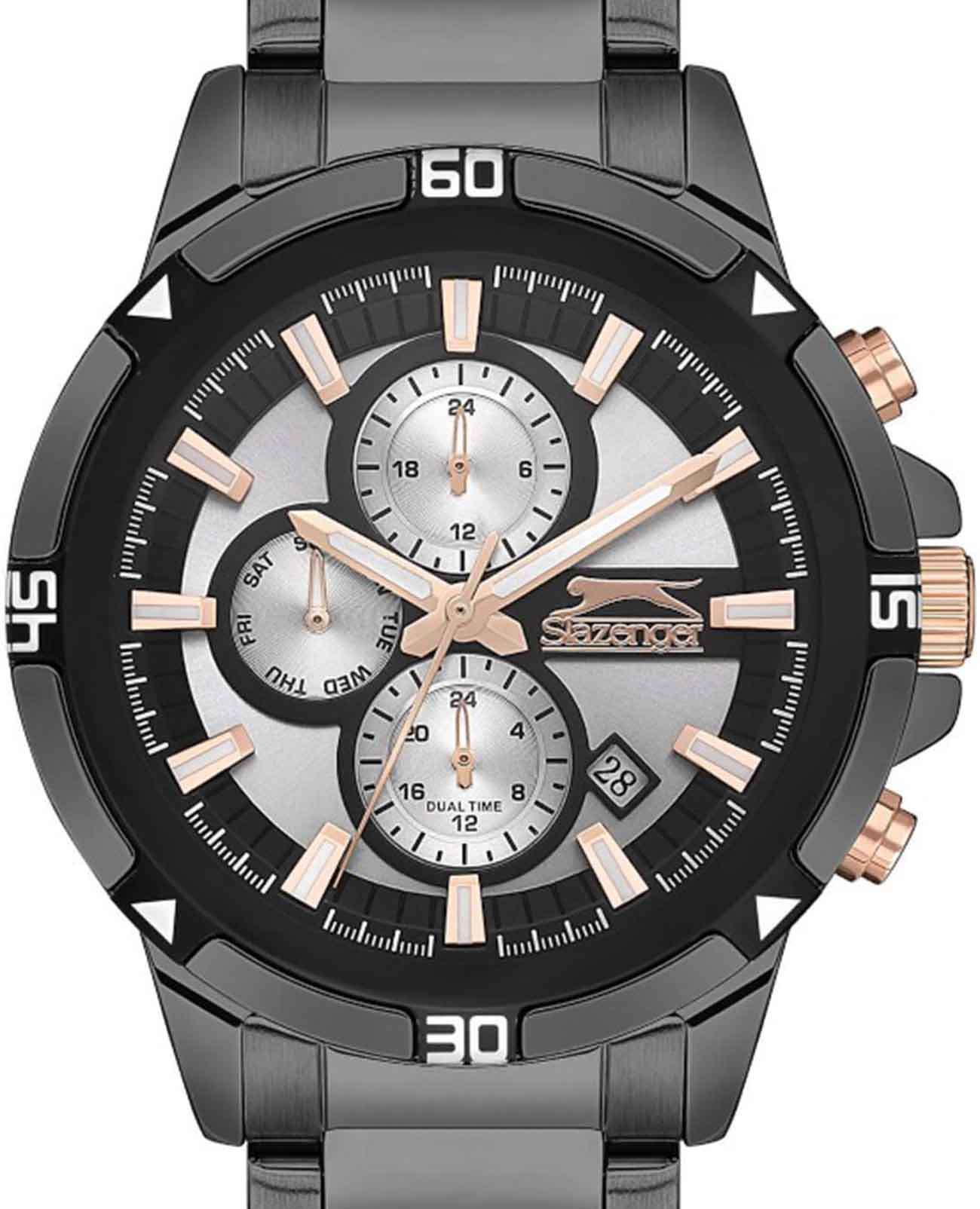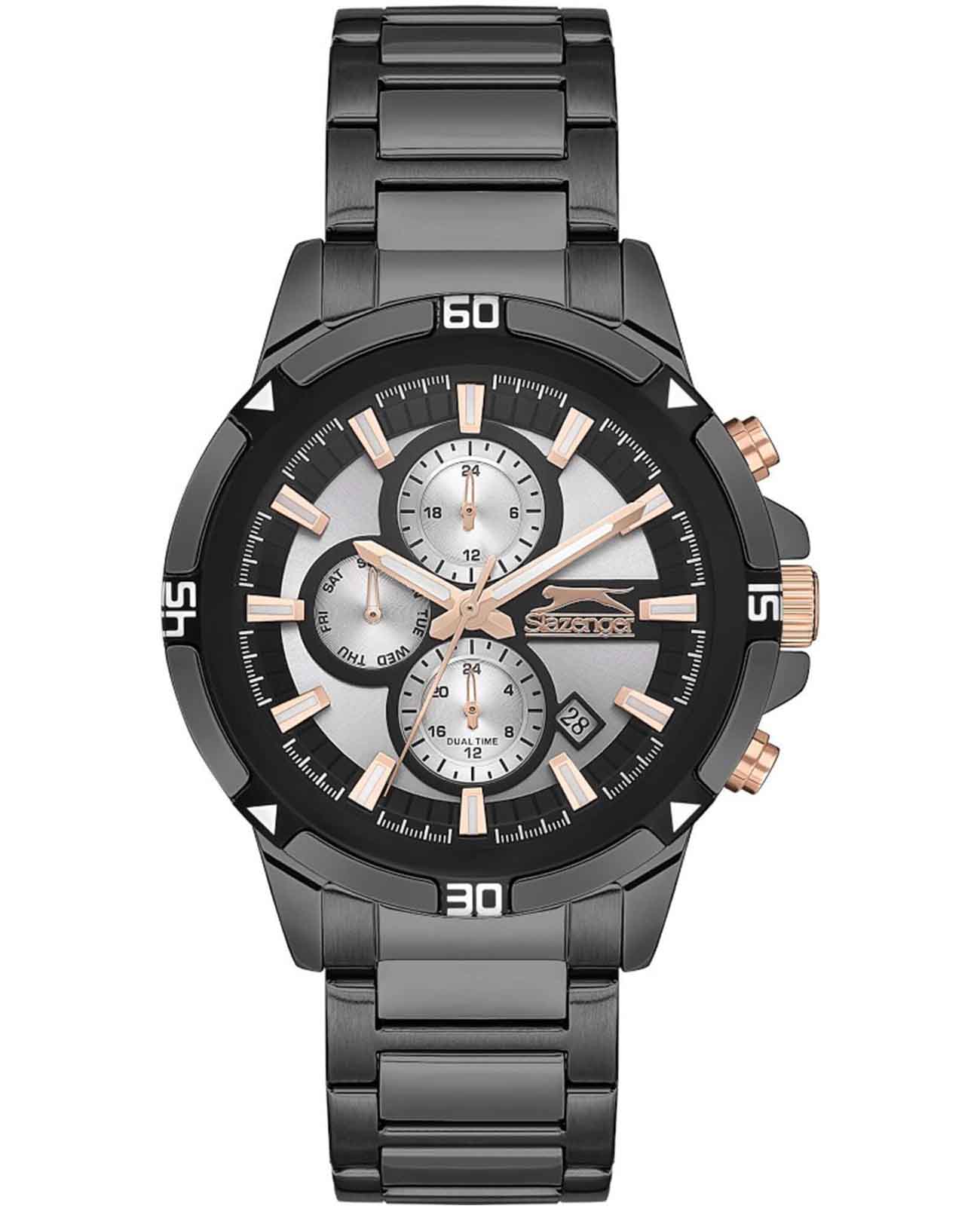Часы Slazenger SL.09.2249.2.03 — это стильная и практичная модель, выполненная в элегантном графитовом цвете. Корпус и браслет изготовлены из металла с IP-покрытиемIP-покрытиеМетод ионного напыления. Демонстрирует повышенную устойчивость к истиранию, окислению и химическим веществам. Под воздействием высокого давления и температуры около 1500°C молекулы металла надёжно соединяются с частицами корпуса часов., что обеспечивает прочность и долговечность. На графитовый безельБезельВнешний ободок, закрепляющий стекло. В спортивных часах так называется поворотное кольцо с делениями на циферблате, выполняет роль таймера – замеряет отрезки времени на шкале. Неподвижный безель – элемент декора. Однонаправленно вращающийся безель на дайверских часах позволяет фиксировать моменты погружения и выныривания на поверхность. частично нанесено черное IP-покрытиеIP-покрытиеМетод ионного напыления. Демонстрирует повышенную устойчивость к истиранию, окислению и химическим веществам. Под воздействием высокого давления и температуры около 1500°C молекулы металла надёжно соединяются с частицами корпуса часов.. Минеральное стеклоМинеральное стеклоМинеральное стекло представляет собой искусственно выращенный минерал кварца. Такое стекло отличается особой устойчивостью к повреждениям и царапинам. Уступает по некоторым качествам сапфировому стеклу. надежно защищает черно-серебристый циферблат от царапин и повреждений. Диаметр корпуса составляет 45 мм, а толщина — 12 мм, благодаря чему часы смотрятся солидно и современно. Модель оснащена кварцевым механизмом, отличающимся точностью и надежностью. На циферблате представлены дополнительные малые циферблаты для отображения второго часового поясаВторой часовой поясФункция, позволяющая отображать время двух часовых поясов одновременно., дня недели и времени в 24-часовом формате, а также имеется отдельное окошко даты. Для удобства использования в темное время суток предусмотрено люминесцентное покрытиеЛюминесцентное покрытиеПозволяет считывать показания времени в темноте. Производители наносят на стрелки, часовые индексы, безель или поверхность циферблата светонакопительный состав, дающий холодное свечение. стрелок и меток. Удобный металлический браслет шириной 22 мм снабжен раскладной застёжкойРаскладная застёжкаТакой тип застёжки используется только на браслетах из металла. Она никогда не раскрывается полностью, происходит разделение на 2 и более частей. Раскладывающая застёжка снизит вероятность потери часов к минимуму., обеспечивающей надежную фиксацию на запястье. Заводная головка оснащена защитой. Водозащита уровня WR 50 позволяет не снимать часы при мытье рук или попадании под дождь. Вес модели составляет 151 грамм.