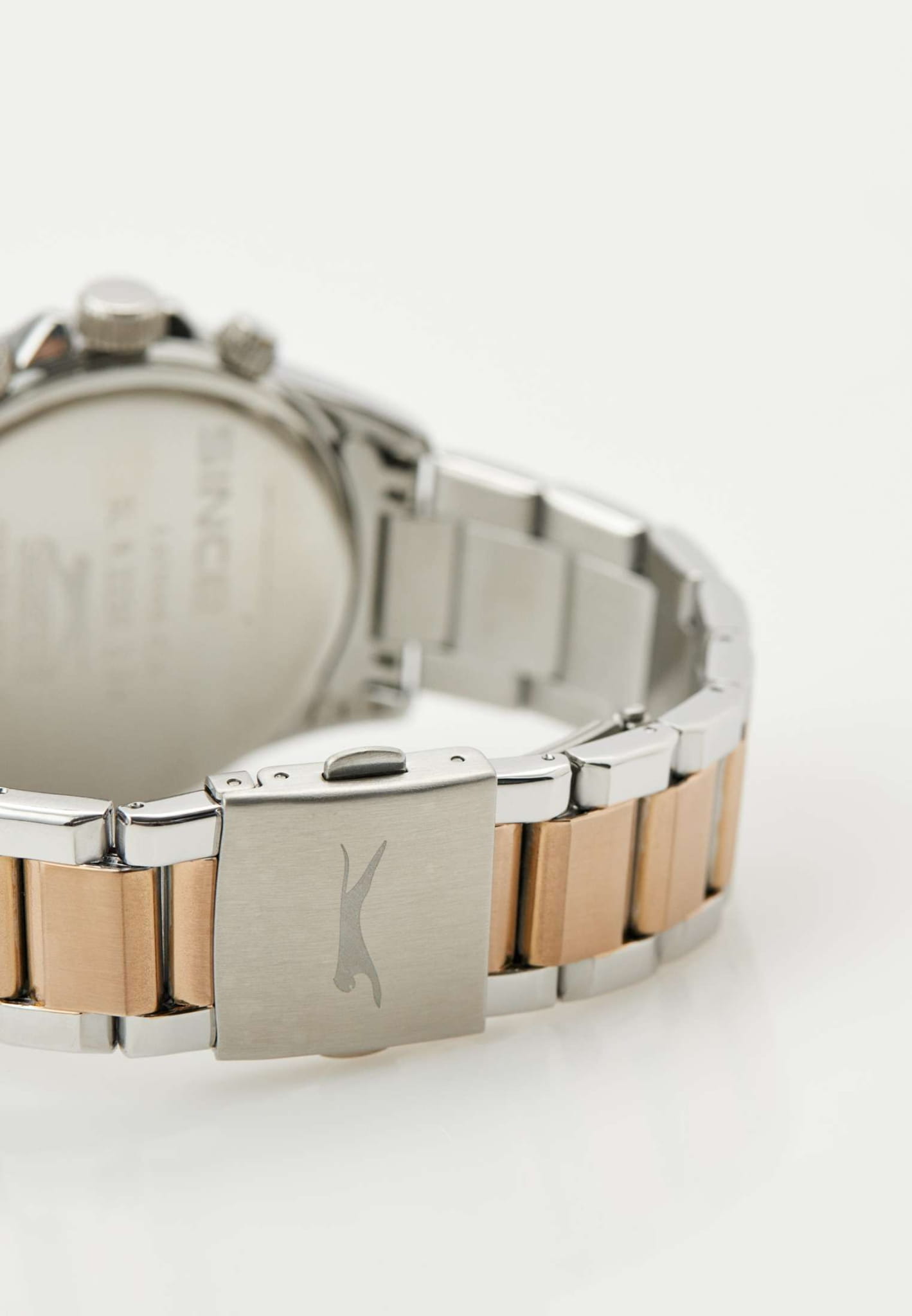 Часы Slazenger SL.09.2250.2.04 — это стильная и практичная модель, выполненная в элегантном серебристом цвете. Корпус изготовлен из металла, а на металлический браслет нанесено частичное розово-золотистое IP-покрытиеIP-покрытиеМетод ионного напыления. Демонстрирует повышенную устойчивость к истиранию, окислению и химическим веществам. Под воздействием высокого давления и температуры около 1500°C молекулы металла надёжно соединяются с частицами корпуса часов., что обеспечивает прочность и долговечность. На безельБезельВнешний ободок, закрепляющий стекло. В спортивных часах так называется поворотное кольцо с делениями на циферблате, выполняет роль таймера – замеряет отрезки времени на шкале. Неподвижный безель – элемент декора. Однонаправленно вращающийся безель на дайверских часах позволяет фиксировать моменты погружения и выныривания на поверхность. нанесено черное IP-покрытиеIP-покрытиеМетод ионного напыления. Демонстрирует повышенную устойчивость к истиранию, окислению и химическим веществам. Под воздействием высокого давления и температуры около 1500°C молекулы металла надёжно соединяются с частицами корпуса часов.. Минеральное стеклоМинеральное стеклоМинеральное стекло представляет собой искусственно выращенный минерал кварца. Такое стекло отличается особой устойчивостью к повреждениям и царапинам. Уступает по некоторым качествам сапфировому стеклу. надежно защищает синий циферблат от царапин и повреждений. Диаметр корпуса составляет 44 мм, а толщина — 11 мм, благодаря чему часы смотрятся солидно и современно. Модель оснащена кварцевым механизмом, отличающимся точностью и надежностью. На циферблате представлены дополнительные малые циферблаты для отображения второго часового поясаВторой часовой поясФункция, позволяющая отображать время двух часовых поясов одновременно., дня недели и времени в 24-часовом формате, а также имеется отдельное окошко даты. Для удобства использования в темное время суток предусмотрено люминесцентное покрытиеЛюминесцентное покрытиеПозволяет считывать показания времени в темноте. Производители наносят на стрелки, часовые индексы, безель или поверхность циферблата светонакопительный состав, дающий холодное свечение. стрелок и меток. Удобный металлический браслет шириной 22 мм снабжен раскладной застёжкойРаскладная застёжкаТакой тип застёжки используется только на браслетах из металла. Она никогда не раскрывается полностью, происходит разделение на 2 и более частей. Раскладывающая застёжка снизит вероятность потери часов к минимуму., обеспечивающей надежную фиксацию на запястье. Заводная головка оснащена защитой. Водозащита уровня WR 50 позволяет не снимать часы при мытье рук или попадании под дождь. Вес модели составляет 152 грамм.