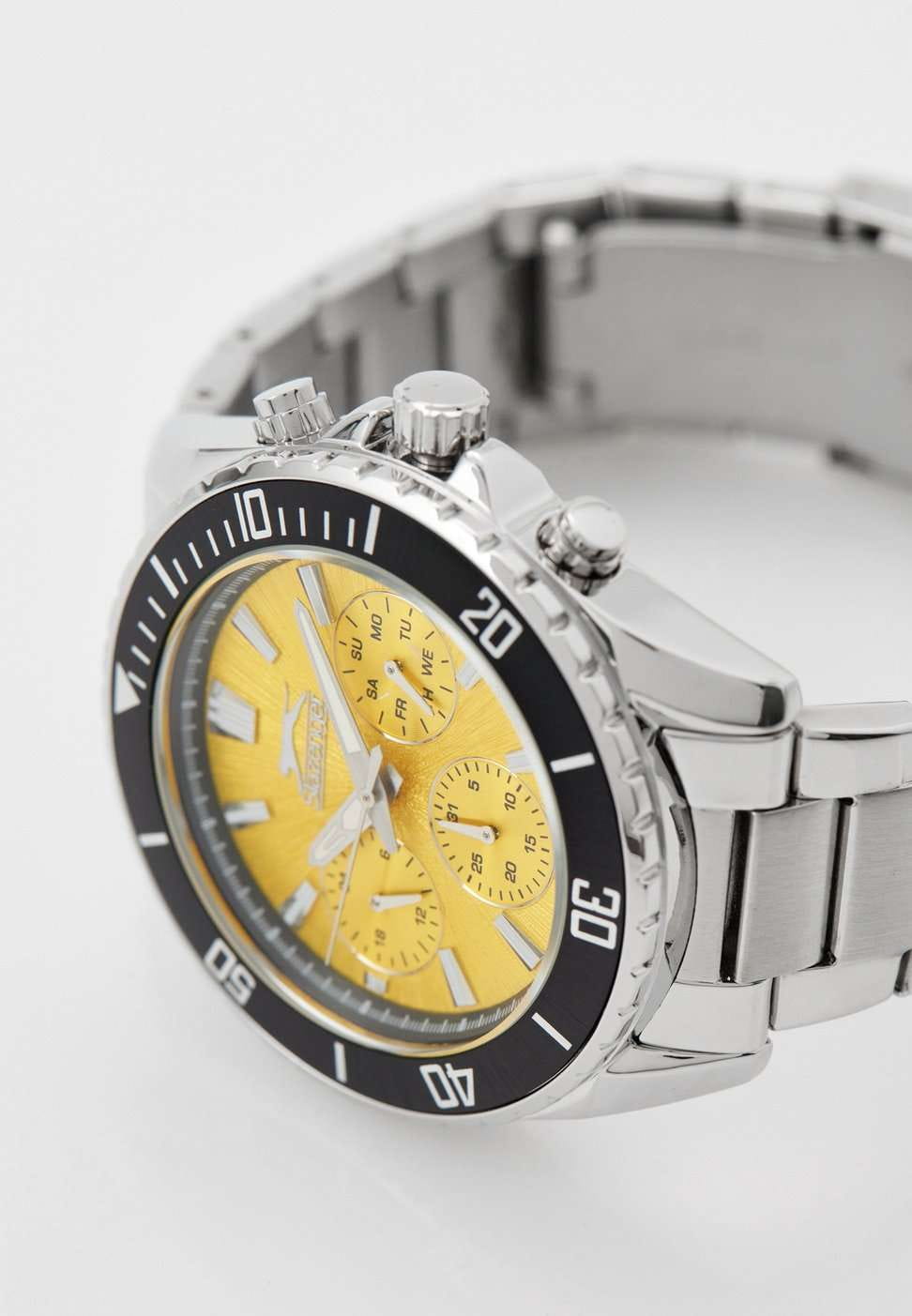 Часы Slazenger SL.09.2273.2.04 – стильный и функциональный аксессуар, который станет достойным дополнением к вашему образу. Модель оснащена надежным кварцевым механизмом, заключенным в корпус из инновационного суперметалла – прочного сплава на основе меди с пониженным содержанием цинка и никеля и специальным покрытием, устойчивым к износу. На безельБезельВнешний ободок, закрепляющий стекло. В спортивных часах так называется поворотное кольцо с делениями на циферблате, выполняет роль таймера – замеряет отрезки времени на шкале. Неподвижный безель – элемент декора. Однонаправленно вращающийся безель на дайверских часах позволяет фиксировать моменты погружения и выныривания на поверхность. нанесено черное IP-покрытиеIP-покрытиеМетод ионного напыления. Демонстрирует повышенную устойчивость к истиранию, окислению и химическим веществам. Под воздействием высокого давления и температуры около 1500°C молекулы металла надёжно соединяются с частицами корпуса часов., что придает аксессуару утончённый и универсальный внешний вид. Желтый циферблат под минеральным стекломМинеральное стеклоМинеральное стекло представляет собой искусственно выращенный минерал кварца. Такое стекло отличается особой устойчивостью к повреждениям и царапинам. Уступает по некоторым качествам сапфировому стеклу. дополнен отдельными счетчиками: 24-часовой указатель времени, индикаторы даты и дня недели. Диаметр корпуса составляет 44 мм, а толщина – 12 мм, что обеспечивает комфортную посадку на запястье и подчёркивает современный стиль часов. Браслет из суперметалла и с раскладной застёжкойРаскладная застёжкаТакой тип застёжки используется только на браслетах из металла. Она никогда не раскрывается полностью, происходит разделение на 2 и более частей. Раскладывающая застёжка снизит вероятность потери часов к минимуму. обеспечивает комфортную посадку. Стрелки и метки с люминесцентным покрытиемЛюминесцентное покрытиеПозволяет считывать показания времени в темноте. Производители наносят на стрелки, часовые индексы, безель или поверхность циферблата светонакопительный состав, дающий холодное свечение. удобно подсвечиваются в темноте после зарядки на свету. Водонепроницаемость 5 АТМ защищает механизм от брызг и дождя, позволяя не беспокоиться о сохранности аксессуара в повседневной жизни. Эта модель станет отличным выбором для ежедневного ношения или особых случаев и прекрасным подарком для мужчины к любому празднику.