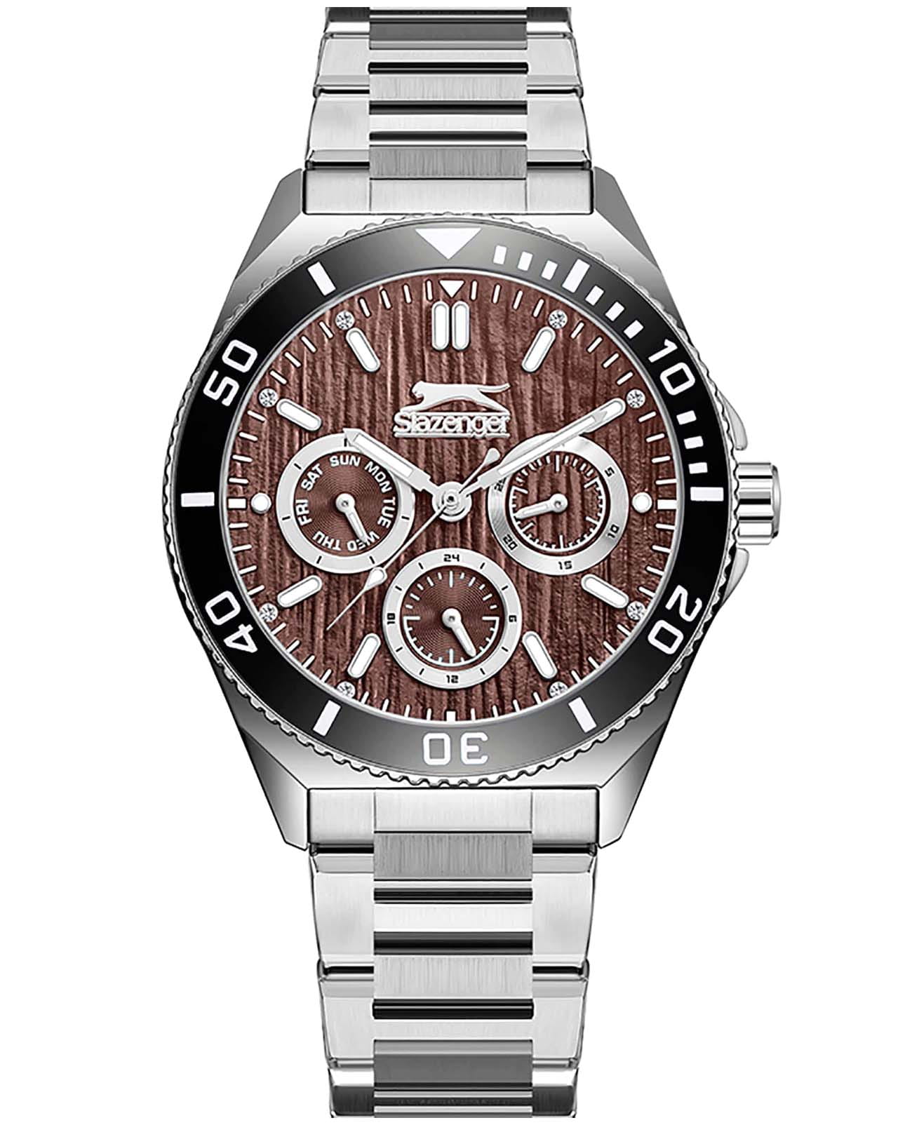 Женские кварцевые часы Slazenger SL.09.2371.2.06 – это сочетание элегантности, современного стиля и надёжности. Изящный корпус из суперметалла серебристого цвета, диаметром 38.5 мм и толщиной 11 мм, подчёркивает утончённость модели и делает их идеальным аксессуаром для любой ситуации – будь то деловая встреча, романтический вечер или повседневные выходы. Циферблат надёжно защищён минеральным стекломМинеральное стеклоМинеральное стекло представляет собой искусственно выращенный минерал кварца. Такое стекло отличается особой устойчивостью к повреждениям и царапинам. Уступает по некоторым качествам сапфировому стеклу., которое устойчиво к механическим повреждениям и сохраняет кристальную прозрачность. БезельБезельВнешний ободок, закрепляющий стекло. В спортивных часах так называется поворотное кольцо с делениями на циферблате, выполняет роль таймера – замеряет отрезки времени на шкале. Неподвижный безель – элемент декора. Однонаправленно вращающийся безель на дайверских часах позволяет фиксировать моменты погружения и выныривания на поверхность. с IP-покрытиемIP-покрытиеМетод ионного напыления. Демонстрирует повышенную устойчивость к истиранию, окислению и химическим веществам. Под воздействием высокого давления и температуры около 1500°C молекулы металла надёжно соединяются с частицами корпуса часов. черного цвета. Браслет из суперметалла удобно облегает запястье и фиксируется с помощью раскладной застёжкиРаскладная застёжкаТакой тип застёжки используется только на браслетах из металла. Она никогда не раскрывается полностью, происходит разделение на 2 и более частей. Раскладывающая застёжка снизит вероятность потери часов к минимуму., обеспечивая надёжность и комфорт в повседневном ношении. Утончённый стиль, внимание к деталям и практичность делают эту модель идеальным выбором для современных женщин, ценящих эстетику и функциональность. Стрелки и метки покрыты люминесцентным покрытиемЛюминесцентное покрытиеПозволяет считывать показания времени в темноте. Производители наносят на стрелки, часовые индексы, безель или поверхность циферблата светонакопительный состав, дающий холодное свечение., обеспечивающим отличную читаемость в темноте. Вынесенный циферблат с 24-х часовым указателем времени украшен фианитами. Водозащита до 30 метров позволит защитить корпус от случайных брызг или капель дождя.