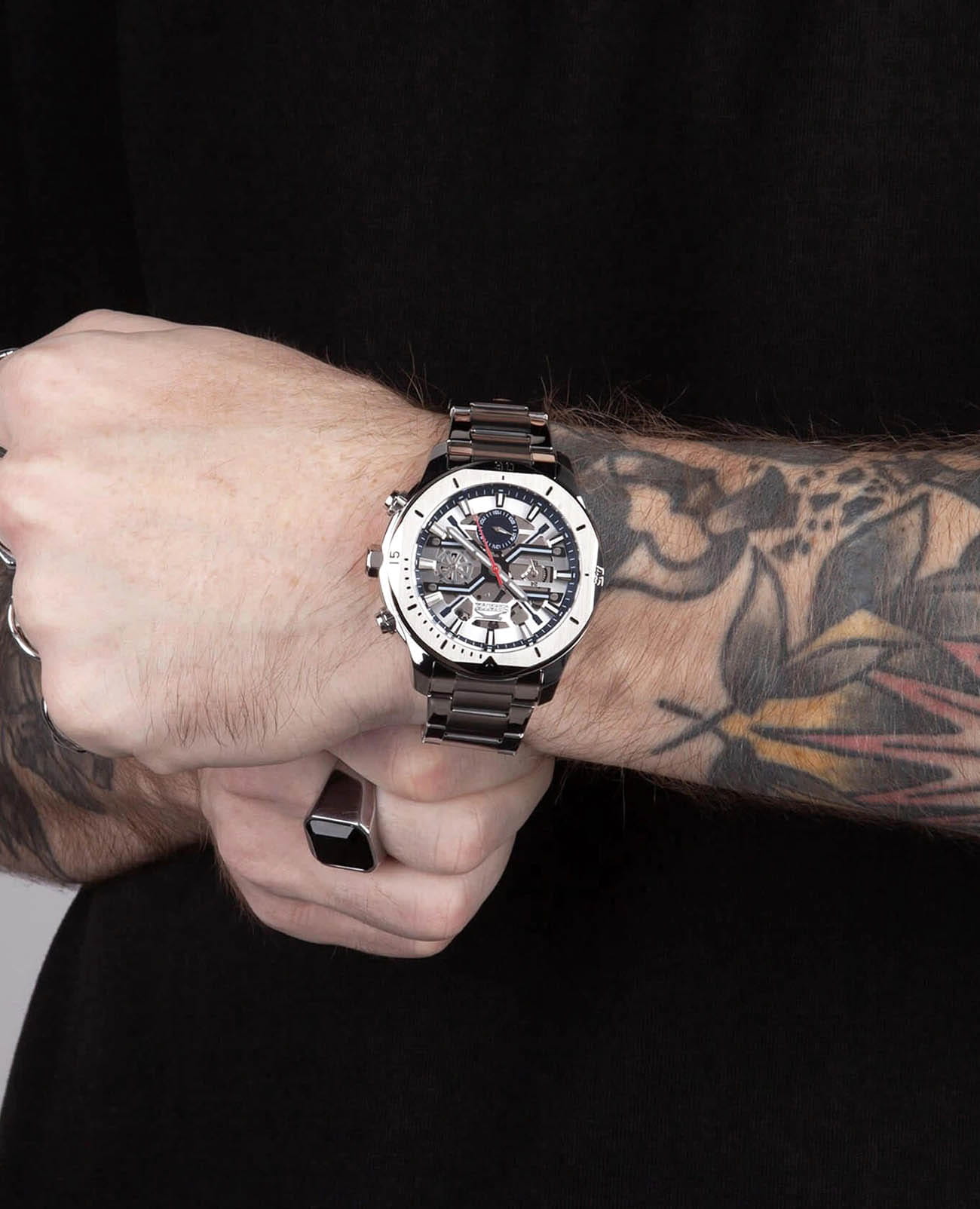Мужские кварцевые часы Slazenger — это выразительный и функциональный аксессуар. Корпус диаметром 44 мм и толщиной 12 мм выполнен из нержавеющей стали 316L. Циферблат синего цвета частично скелетонизирован. Циферблат защищён минеральным стекломМинеральное стеклоМинеральное стекло представляет собой искусственно выращенный минерал кварца. Такое стекло отличается особой устойчивостью к повреждениям и царапинам. Уступает по некоторым качествам сапфировому стеклу.. Механизм — кварцевый калибр VX9JE1. Часы оснащены индикацией дня недели, даты и 12/24-часового формата времени. Завинчивающаяся задняя крышка обеспечивает дополнительную защиту. Часы оснащены стальным браслетом с раскладной застёжкойРаскладная застёжкаТакой тип застёжки используется только на браслетах из металла. Она никогда не раскрывается полностью, происходит разделение на 2 и более частей. Раскладывающая застёжка снизит вероятность потери часов к минимуму.. Водонепроницаемость 50 м позволяет использовать часы в повседневных условиях. Гарантия — 12 месяцев. Идеальный выбор для тех, кто ценит стиль, функциональность и качество.