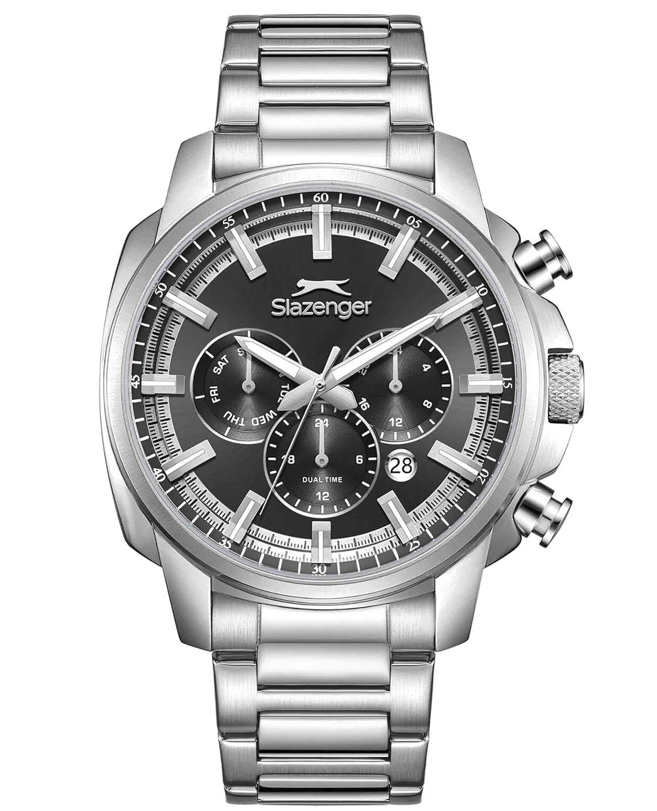 Мужские кварцевые часы Slazenger — это выразительный и функциональный аксессуар. Корпус диаметром 43 мм и толщиной 13,5 мм выполнен из нержавеющей стали 316L. Циферблат чёрного цвета оформлен индексами и стрелками. Циферблат защищён минеральным стекломМинеральное стеклоМинеральное стекло представляет собой искусственно выращенный минерал кварца. Такое стекло отличается особой устойчивостью к повреждениям и царапинам. Уступает по некоторым качествам сапфировому стеклу.. Механизм — кварцевый. Часы оснащены индикацией дня недели, даты, 12/24-часового формата времени и функцией второго часового пояса (GMT)Второй часовой поясФункция, позволяющая отображать время двух часовых поясов одновременно.. Окошко даты расположено между 4 и 5 часами. Часы оснащены стальным браслетом с раскладной застёжкойРаскладная застёжкаТакой тип застёжки используется только на браслетах из металла. Она никогда не раскрывается полностью, происходит разделение на 2 и более частей. Раскладывающая застёжка снизит вероятность потери часов к минимуму.. Водонепроницаемость 100 м позволяет использовать часы для плавания и повседневного ношения. Гарантия — 12 месяцев. Идеальный выбор для тех, кто ценит стиль, функциональность и качество.