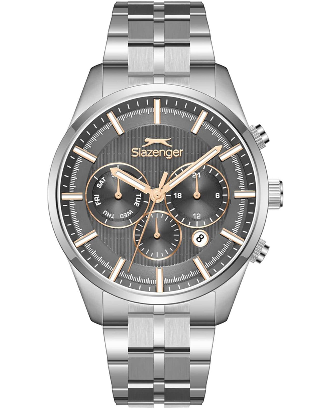 Мужские кварцевые часы Slazenger — это выразительный и функциональный аксессуар. Корпус диаметром 43 мм и толщиной 13 мм выполнен из нержавеющей стали 316L. Циферблат серого цвета оформлен индексами и стрелками. Циферблат защищён минеральным стекломМинеральное стеклоМинеральное стекло представляет собой искусственно выращенный минерал кварца. Такое стекло отличается особой устойчивостью к повреждениям и царапинам. Уступает по некоторым качествам сапфировому стеклу.. Механизм — кварцевый. Часы оснащены индикацией дня недели, даты, 12/24-часового формата времени и функцией второго часового пояса (GMT)Второй часовой поясФункция, позволяющая отображать время двух часовых поясов одновременно.. Окошко даты расположено между 4 и 5 часами. Стрелки и метки с люминесцентным покрытиемЛюминесцентное покрытиеПозволяет считывать показания времени в темноте. Производители наносят на стрелки, часовые индексы, безель или поверхность циферблата светонакопительный состав, дающий холодное свечение., обеспечивающим хорошую читаемость в темноте. Часы оснащены стальным браслетом с раскладной застёжкойРаскладная застёжкаТакой тип застёжки используется только на браслетах из металла. Она никогда не раскрывается полностью, происходит разделение на 2 и более частей. Раскладывающая застёжка снизит вероятность потери часов к минимуму.. Водонепроницаемость 100 м позволяет использовать часы для плавания и повседневного ношения. Гарантия — 12 месяцев. Идеальный выбор для тех, кто ценит стиль, функциональность и качество.