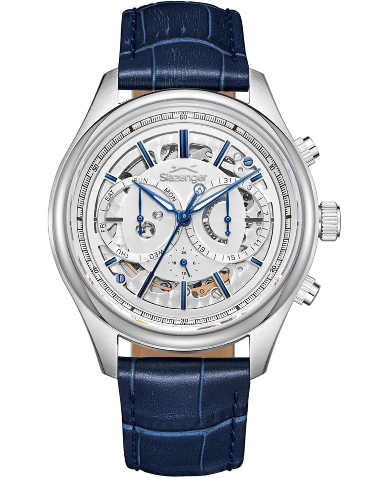 Мужские механические часы с автоподзаводом Slazenger — это выразительный и функциональный аксессуар. Корпус диаметром 41 мм и толщиной 16 мм выполнен из нержавеющей стали 316L. Циферблат серебристого цвета частично скелетонизирован, что позволяет наблюдать за работой механизма. Циферблат защищён минеральным стекломМинеральное стеклоМинеральное стекло представляет собой искусственно выращенный минерал кварца. Такое стекло отличается особой устойчивостью к повреждениям и царапинам. Уступает по некоторым качествам сапфировому стеклу.. Механизм — автоматический. Часы оснащены индикацией дня недели, даты и 12/24-часового формата времени. Прозрачная задняя крышка открывает вид на декорированный механизм. Часы оснащены кожаным ремешком с застёжкой «бабочка» с кнопкамиЗастёжка "бабочка"Такой вид застёжки дополняется предохранителями, помогающими избежать случайного раскрытия браслета. Обладают изящным исполнением. . Водонепроницаемость 100 м позволяет использовать часы для плавания и повседневного ношения. Гарантия — 12 месяцев. Идеальный выбор для тех, кто ценит стиль, функциональность и качество.