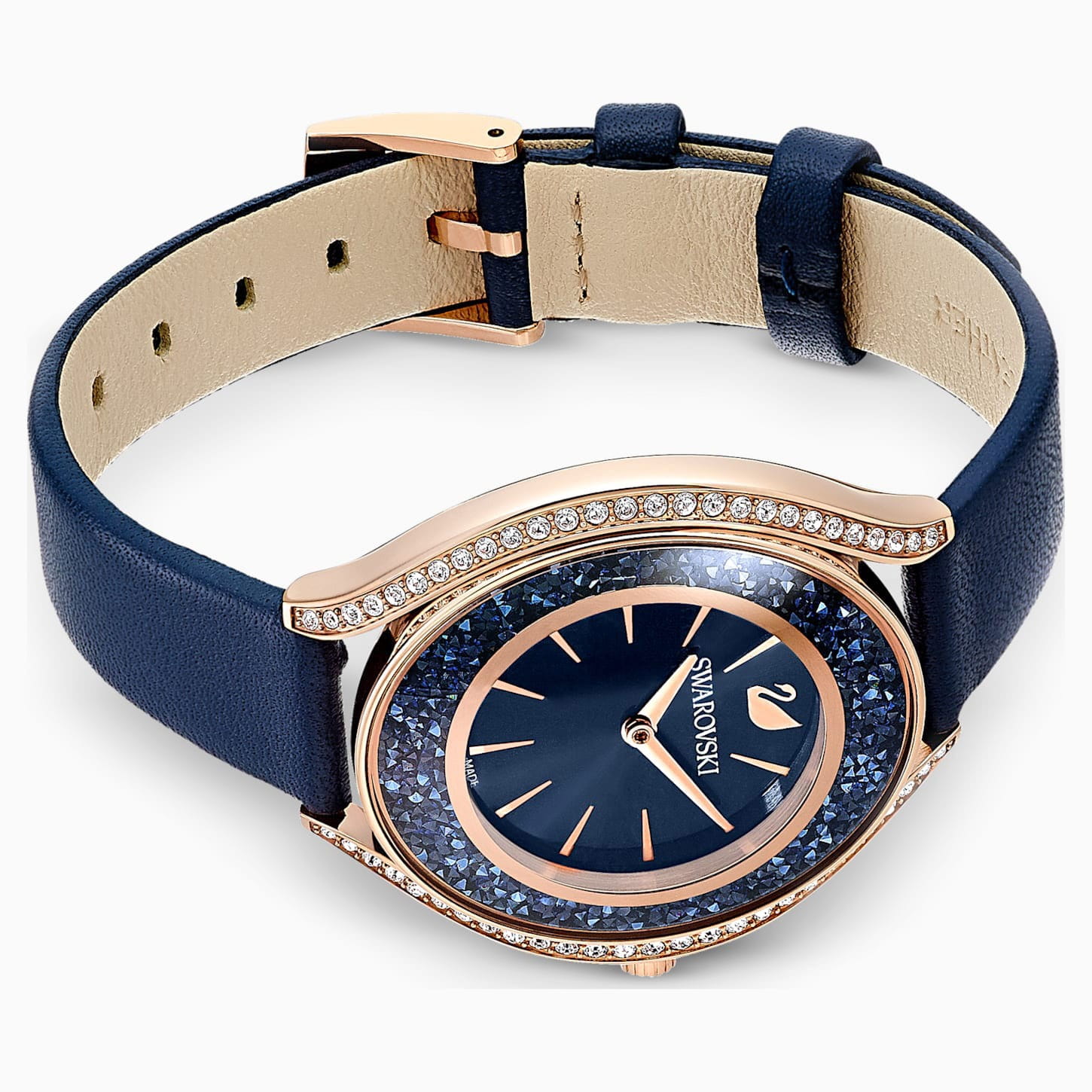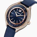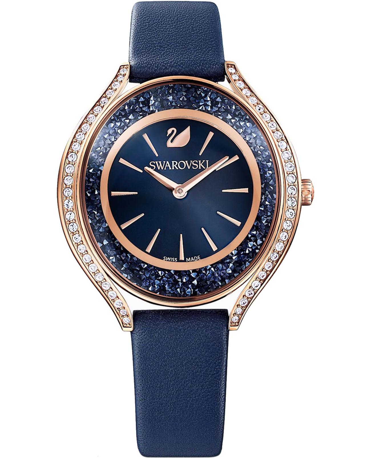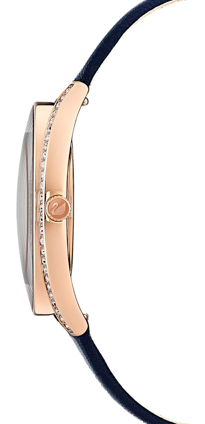 Swarovski 5519447 — элегантные женские часы из коллекции Crystalline Aura, сочетающие изысканный дизайн с высоким качеством. Корпус диаметром 35,5 мм выполнен из нержавеющей стали с розовым PVD-покрытиемPVDУльтратонкое покрытие наносится в технике вакуумного напыления, сочетает в себе нитрид титана особой прочности со слоем золота или оксида хрома. Несёт в себе декоративную или защитную функцию., что обеспечивает долговечность и элегантный вид. Минеральное стеклоМинеральное стеклоМинеральное стекло представляет собой искусственно выращенный минерал кварца. Такое стекло отличается особой устойчивостью к повреждениям и царапинам. Уступает по некоторым качествам сапфировому стеклу. защищает циферблат от царапин. Корпус украшен более чем 1300 кристаллами Swarovski, создающими роскошный блеск. Синий циферблат с изящными золотистыми метками и стрелками подчёркивает утончённость дизайна. Логотип Swarovski в виде лебедя расположен на отметке «12 часов». Часы оснащены швейцарским кварцевым механизмом, обеспечивающим точный ход. Ремешок из итальянской телячьей кожи синего цвета гарантирует комфортное ношение. Классическая застёжка обеспечивает надёжную фиксацию. Водозащита до 5 ATM (50 метров) делает часы подходящими для повседневного использования. Swarovski 5519447 — это идеальный выбор для женщин, ценящих утончённый стиль, функциональность и комфорт.