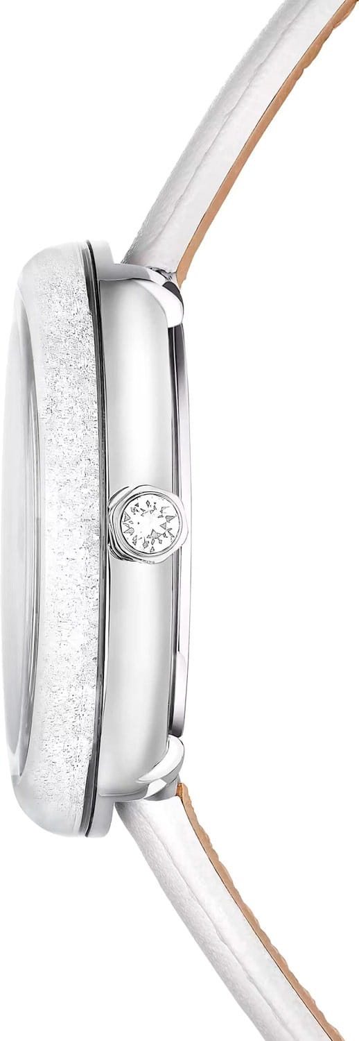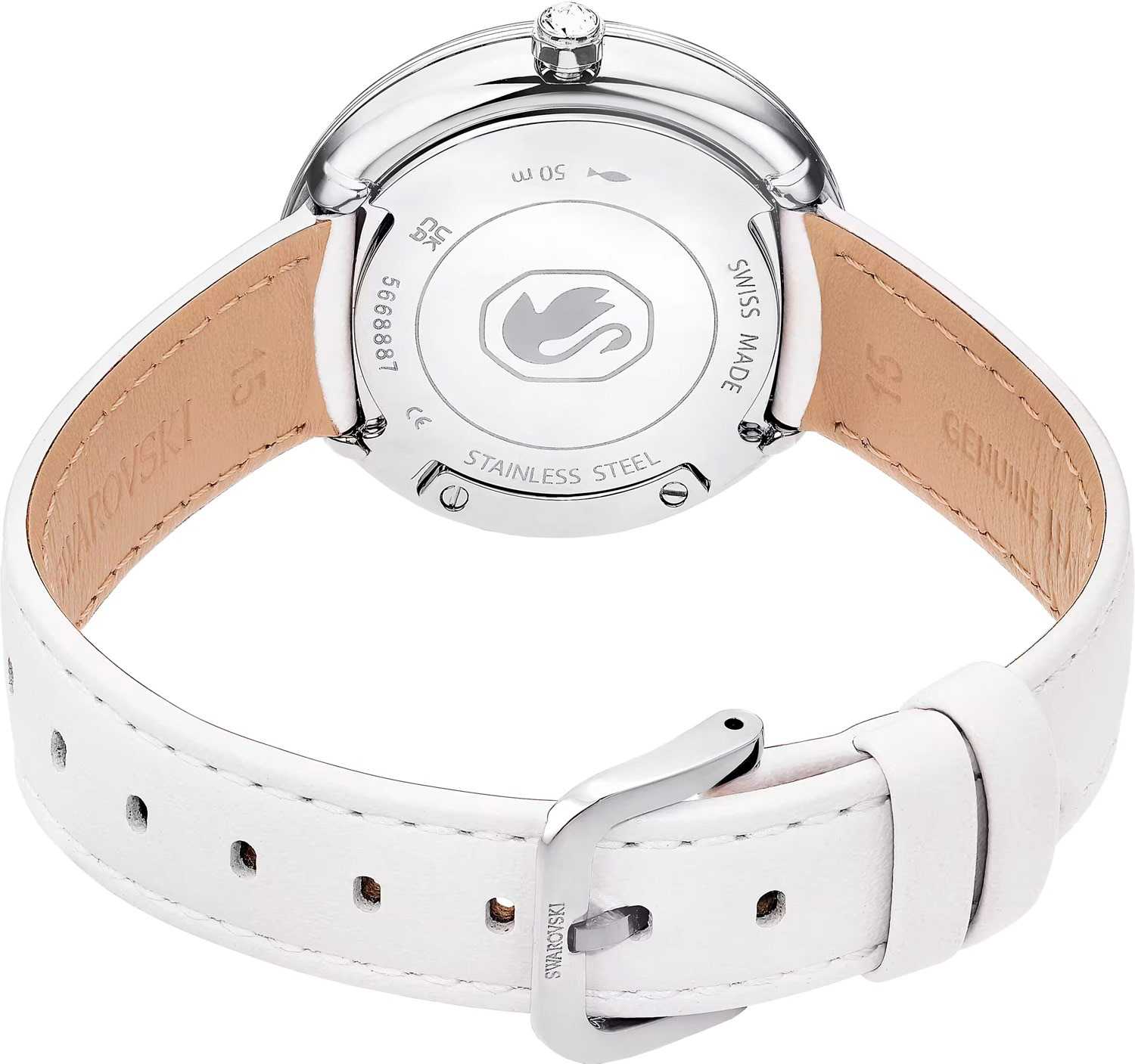 Элегантные швейцарские часы Swarovski 5668887 станут идеальным аксессуаром для тех, кто ценит стиль и изысканность. Эти часы оснащены кварцевым механизмом, что гарантирует точность и надежность в повседневной жизни. Корпус из стали имеет классическую круглую форму, а белоснежный циферблат, лишенный меток, создает чистый и утонченный образ. Особое внимание привлекают 3460 прозрачных кристаллов Swarovski, которые украшают циферблат, корпус и безельБезельВнешний ободок, закрепляющий стекло. В спортивных часах так называется поворотное кольцо с делениями на циферблате, выполняет роль таймера – замеряет отрезки времени на шкале. Неподвижный безель – элемент декора. Однонаправленно вращающийся безель на дайверских часах позволяет фиксировать моменты погружения и выныривания на поверхность., создавая ослепительный блеск. В положении 12 часов расположился культовый логотип Swarovski в виде лебедя, подчеркивающий уникальность дизайна. Мечевидные стрелки в стиле Sword добавляют элегантности, а граненая заводная головка с кристаллом круглой огранки завершает образ. Ремешок из натуральной итальянской телячьей кожи белого цвета обеспечивает комфортное ношение и дополняет общий стиль часов. Классическая застежка с логотипом Swarovski гарантирует надежную фиксацию. Сапфировое стеклоСапфировое стеклоПрочный и надёжный материал из кристалла сапфира синтетического происхождения, характеризующийся особой твёрдостью и устойчивостью к царапинам и повреждениям. защищает часы от царапин и других повреждений, а водозащита 50WR позволяет не беспокоиться о случайных попаданиях воды. Диаметр корпуса составляет 33 мм, а длина ремешка — 16,5 см, что делает их идеальными для изящного запястья.