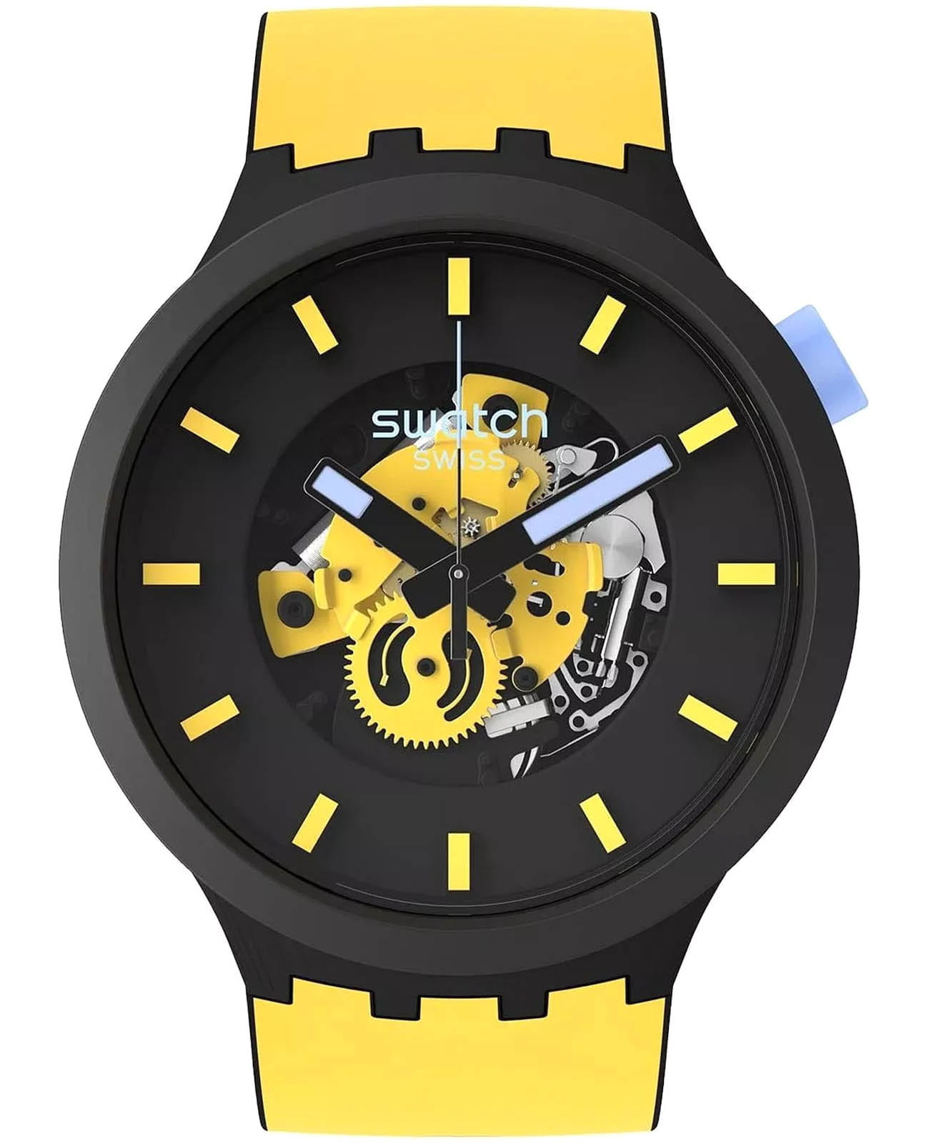 Часы Swatch SB03B109 — это стильный и современный аксессуар для тех, кто ценит лёгкость и комфорт. Часы идеально подойдут как для мужчин, так и для женщин. Центральный элемент этой модели часов — большой корпус со стеклом из био-материала, украшенный 3D-циферблатом с принтами на индексах. Корпус из биокерамикиБиокерамикаБиокерамика — это материал, который на две трети состоит из керамики, на одну треть — из биопластика. Он сочетает в себе лучшие качества обоих материалов и обладает прочностью и шелковистой на ощупь текстурой., а также силиконовые тренчики подчеркивают желтый принт на силиконовом ремешке этих огромных часов. На часовую, минутную стрелки нанесено люминесцентное покрытиеЛюминесцентное покрытиеПозволяет считывать показания времени в темноте. Производители наносят на стрелки, часовые индексы, безель или поверхность циферблата светонакопительный состав, дающий холодное свечение., которое светится в темноте, создавая необычное изображение. Водозащита 30 метров делает часы практичными для повседневного использования. Эти часы подойдут для повседневного ношения и станут ярким акцентом в вашем наряде.