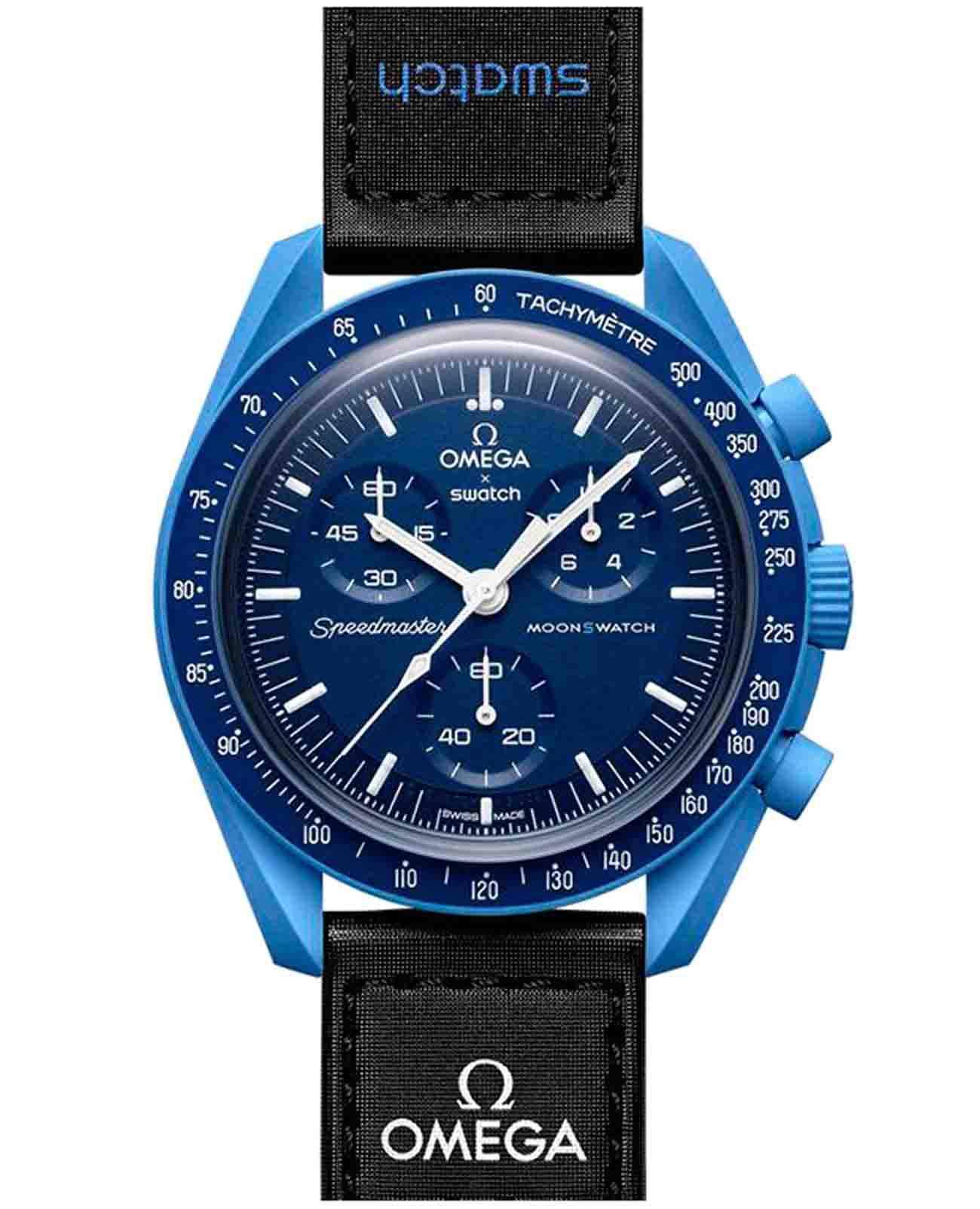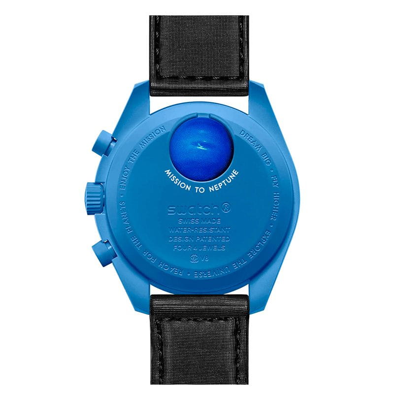 Часы Swatch Bioceramic Moonswatch MISSION TO NEPTUNE SO33N100 — это стильный и современный аксессуар для тех, кто ценит лёгкость и комфорт. Корпус диаметром 42 мм и пряжка этих уникальных часов изготовлены из биокерамикиБиокерамикаБиокерамика — это материал, который на две трети состоит из керамики, на одну треть — из биопластика. Он сочетает в себе лучшие качества обоих материалов и обладает прочностью и шелковистой на ощупь текстурой., а также ремешок VELCRO®. Модель оснащена синим циферблатом и биокерамическим безелемБезельВнешний ободок, закрепляющий стекло. В спортивных часах так называется поворотное кольцо с делениями на циферблате, выполняет роль таймера – замеряет отрезки времени на шкале. Неподвижный безель – элемент декора. Однонаправленно вращающийся безель на дайверских часах позволяет фиксировать моменты погружения и выныривания на поверхность. на который нанесена шкала тахиметраТахиметрРазмеченная шкала, располагается на ободке или безеле часов. Тахиметр позволяет рассчитать скорость на определённом участке пути, расстояние измеряется в километрах или милях.. Общими характеристиками всех часов в данной коллекции являются конструкция стекла из биоматериала, «скрытая» в центре кристалла буква "S", тонкий и изящный круговой узор на внешнем кольце циферблата и заглубленных мини-циферблатах, гладкие ушки с заостренными концами, культовая точка над отметкой 90 на тахиметрической шкале безеля и, конечно же, уникальный материал – биокерамика. Индексы, часовая, минутная и секундная стрелки хронографаХронографФункция позволяет измерять отрезки времени с особой точностью: часы, минуты, секунды. Верным признаком хронографа является наличие на циферблате 3 дополнительных окошек-счётчиков. покрыты люминесцентным покрытиемЛюминесцентное покрытиеПозволяет считывать показания времени в темноте. Производители наносят на стрелки, часовые индексы, безель или поверхность циферблата светонакопительный состав, дающий холодное свечение. Super-LumiNova® класса А, благодаря чему они светятся в темноте. Циферблаты каждых часов в данной коллекции украшены фирменным знаком OMEGA X Swatch, культовым логотипом Speedmaster и логотипом MoonSwatch.