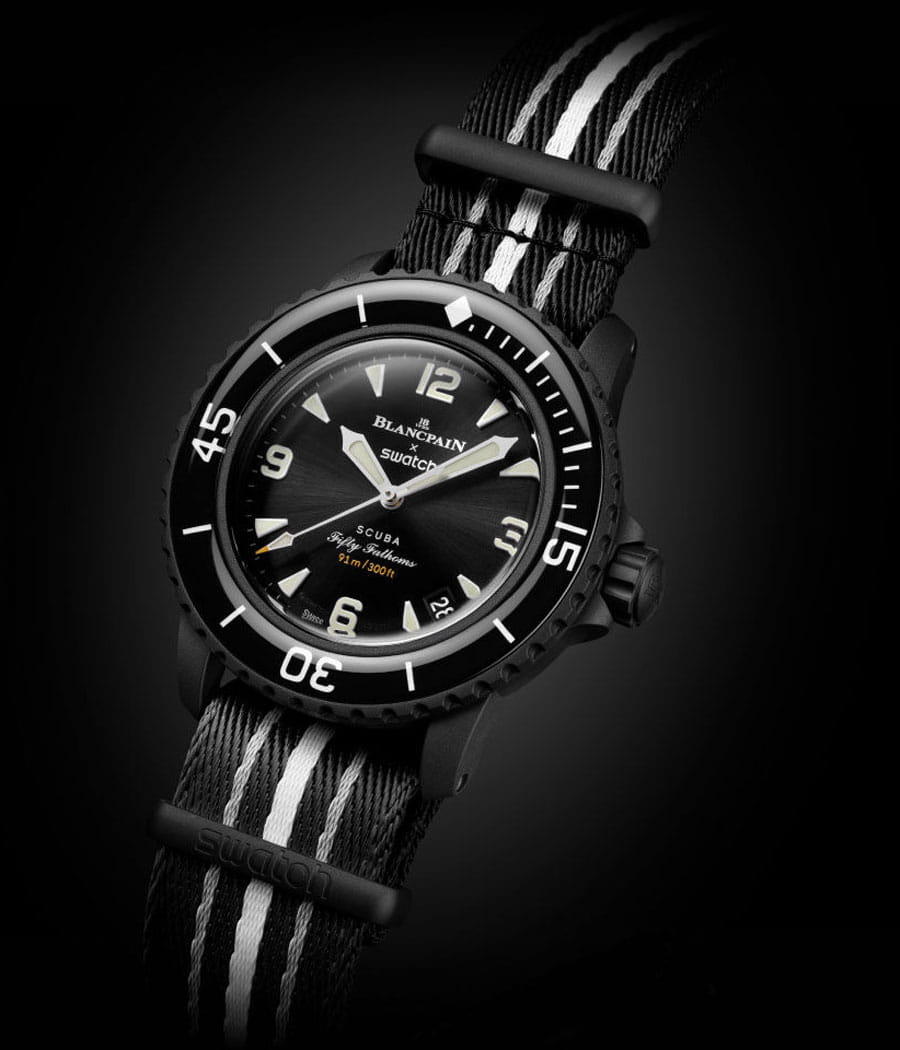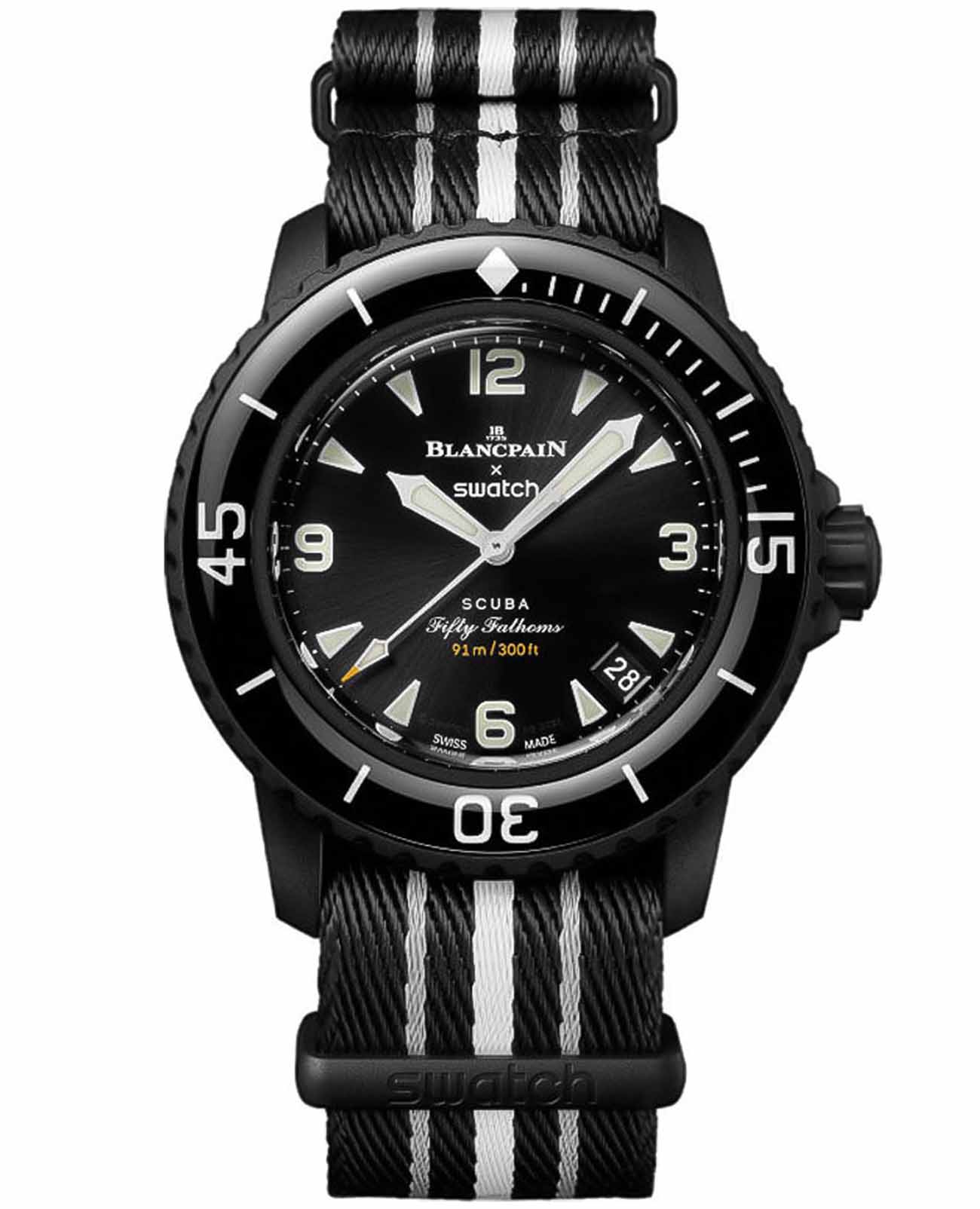 Часы Swatch SO35B400S "Ocean of Storms" из коллекции Bioceramic Scuba Fifty Fathoms - стильная и функциональная модель, вдохновленная легендарными дайверскими часами. Корпус черный биокерамический диаметром 42,3 мм, автоматический механизм SISTEM51 с 90-часовым запасом хода. Черный циферблат с солнечной отделкой, водонепроницаемость 91 м, стрелки с люминесцентным покрытиемЛюминесцентное покрытиеПозволяет считывать показания времени в темноте. Производители наносят на стрелки, часовые индексы, безель или поверхность циферблата светонакопительный состав, дающий холодное свечение.. Однонаправленный вращающийся безельБезельВнешний ободок, закрепляющий стекло. В спортивных часах так называется поворотное кольцо с делениями на циферблате, выполняет роль таймера – замеряет отрезки времени на шкале. Неподвижный безель – элемент декора. Однонаправленно вращающийся безель на дайверских часах позволяет фиксировать моменты погружения и выныривания на поверхность., подсветка Super-LumiNova®, ремешок NATO из переработанных рыболовных сетей. Часы отличаются прочностью, экологичностью и отличной читаемостью. Прозрачная задняя крышка демонстрирует механизм с иллюстрацией лунного Океана Бурь. Модель сочетает классический стиль дайверских часов и инновационный подход Swatch.