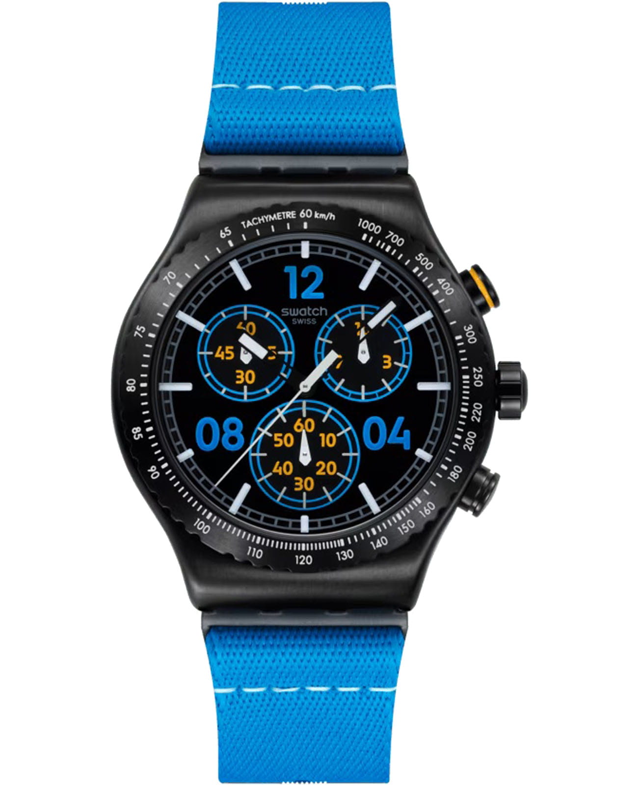 Мужские наручные часы-хронографХронографФункция позволяет измерять отрезки времени с особой точностью: часы, минуты, секунды. Верным признаком хронографа является наличие на циферблате 3 дополнительных окошек-счётчиков. Swatch MOMENTS IN BLUE YVB100 — это стильный и современный аксессуар для тех, кто ценит лёгкость и комфорт. Корпус выполнен из нержавеющей стали с PVD-покрытиемPVDУльтратонкое покрытие наносится в технике вакуумного напыления, сочетает в себе нитрид титана особой прочности со слоем золота или оксида хрома. Несёт в себе декоративную или защитную функцию. черного цвета, диаметром 43 мм и толщиной 12.67 мм, что обеспечивает долговечность и утончённый внешний вид. Циферблат защищён минеральным стекломМинеральное стеклоМинеральное стекло представляет собой искусственно выращенный минерал кварца. Такое стекло отличается особой устойчивостью к повреждениям и царапинам. Уступает по некоторым качествам сапфировому стеклу., устойчивым к повреждениям. Модель оснащена кварцевым механизмом, обеспечивающим высокую точность хода. Шкала тахиметраТахиметрРазмеченная шкала, располагается на ободке или безеле часов. Тахиметр позволяет рассчитать скорость на определённом участке пути, расстояние измеряется в километрах или милях. на безелеБезельВнешний ободок, закрепляющий стекло. В спортивных часах так называется поворотное кольцо с делениями на циферблате, выполняет роль таймера – замеряет отрезки времени на шкале. Неподвижный безель – элемент декора. Однонаправленно вращающийся безель на дайверских часах позволяет фиксировать моменты погружения и выныривания на поверхность.. Стрелки и метки с люминесцентным покрытиемЛюминесцентное покрытиеПозволяет считывать показания времени в темноте. Производители наносят на стрелки, часовые индексы, безель или поверхность циферблата светонакопительный состав, дающий холодное свечение.. Тканевый ремешок на стандартной застёжке гармонично дополняет корпус и обеспечивает комфортное ношение. Водозащита 30 метров делает часы практичными для повседневного использования. Эти часы подойдут для повседневного ношения и станут ярким акцентом в вашем наряде.