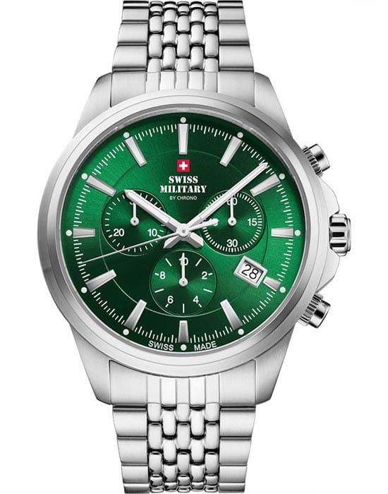 Часы Swiss Military SM34107.04 — это хронограф, сочетающий стиль и функциональность. Корпус диаметром 40 мм выполнен из нержавеющей стали, что обеспечивает долговечность и надёжность. Циферблат с солнечным узором украшен белыми люминесцентными индексамиЛюминесцентное покрытиеПозволяет считывать показания времени в темноте. Производители наносят на стрелки, часовые индексы, безель или поверхность циферблата светонакопительный состав, дающий холодное свечение. и стрелками, что позволяет легко считывать время в любых условиях. Защиту циферблата обеспечивает сапфировое стеклоСапфировое стеклоПрочный и надёжный материал из кристалла сапфира синтетического происхождения, характеризующийся особой твёрдостью и устойчивостью к царапинам и повреждениям., устойчивое к царапинам. Водозащита до 10 ATM делает часы подходящими для плавания и других водных активностей. Швейцарский кварцевый механизм обеспечивает высокую точность измерения времени и функции хронографа. Стальной браслет на раскладной застёжкеРаскладная застёжкаТакой тип застёжки используется только на браслетах из металла. Она никогда не раскрывается полностью, происходит разделение на 2 и более частей. Раскладывающая застёжка снизит вероятность потери часов к минимуму. гарантирует комфортное ношение и надёжную фиксацию. Часы сопровождаются 5-летней международной гарантией, подтверждающей их высокое качество и надёжность. Swiss Military — это идеальный выбор для мужчин, которые ценят швейцарское качество и ведут активный образ жизни.