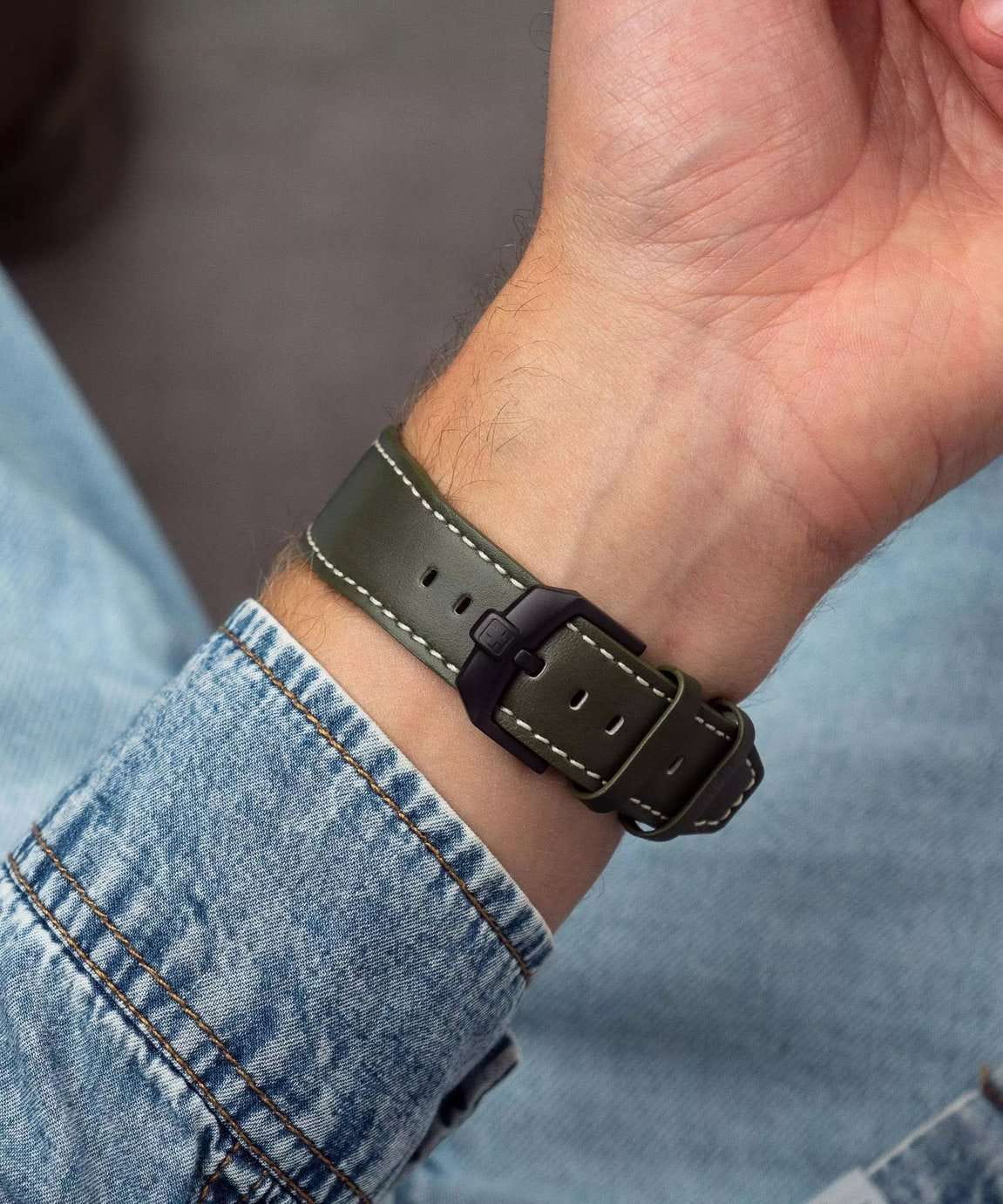 Мужские кварцевые часы Swiss Military Hanowa — это прочный и стильный аксессуар, вдохновлённый классическими полевыми моделями. Корпус диаметром 42 мм выполнен из нержавеющей стали с PVD-покрытиемPVDУльтратонкое покрытие наносится в технике вакуумного напыления, сочетает в себе нитрид титана особой прочности со слоем золота или оксида хрома. Несёт в себе декоративную или защитную функцию.. Циферблат чёрного цвета оформлен индексами и стрелками. Циферблат защищён сапфировым стекломСапфировое стеклоПрочный и надёжный материал из кристалла сапфира синтетического происхождения, характеризующийся особой твёрдостью и устойчивостью к царапинам и повреждениям.. Механизм — швейцарское кварцевое движение Ronda 515 (Swiss Made). Часы оснащены зелёным кожаным ремешком с матовой текстурой на классической пряжке. Водонепроницаемость 100 м позволяет использовать часы для плавания и повседневного ношения. Идеальный выбор для тех, кто ценит швейцарское качество и надёжность.