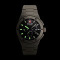 Мужские швейцарские часы с хронографомХронографФункция позволяет измерять отрезки времени с особой точностью: часы, минуты, секунды. Верным признаком хронографа является наличие на циферблате 3 дополнительных окошек-счётчиков. Swiss Military Hanowa Sidewinder Ceramic SMWGI0002285 станут отличным выбором для тех, кто ценит стильный дизайн и функциональность в одном аксессуаре. Корпус диаметром 43 мм сбалансирован и элегантен. Сапфировое стеклоСапфировое стеклоПрочный и надёжный материал из кристалла сапфира синтетического происхождения, характеризующийся особой твёрдостью и устойчивостью к царапинам и повреждениям. с антибликовым покрытием защищает циферблат от царапин и обеспечивает отличную читаемость при любом освещении. Керамический браслет с застежкой бабочкаЗастёжка "бабочка"Такой вид застёжки дополняется предохранителями, помогающими избежать случайного раскрытия браслета. Обладают изящным исполнением. идеально дополняют дизайн часов, обеспечивая комфортное ношение. Люминесцентное покрытиеЛюминесцентное покрытиеПозволяет считывать показания времени в темноте. Производители наносят на стрелки, часовые индексы, безель или поверхность циферблата светонакопительный состав, дающий холодное свечение. стрелок и меток позволит вам следить за временем даже в полной темноте. Метки выполнены в виде штрихов. Окошко даты в положении 4 часа.