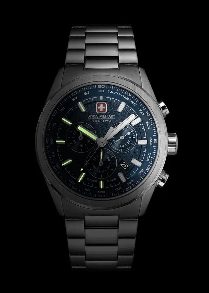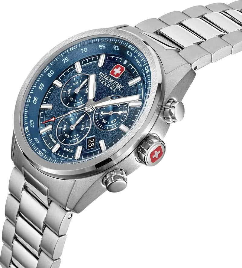 Мужские швейцарские часы Swiss Military Hanowa SMWGI0004205 – это элегантные часы, сочетающие в себе классический дизайн и современную функциональность. Корпус из нержавеющей стали диаметром 43 мм сбалансирован и элегантен. Сапфировое стеклоСапфировое стеклоПрочный и надёжный материал из кристалла сапфира синтетического происхождения, характеризующийся особой твёрдостью и устойчивостью к царапинам и повреждениям. с антибликовым покрытием защищает циферблат от царапин и обеспечивает отличную читаемость при любом освещении. Браслет с раскладной застёжкойРаскладная застёжкаТакой тип застёжки используется только на браслетах из металла. Она никогда не раскрывается полностью, происходит разделение на 2 и более частей. Раскладывающая застёжка снизит вероятность потери часов к минимуму. идеально дополняют дизайн часов, обеспечивая комфортное ношение. Люминесцентное покрытиеЛюминесцентное покрытиеПозволяет считывать показания времени в темноте. Производители наносят на стрелки, часовые индексы, безель или поверхность циферблата светонакопительный состав, дающий холодное свечение. стрелок и меток позволит вам следить за временем даже в полной темноте. Циферблат с точным механизмом хронографаХронографФункция позволяет измерять отрезки времени с особой точностью: часы, минуты, секунды. Верным признаком хронографа является наличие на циферблате 3 дополнительных окошек-счётчиков. и хорошо заметным индикатором даты в положении между 4 и 5 часов. ТахиметрТахиметрРазмеченная шкала, располагается на ободке или безеле часов. Тахиметр позволяет рассчитать скорость на определённом участке пути, расстояние измеряется в километрах или милях. по внешнему краю. Водонепроницаемость до 100 метров хорошо подходят для повседневного ношения и занятий водными видами спорта.