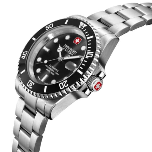 Мужские швейцарские часы Swiss Military Sealord SMWGL0006301 – это элегантные часы, сочетающие в себе классический дизайн и современную функциональность. Корпус из нержавеющей стали диаметром 41 мм сбалансирован и элегантен. Сапфировое стеклоСапфировое стеклоПрочный и надёжный материал из кристалла сапфира синтетического происхождения, характеризующийся особой твёрдостью и устойчивостью к царапинам и повреждениям. с антибликовым покрытием защищает циферблат от царапин и обеспечивает отличную читаемость при любом освещении. Браслет из нержавеющей стали с раскладной застёжкойРаскладная застёжкаТакой тип застёжки используется только на браслетах из металла. Она никогда не раскрывается полностью, происходит разделение на 2 и более частей. Раскладывающая застёжка снизит вероятность потери часов к минимуму. идеально дополняют дизайн часов, обеспечивая комфортное ношение. Люминесцентное покрытиеЛюминесцентное покрытиеПозволяет считывать показания времени в темноте. Производители наносят на стрелки, часовые индексы, безель или поверхность циферблата светонакопительный состав, дающий холодное свечение. стрелок и меток позволит вам следить за временем даже в полной темноте. Вращающийся керамический безельБезельВнешний ободок, закрепляющий стекло. В спортивных часах так называется поворотное кольцо с делениями на циферблате, выполняет роль таймера – замеряет отрезки времени на шкале. Неподвижный безель – элемент декора. Однонаправленно вращающийся безель на дайверских часах позволяет фиксировать моменты погружения и выныривания на поверхность.. Индикатор даты в положении «3 часа». Водонепроницаемость до 200 метров идеально подходят для дайвинга. Автоматический швейцарский механизм Soprod P024, который основан на знаменитом механизме ETA 2824. Эти профессиональные часы для дайвинга швейцарского производства созданы для преодоления трудностей — будь то под водой или в городских джунглях. Будь то деловая встреча, прогулка или спортивные соревнования — Swiss Military Hanowa Sealord Automatic станут идеальным спутником для мужчин