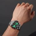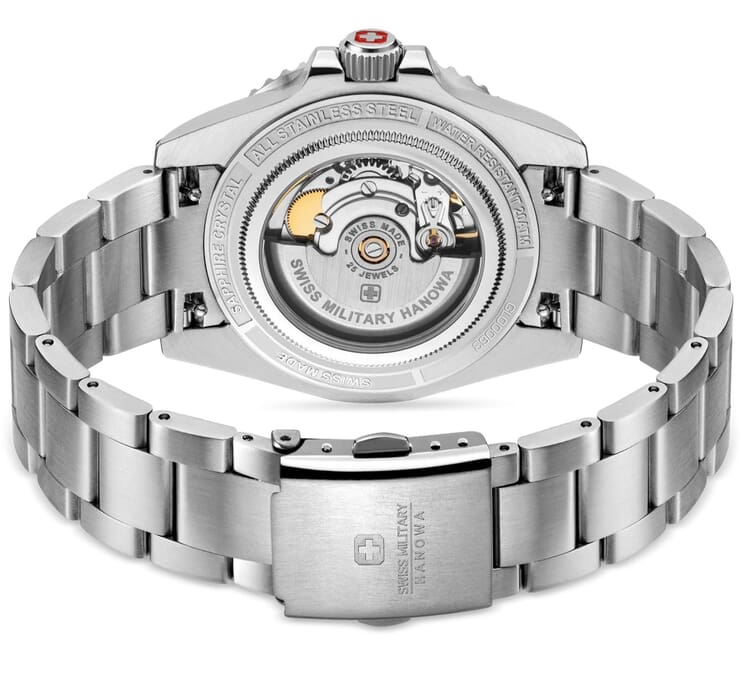 Мужские швейцарские часы Swiss Military Sealord SMWGL0006302 – это великолепные, стильные автоматические часы швейцарского производства, которые идеально подходят для дайвинга. Корпус из нержавеющей стали диаметром 41 мм сбалансирован и элегантен. Сапфировое стеклоСапфировое стеклоПрочный и надёжный материал из кристалла сапфира синтетического происхождения, характеризующийся особой твёрдостью и устойчивостью к царапинам и повреждениям. с антибликовым покрытием защищает циферблат от царапин и обеспечивает отличную читаемость при любом освещении. Браслет из нержавеющей стали с раскладной застёжкойРаскладная застёжкаТакой тип застёжки используется только на браслетах из металла. Она никогда не раскрывается полностью, происходит разделение на 2 и более частей. Раскладывающая застёжка снизит вероятность потери часов к минимуму. идеально дополняют дизайн часов, обеспечивая комфортное ношение. Люминесцентное покрытиеЛюминесцентное покрытиеПозволяет считывать показания времени в темноте. Производители наносят на стрелки, часовые индексы, безель или поверхность циферблата светонакопительный состав, дающий холодное свечение. стрелок и меток позволит вам следить за временем даже в полной темноте. Вращающийся керамический безельБезельВнешний ободок, закрепляющий стекло. В спортивных часах так называется поворотное кольцо с делениями на циферблате, выполняет роль таймера – замеряет отрезки времени на шкале. Неподвижный безель – элемент декора. Однонаправленно вращающийся безель на дайверских часах позволяет фиксировать моменты погружения и выныривания на поверхность.. Индикатор даты в положении «3 часа». Водонепроницаемость до 200 метров идеально подходят для дайвинга. Автоматический швейцарский механизм Soprod P024, который основан на знаменитом механизме ETA 2824.