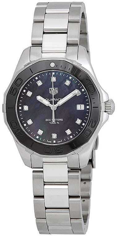 TAG Heuer Aquaracer WAY131M.BA0748 — элегантные женские часы, сочетающие стиль и функциональность. Корпус диаметром 35 мм и толщиной 10,75 мм выполнен из полированной нержавеющей стали, обеспечивая долговечность и устойчивость к коррозии. Лакированный циферблат оснащён накладными часовыми метками и стрелками с люминесцентным покрытиемЛюминесцентное покрытиеПозволяет считывать показания времени в темноте. Производители наносят на стрелки, часовые индексы, безель или поверхность циферблата светонакопительный состав, дающий холодное свечение., обеспечивающим отличную читаемость в любых условиях освещения. Его поверхность защищена сапфировым стекломСапфировое стеклоПрочный и надёжный материал из кристалла сапфира синтетического происхождения, характеризующийся особой твёрдостью и устойчивостью к царапинам и повреждениям., устойчивым к царапинам. Циферблат украшен 11 бриллиантами. Часы оснащены точным кварцевым механизмом, обеспечивающим стабильное отображение времени. Функциональность включает индикацию часов, минут, секунд и даты, расположенной на отметке «3 часа». БезельБезельВнешний ободок, закрепляющий стекло. В спортивных часах так называется поворотное кольцо с делениями на циферблате, выполняет роль таймера – замеряет отрезки времени на шкале. Неподвижный безель – элемент декора. Однонаправленно вращающийся безель на дайверских часах позволяет фиксировать моменты погружения и выныривания на поверхность. однонаправленный вращающийся, выполнен из стали, устойчивой к царапинам. Водозащита до 300 метров (30 бар) делает модель подходящей для дайвинга и активного образа жизни. Стальной браслет на раскладной застёжкеРаскладная застёжкаТакой тип застёжки используется только на браслетах из металла. Она никогда не раскрывается полностью, происходит разделение на 2 и более частей. Раскладывающая застёжка снизит вероятность потери часов к минимуму..