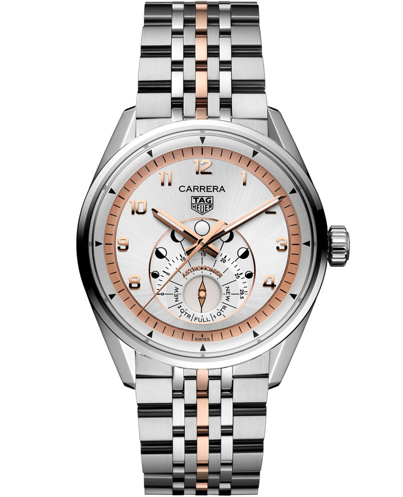 Часы TAG Heuer Carrera Astronomer WBX2111.BD0002 созданы для стильных мужчин. Механический механизм (автоматический калибр) с высокой точностью и с 50-часовым запасом хода. Сапфировое стеклоСапфировое стеклоПрочный и надёжный материал из кристалла сапфира синтетического происхождения, характеризующийся особой твёрдостью и устойчивостью к царапинам и повреждениям. устойчивое к появлению царапин, обладающее высокой прозрачностью. Класс водозащиты: 100 метров, позволит плавать, нырять и заниматься другими водными видами спорта.  Стрелки с люминесцентным покрытиемЛюминесцентное покрытиеПозволяет считывать показания времени в темноте. Производители наносят на стрелки, часовые индексы, безель или поверхность циферблата светонакопительный состав, дающий холодное свечение. позволяют легко считывать время даже в условиях недостаточного освещения. Завинчивающаяся задняя крышка украшена специальной гравировкой с изображением обсерватории и звёздного неба. По центру, у отметки «6 часов», расположен серебристый диск указателя фаз Луны, обрамлённый оригинальной шкалой, которая позволяет визуально следить за ходом лунного цикла. Часы оснащены браслетом из нержавеющей стали с 18-ти каратным золотом 5N и с застёжкой-бабочка с кнопкамиЗастёжка "бабочка"Такой вид застёжки дополняется предохранителями, помогающими избежать случайного раскрытия браслета. Обладают изящным исполнением. , которые гарантируют комфортную посадку на запястье. Модель выпущена ограниченной серией 500 экземпляров. TAG Heuer Carrera олицетворяет непринужденную элегантность и представляет свежий взгляд на настоящую классику.