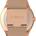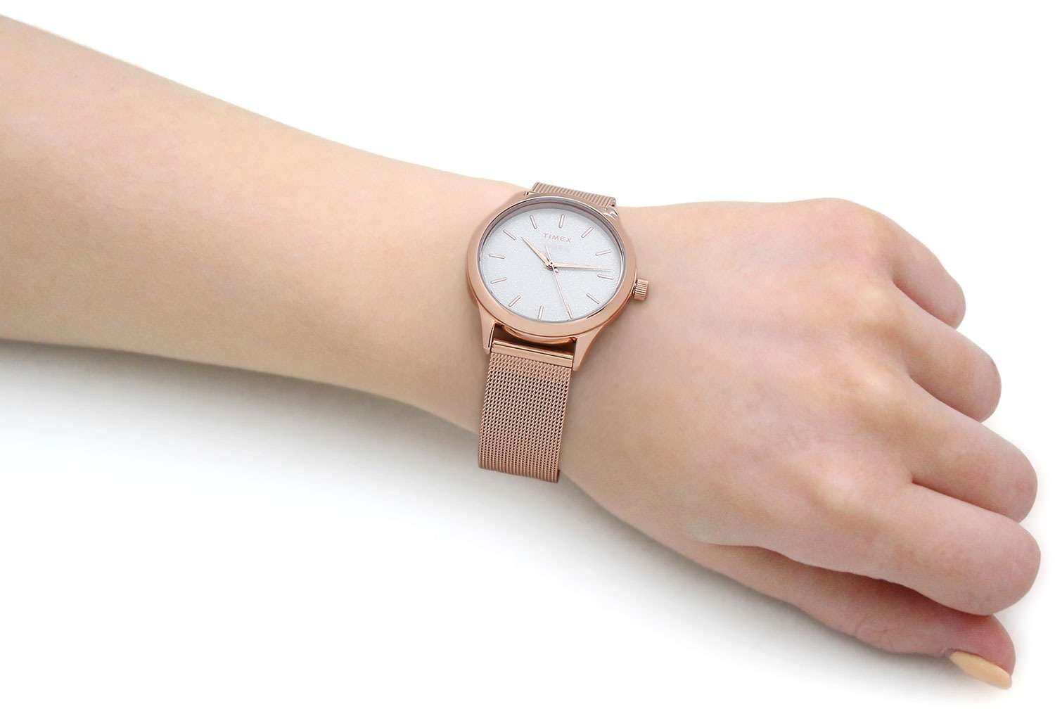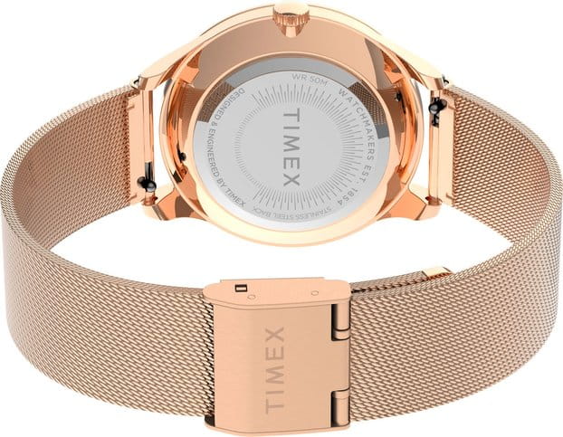 Наручные часы Timex TW2V01400 — это изысканный аксессуар, который станет завершающим штрихом в образе современной амбициозной девушки с утонченным вкусом. Эта модель из США сочетает в себе стиль и функциональность, предлагая кварцевый механизм для надежной точности. Корпус часов выполнен из латуни с розовым PVDPVDУльтратонкое покрытие наносится в технике вакуумного напыления, сочетает в себе нитрид титана особой прочности со слоем золота или оксида хрома. Несёт в себе декоративную или защитную функцию. покрытием, придающим изделию элегантность и современный вид. Серебристый циферблат с эффектом Glitter украшен узкими клиновидными стрелками в стиле Dauphine и метками в виде штрихов, что обеспечивает легкость считывания времени. Рифленая заводная головка добавляет утонченности и завершенности дизайну. Стальной миланский браслет с розовым PVDPVDУльтратонкое покрытие наносится в технике вакуумного напыления, сочетает в себе нитрид титана особой прочности со слоем золота или оксида хрома. Несёт в себе декоративную или защитную функцию. покрытием не только удобен, но и надежен благодаря регулируемом раскладном замкеРаскладной замокДанный вариант застежки используется только на часах с металлическим браслетом. Отличительная особенность такого крепления в том, что длина браслета становится универсальной и вы можете самостоятельно отрегулировать нужный вам размер – застежка просто двигается по браслету часов., который обеспечивает комфортную посадку на запястье. Водозащита 50WR делает часы устойчивыми к влаге, что позволяет использовать их в различных условиях. Минеральное стеклоМинеральное стеклоМинеральное стекло представляет собой искусственно выращенный минерал кварца. Такое стекло отличается особой устойчивостью к повреждениям и царапинам. Уступает по некоторым качествам сапфировому стеклу. защищает циферблат от царапин и повреждений, сохраняя его первоначальный вид. Диаметр корпуса составляет 32 мм, а ширина браслета — 16 мм, что делает часы изящными и подходящими для любого случая.